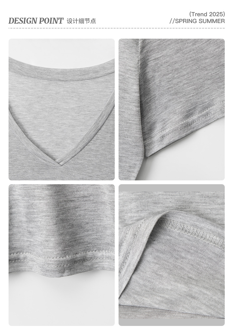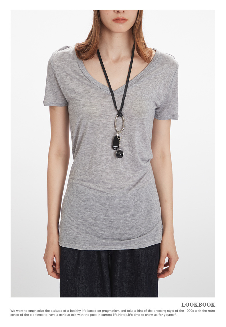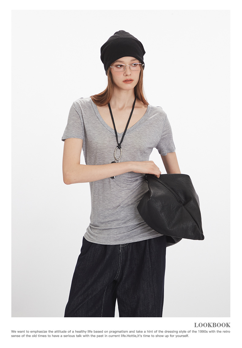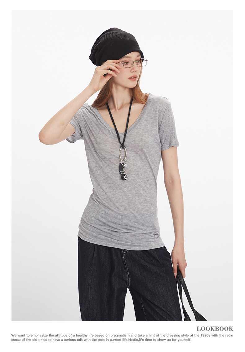 HeyHenry Lyocell 얇은 통기성 V 넥 슬림 반팔 티셔츠 여성 2025 여름 오른쪽 어깨 슬리밍 탑