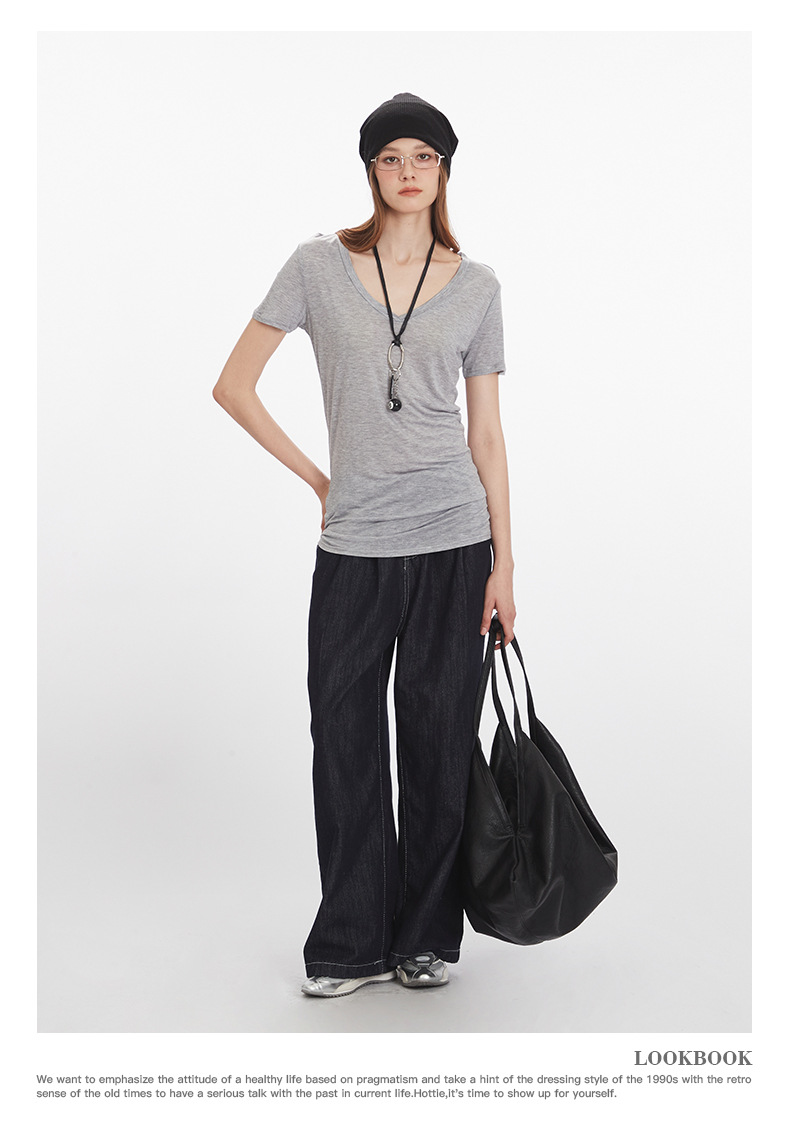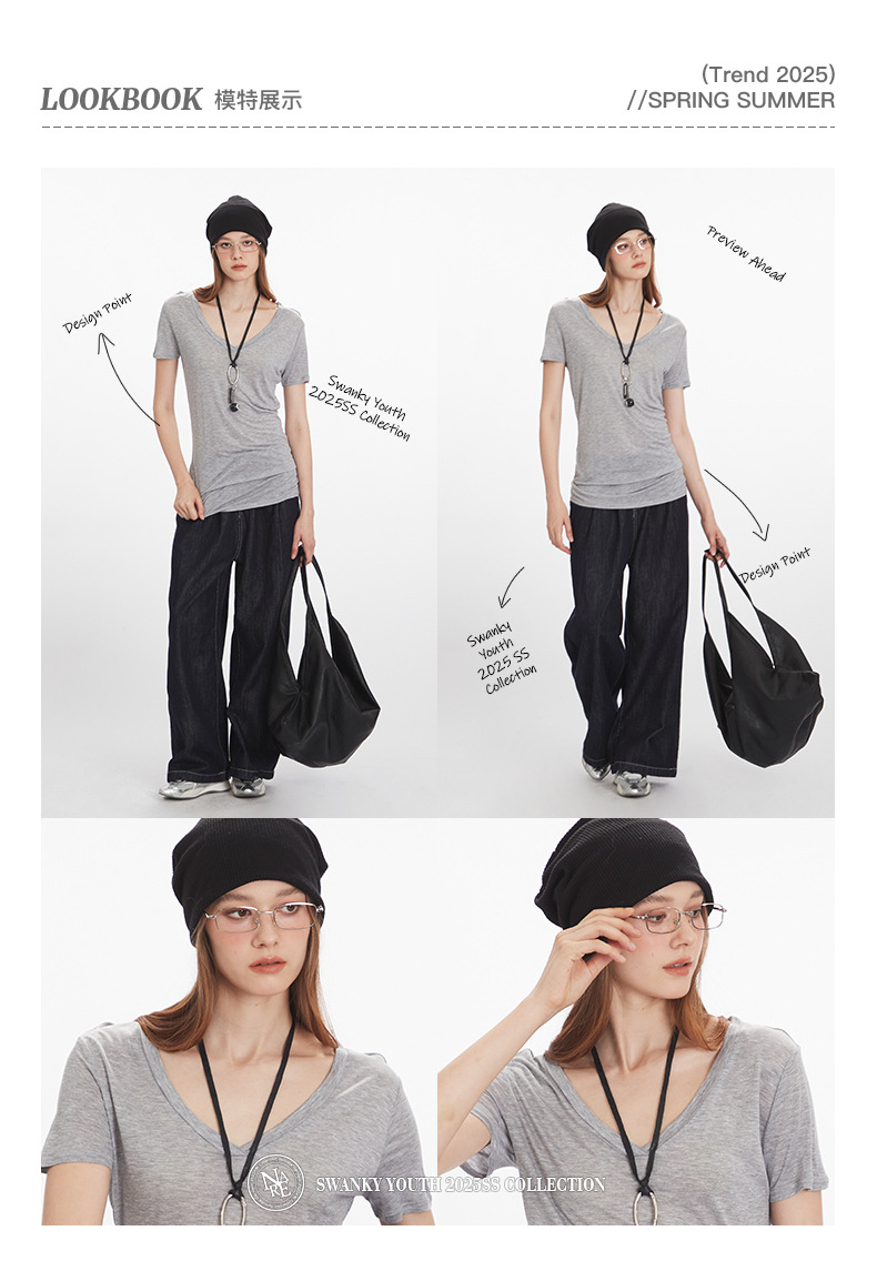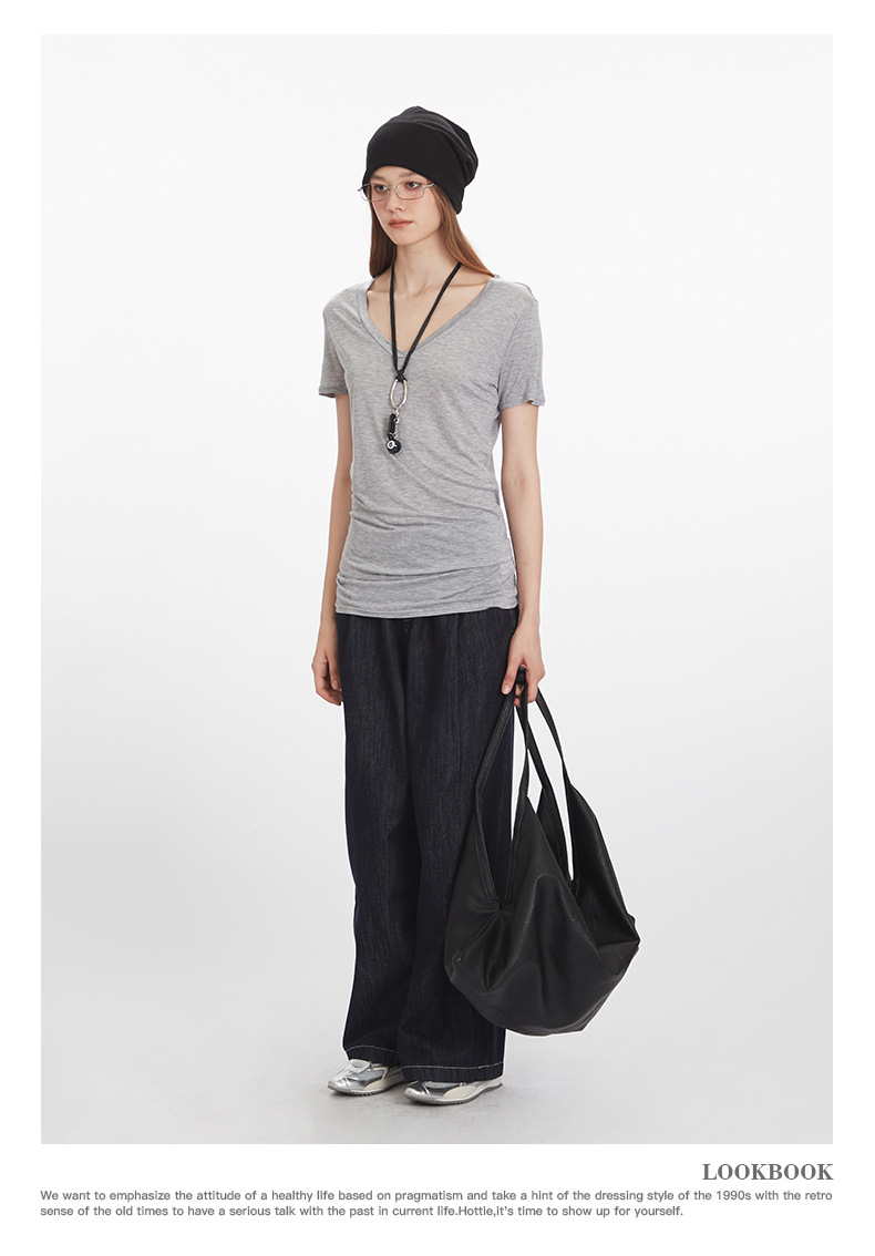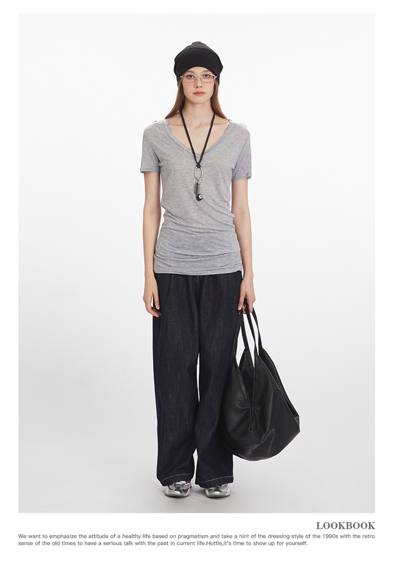 HeyHenry Lyocell 얇은 통기성 V 넥 슬림 반팔 티셔츠 여성 2025 여름 오른쪽 어깨 슬리밍 탑