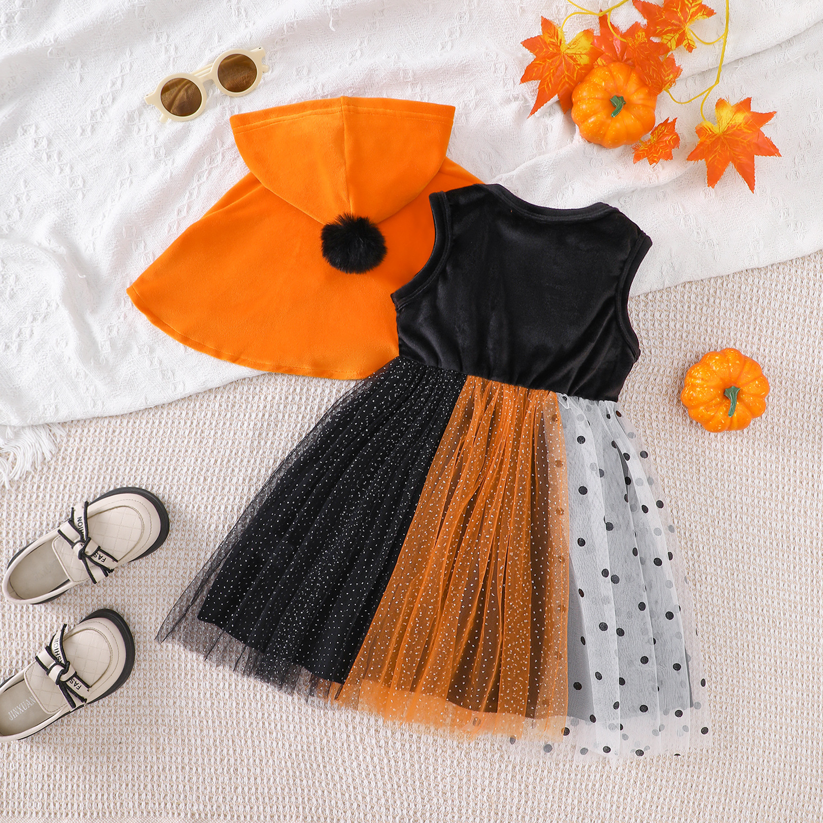 할로윈 아동복 2025 새로운 스타일 중소형 소녀 휴일 드레스 세트 폴카 도트 메쉬 스커트와 망토 투피스 세트스토어 가기