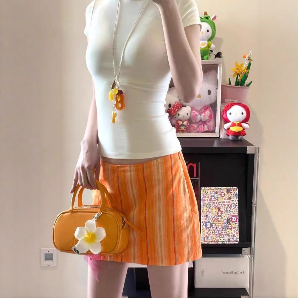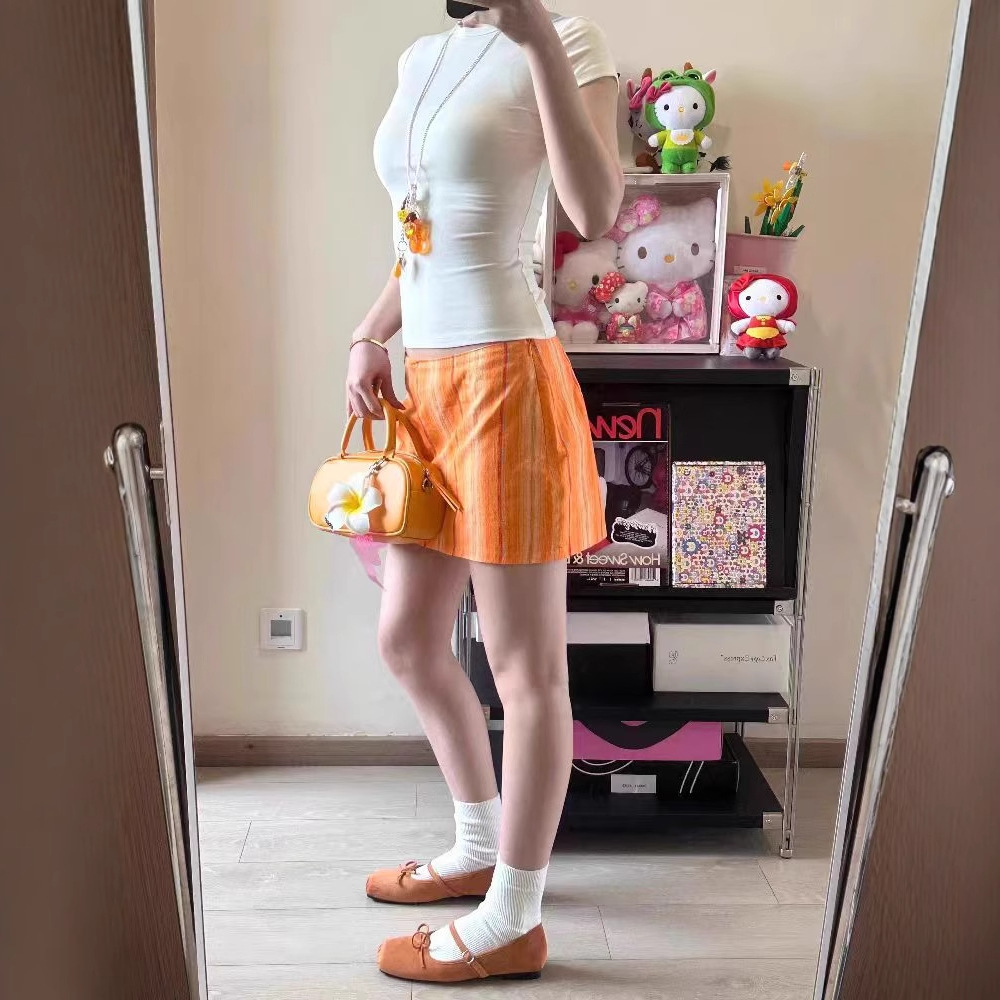 레트로 오렌지 체크 무늬 100 순면 세로 스트립 프린트 슬리밍 스커트와 안전 바지스토어 가기
