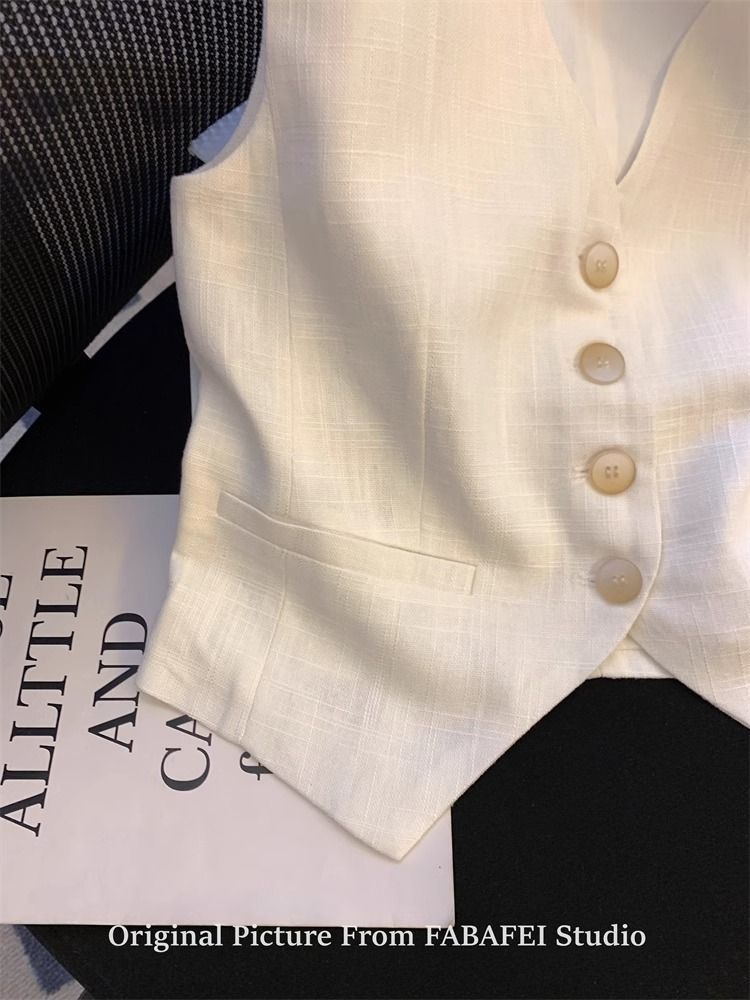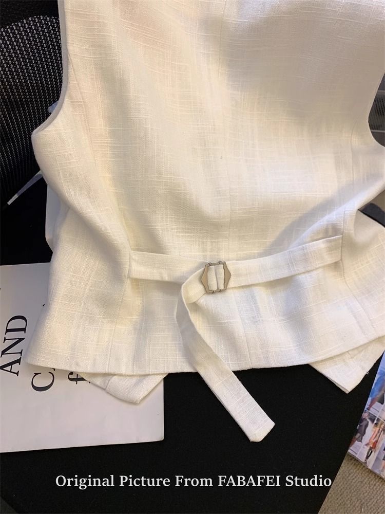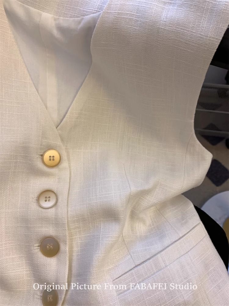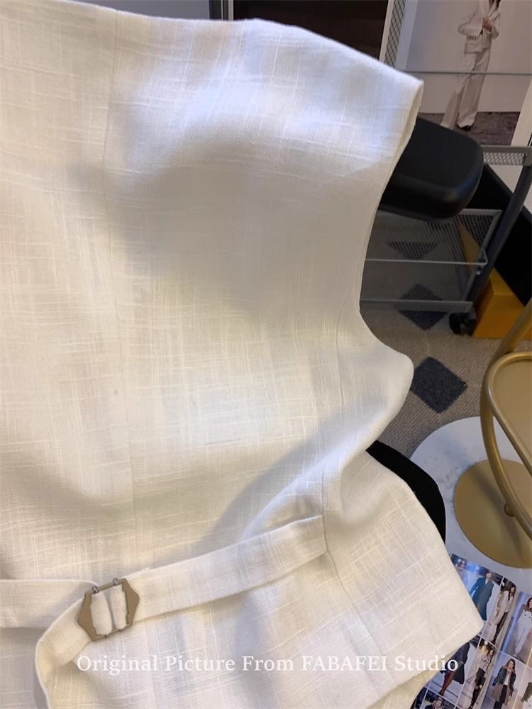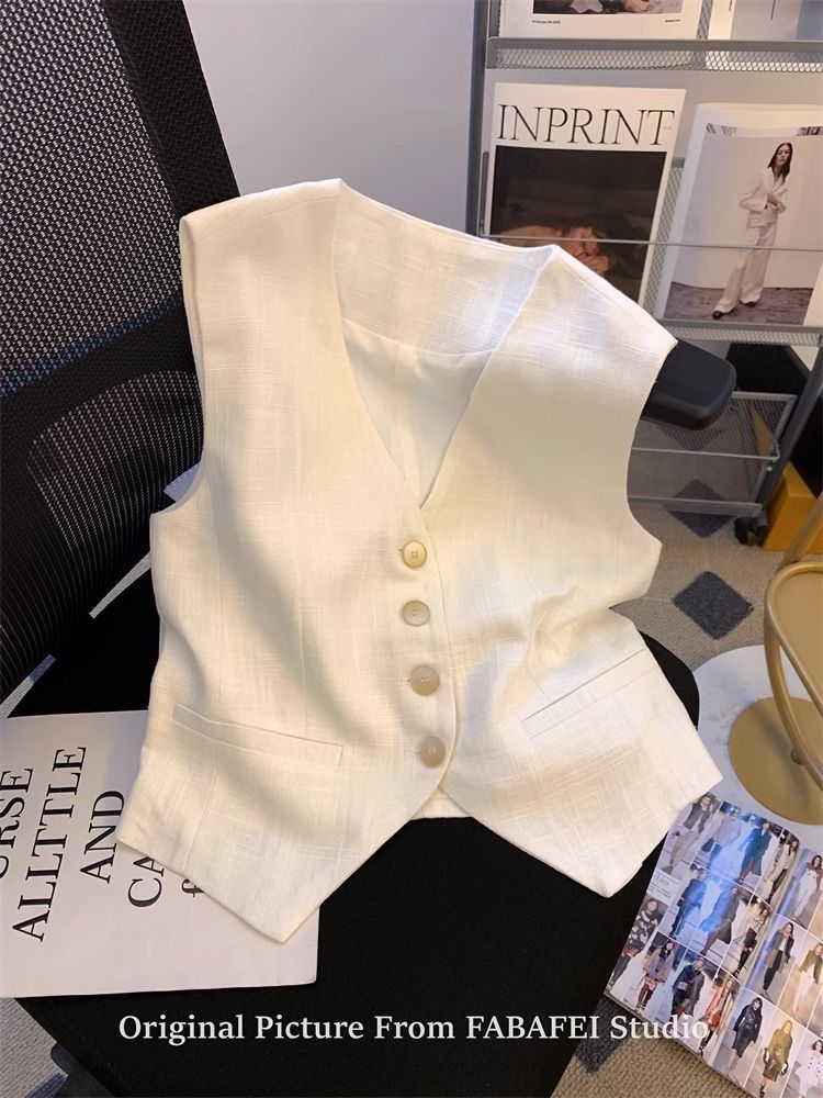 올드 머니 스타일 화이트 린넨 v 넥 조끼 여성 여름 프렌치 v 넥 민소매 정장 세련된 어깨 탑스토어 가기