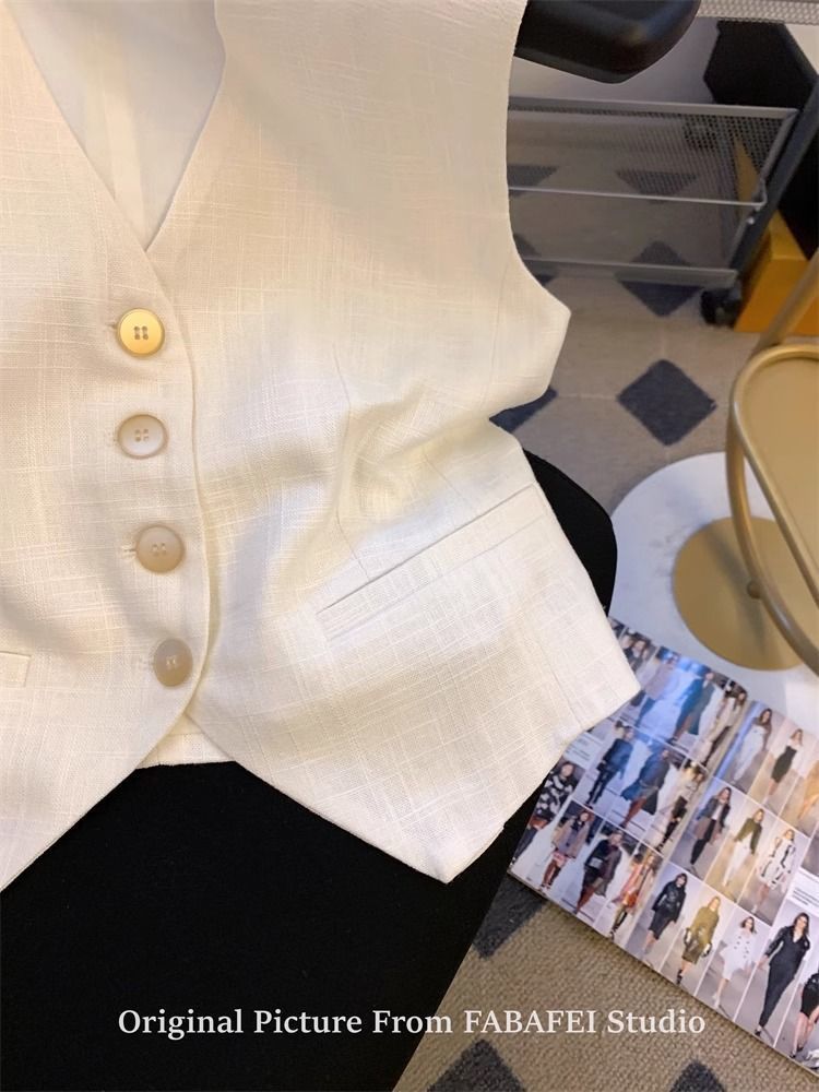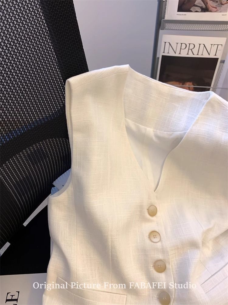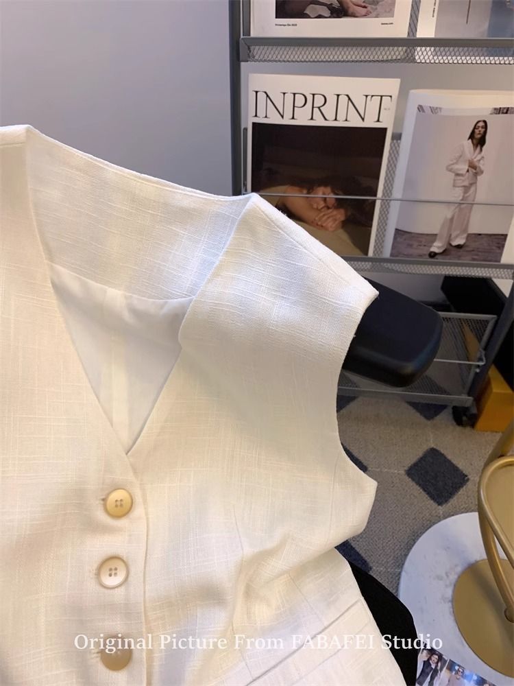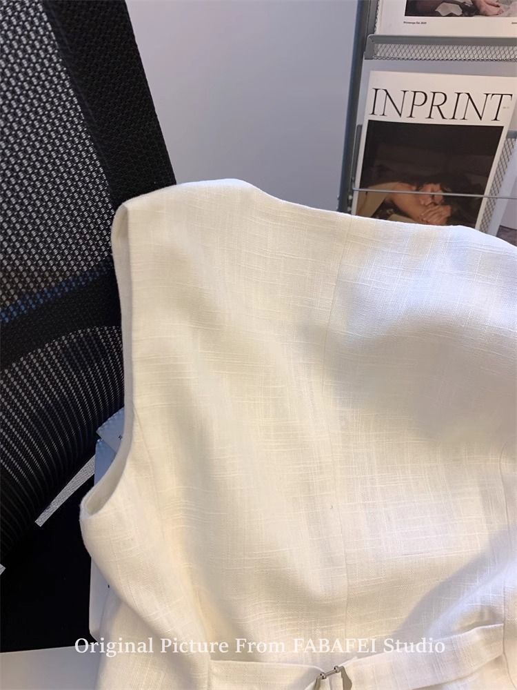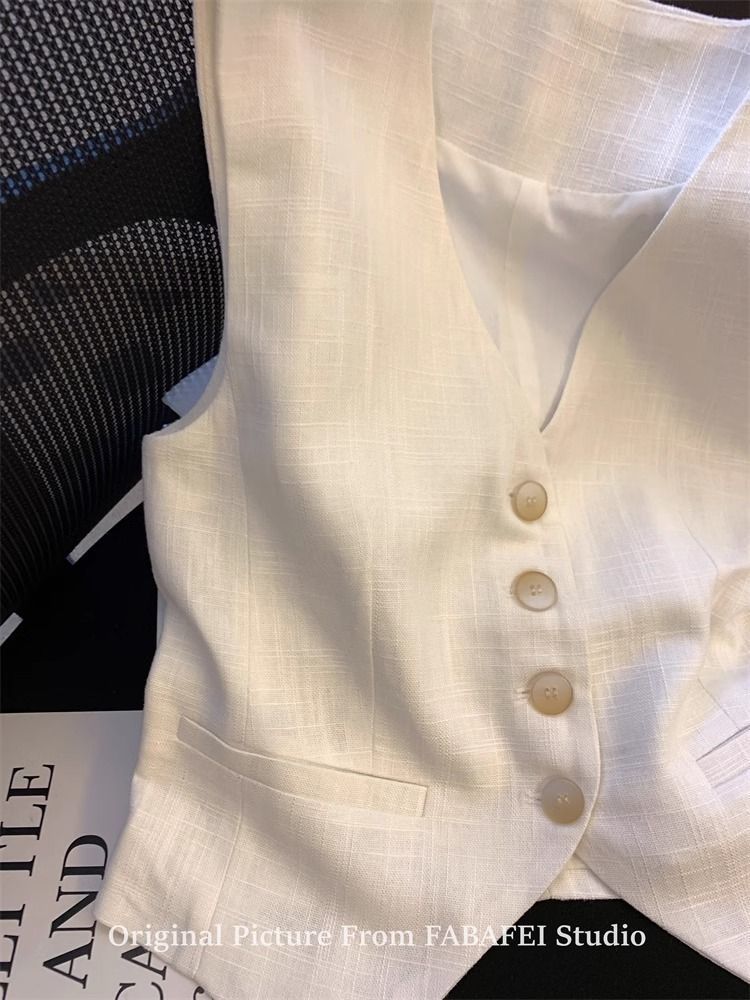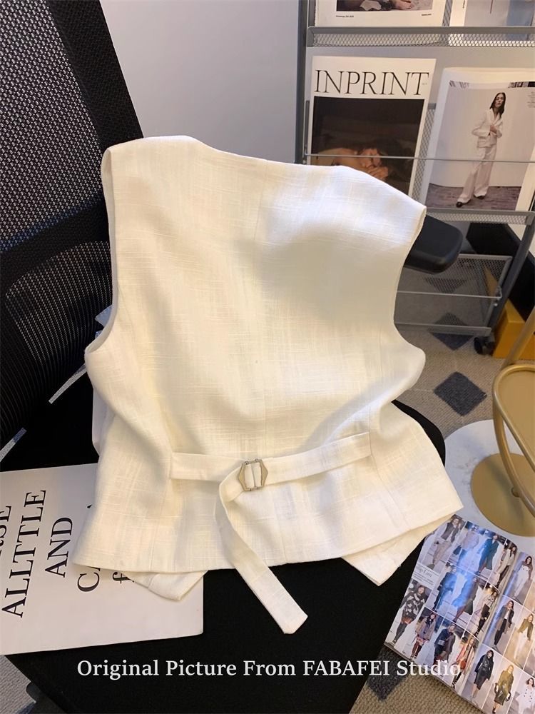올드 머니 스타일 화이트 린넨 v 넥 조끼 여성 여름 프렌치 v 넥 민소매 정장 세련된 어깨 탑스토어 가기