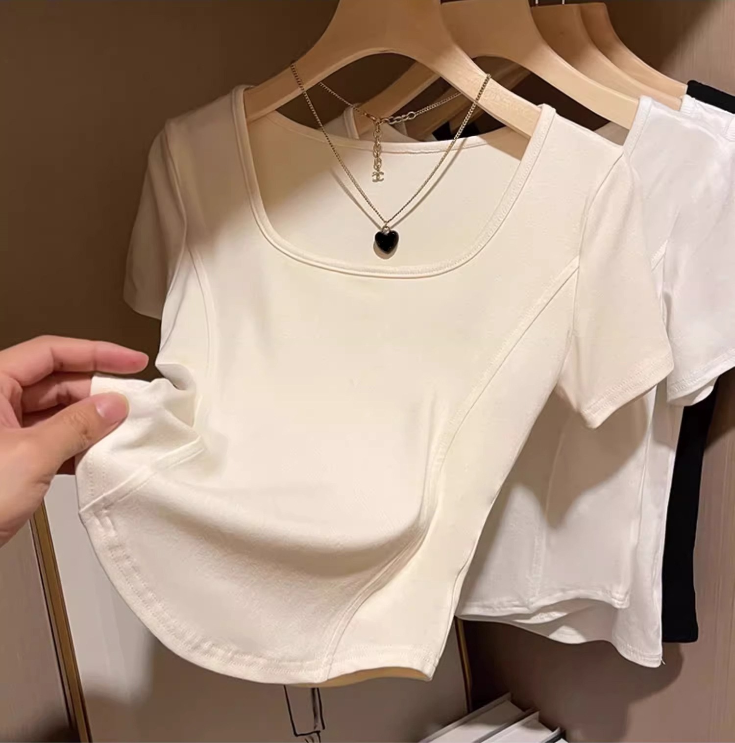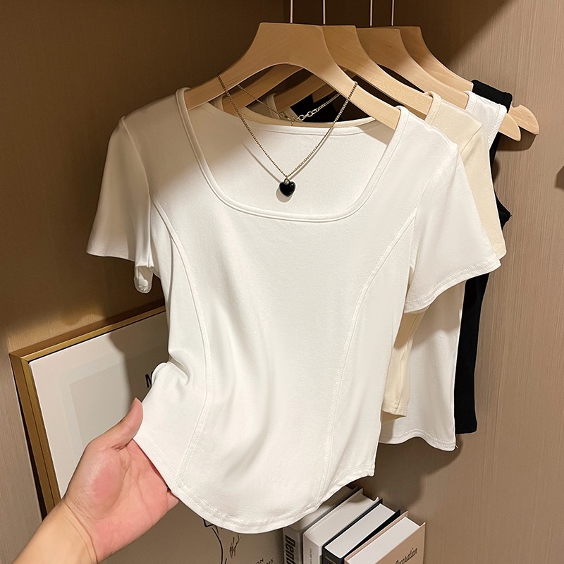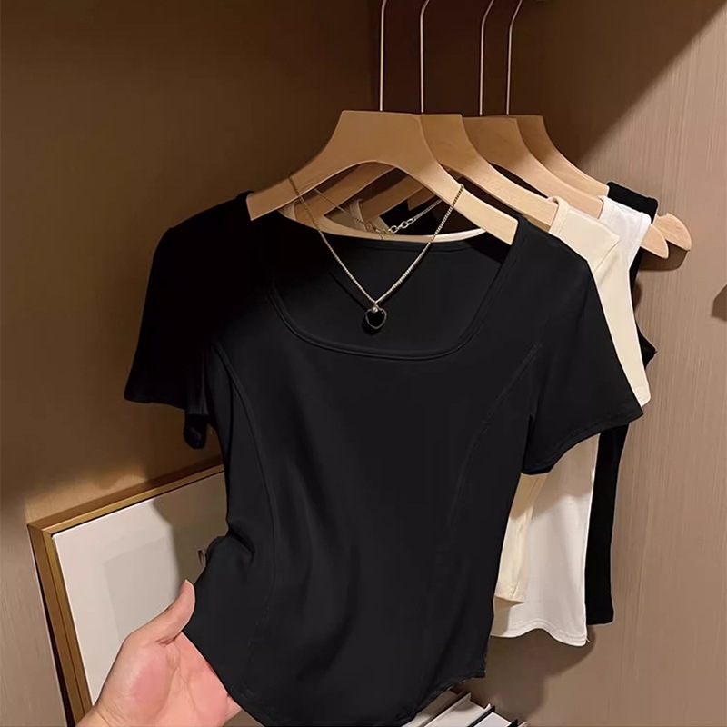 여성을위한 피쉬본 디자인 오른쪽 어깨 반팔 티셔츠 2025 여름 새로운 슬림 피트 핫 소녀 짧은 스퀘어 넥 탑스토어 가기