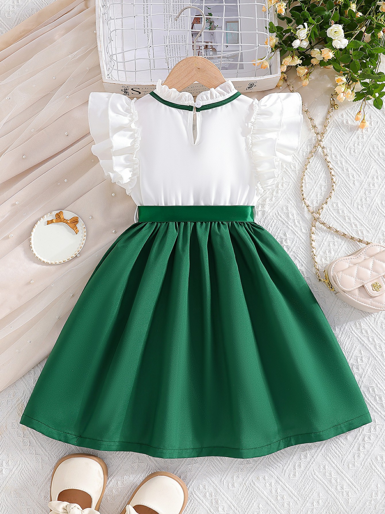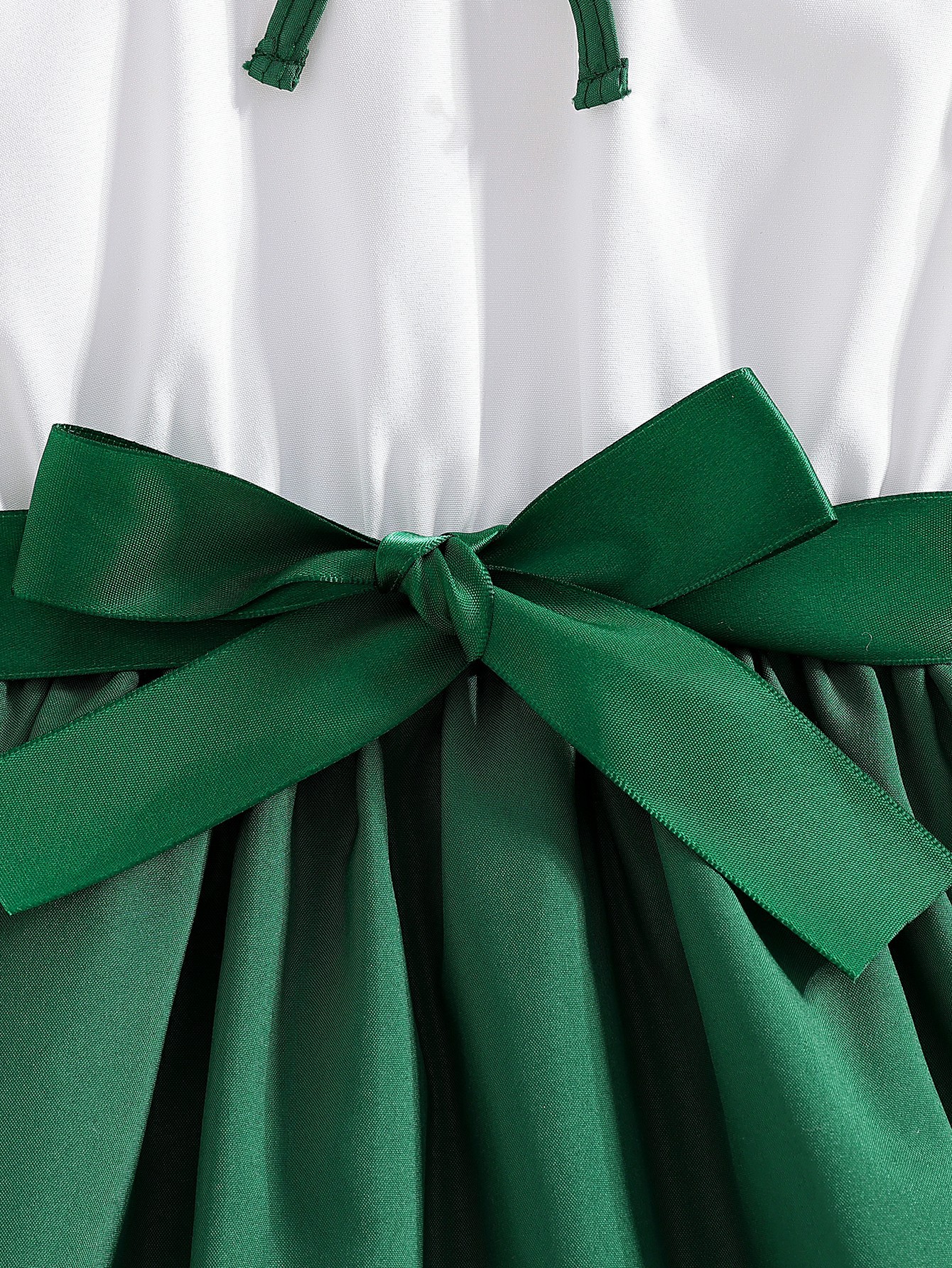 LS00091 크로스보더 소녀 아동복 도매 맞춤형 대비 색상 플라잉 슬리브 보우 드레스(벨트 포함)