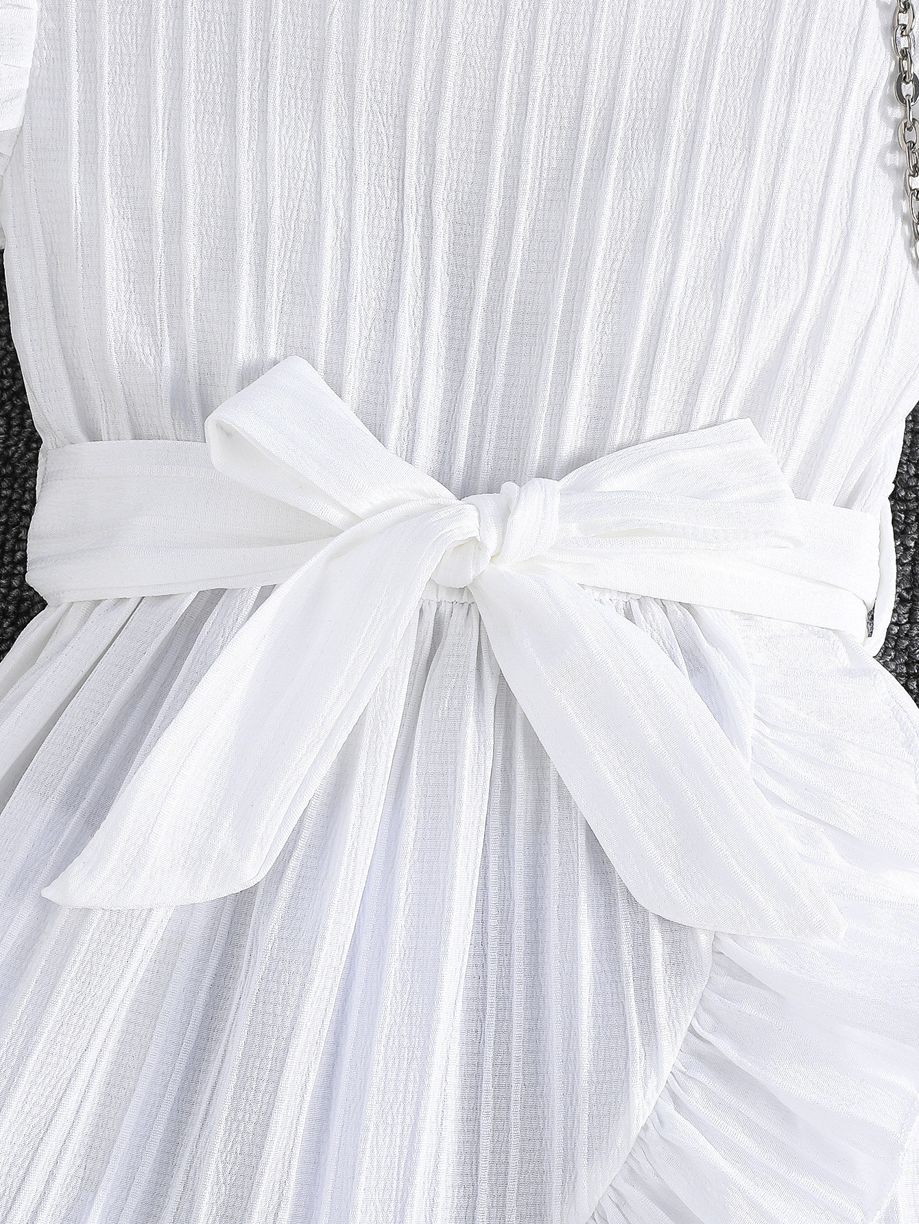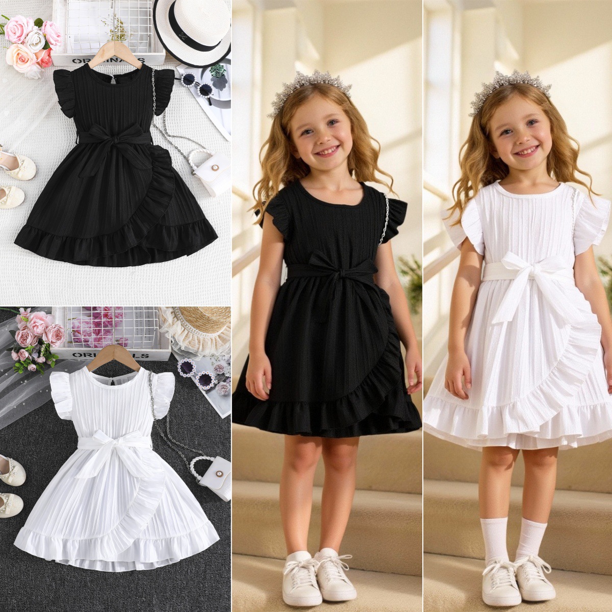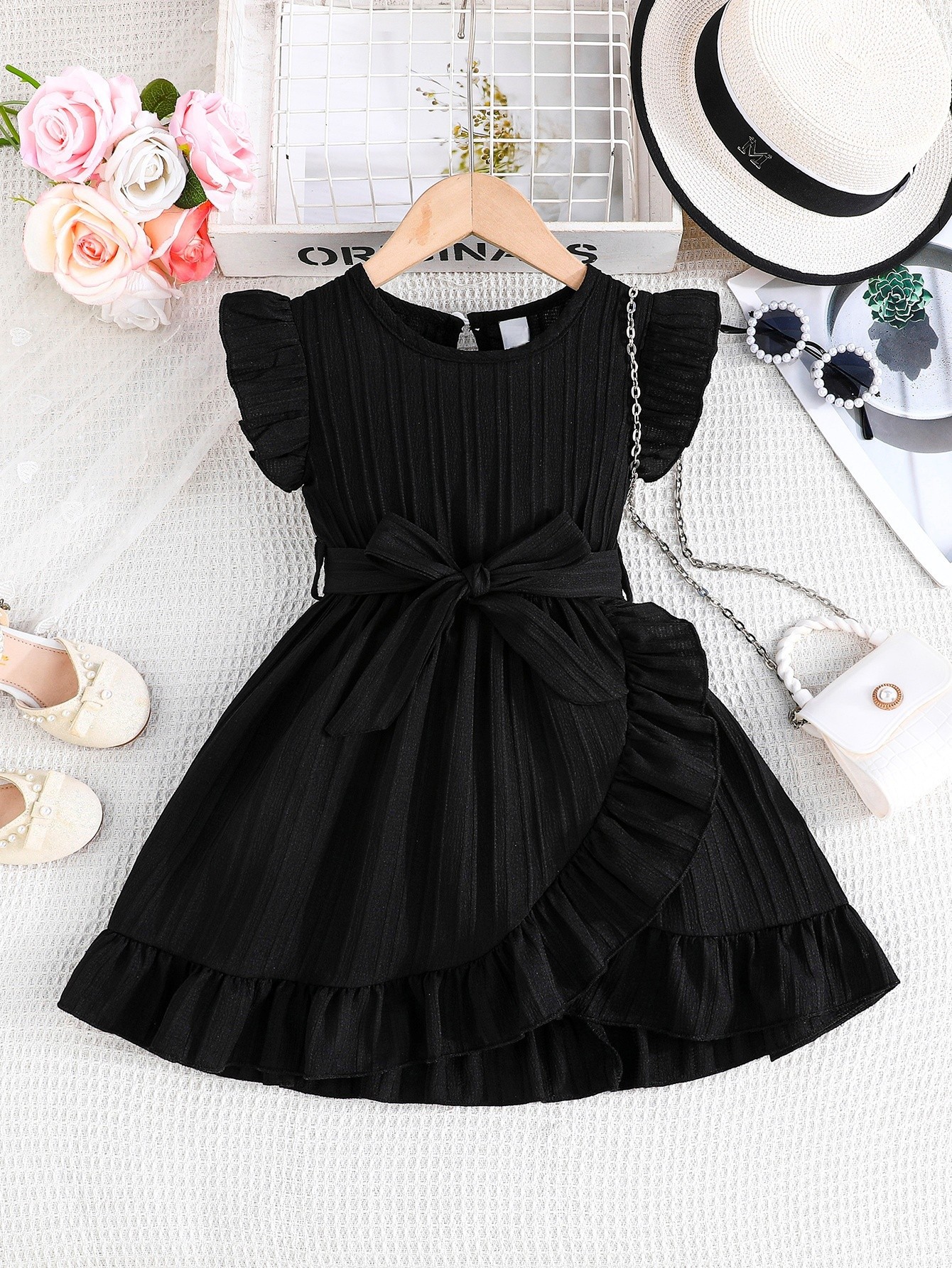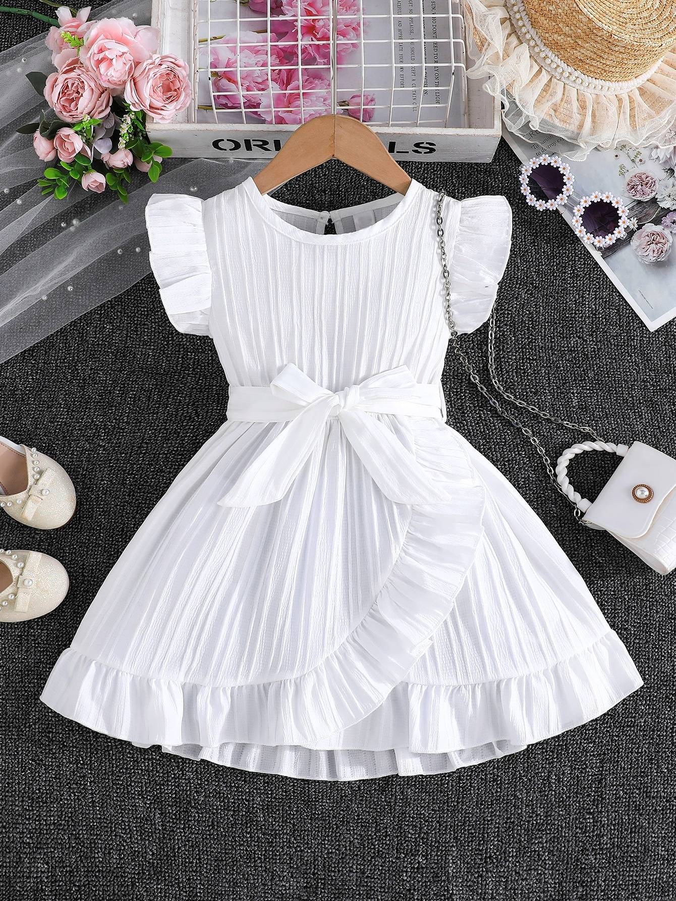 국경 간 아동 의류 여름 소녀의 웨이브 스트립 플라잉 슬리브 라운드 넥 프릴 벨트 세련된 드레스스토어 가기
