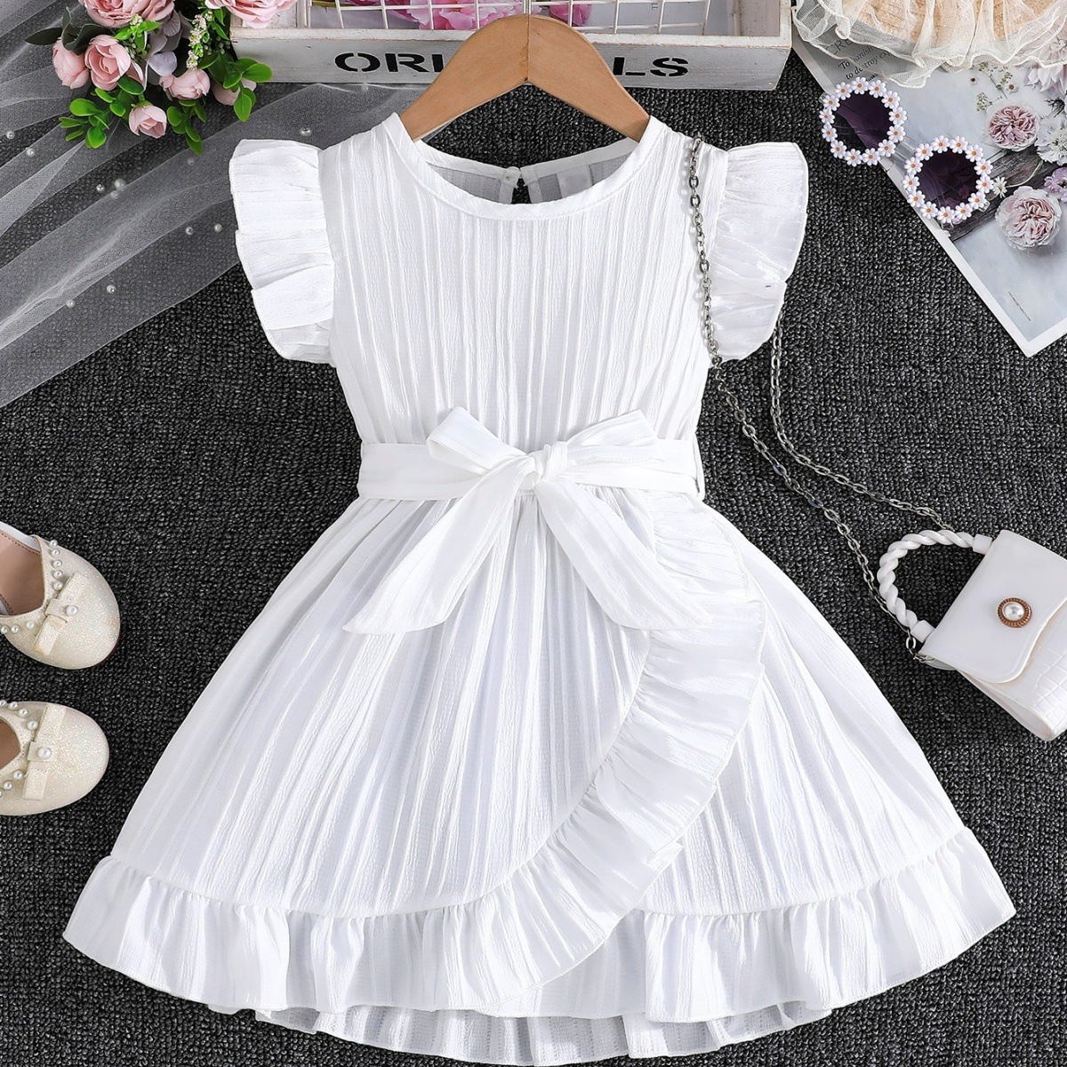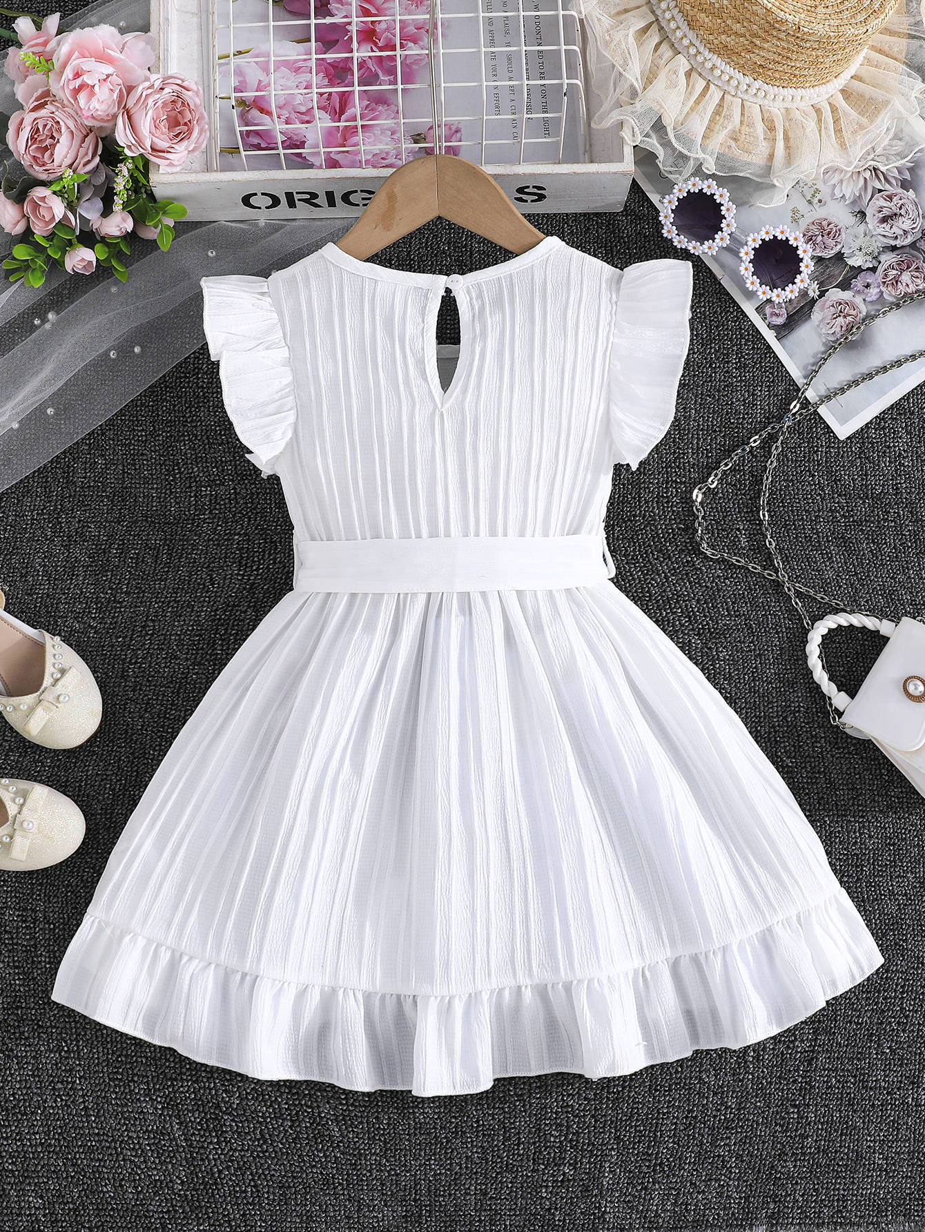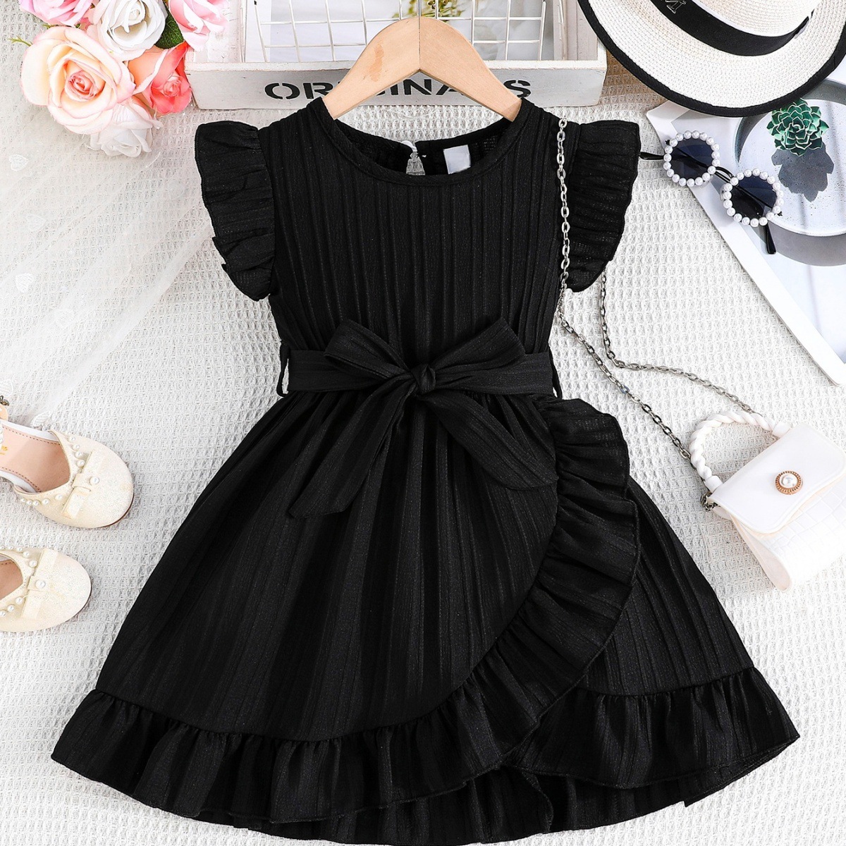 국경 간 아동 의류 여름 소녀의 웨이브 스트립 플라잉 슬리브 라운드 넥 프릴 벨트 세련된 드레스