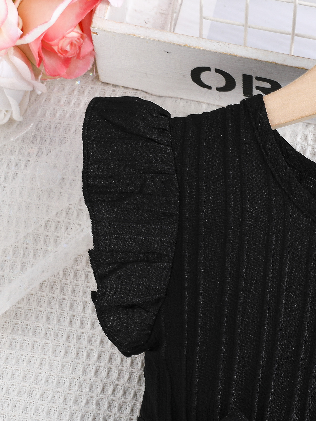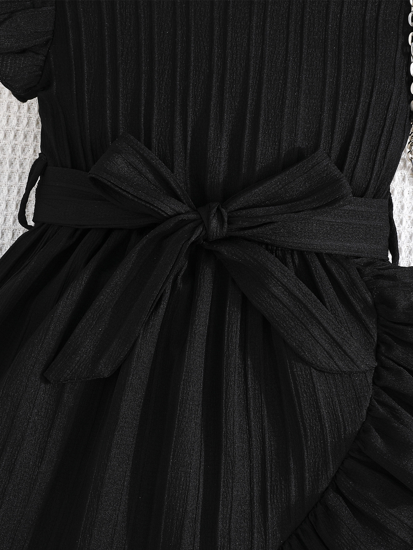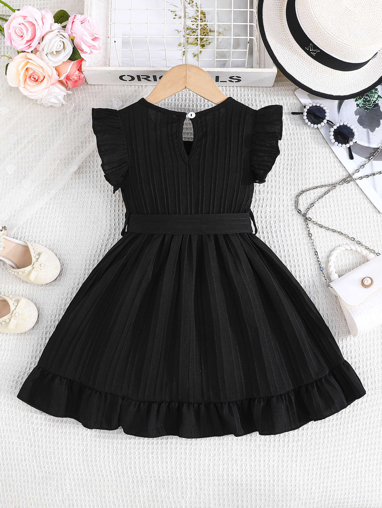 국경 간 아동 의류 여름 소녀의 웨이브 스트립 플라잉 슬리브 라운드 넥 프릴 벨트 세련된 드레스