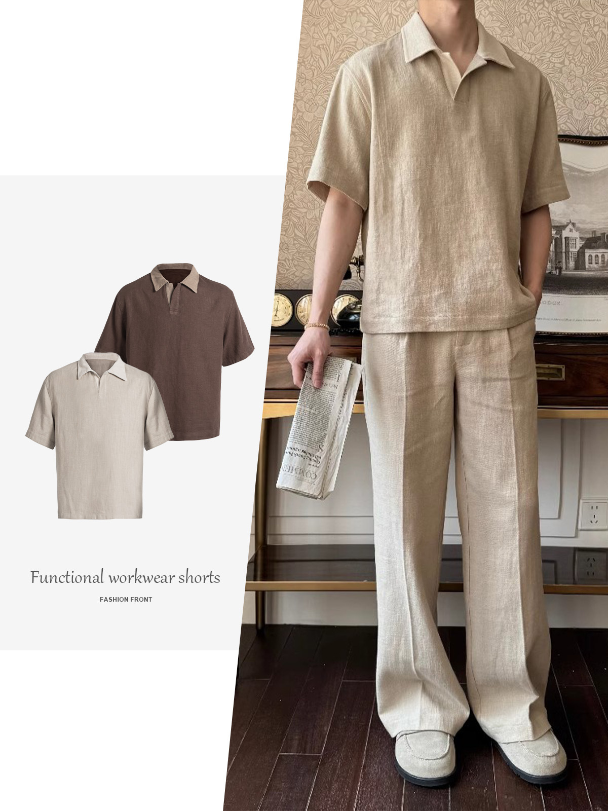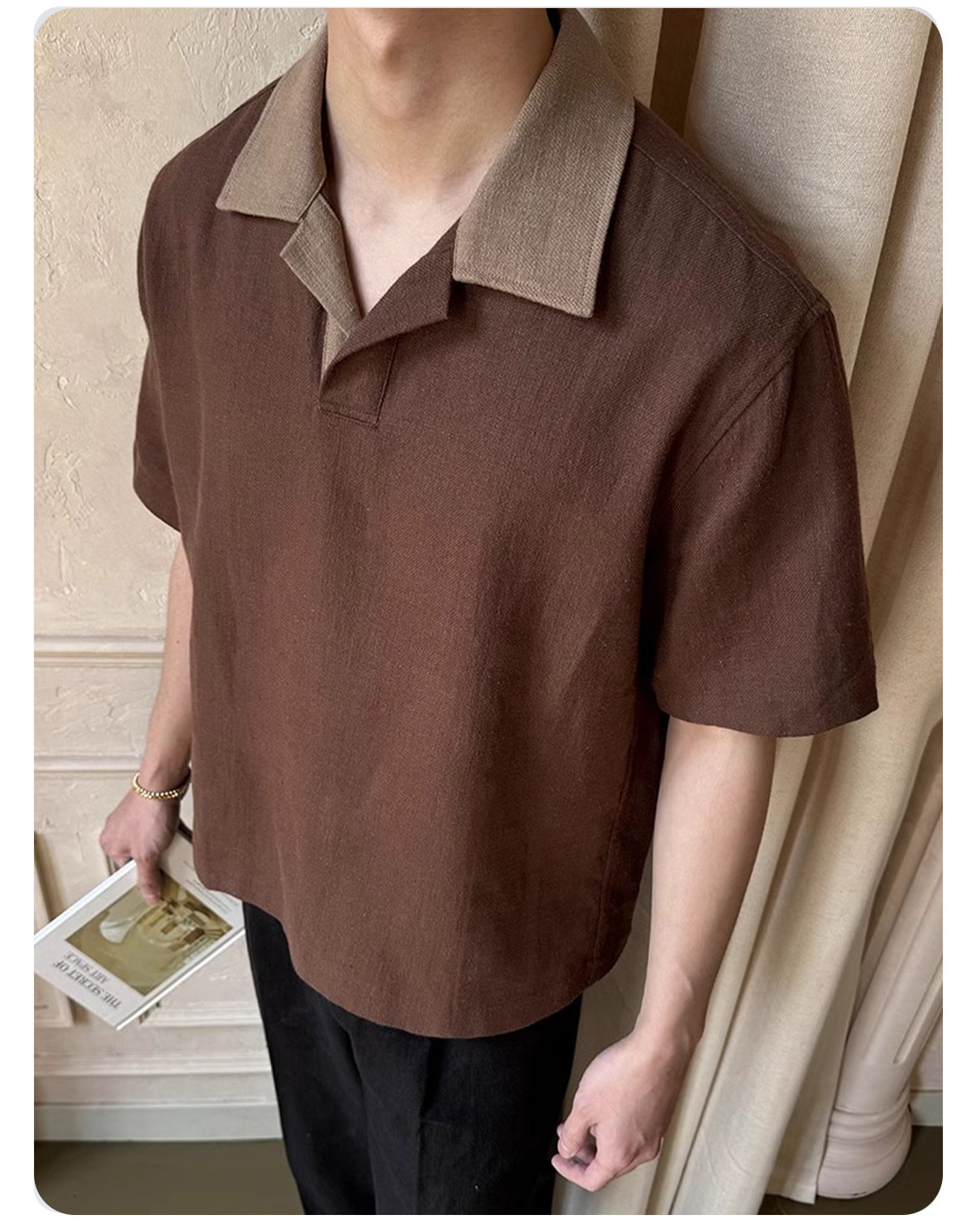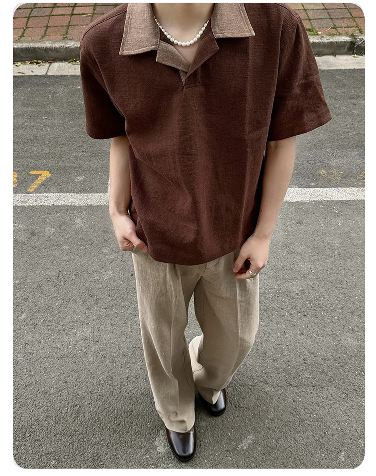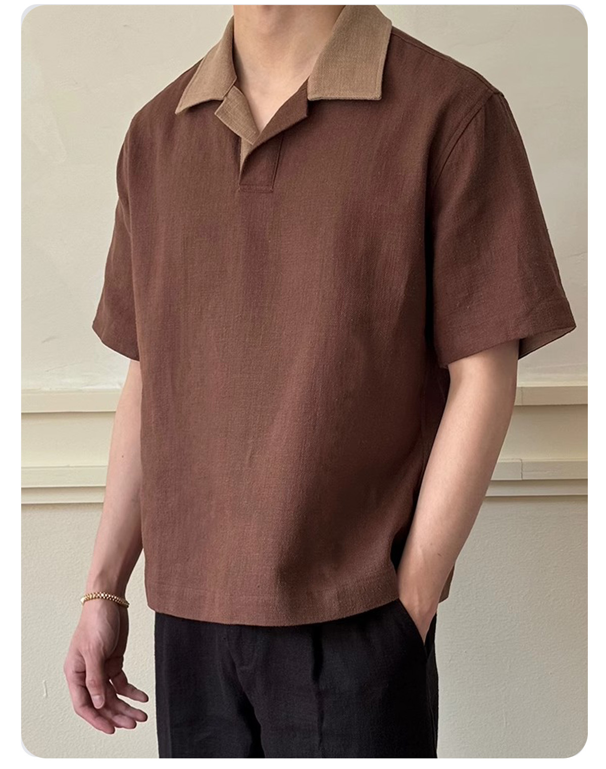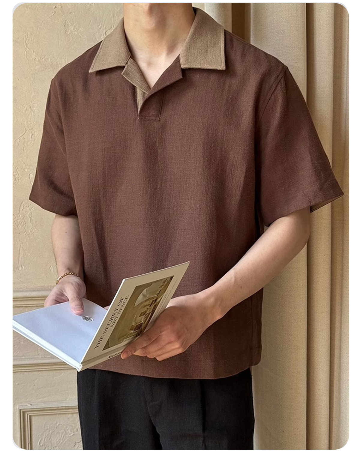 【CSMY】DESERTO 70 린넨 혼방 코튼 및 린넨 대비 컬러 폴로 칼라 캐주얼 올드 머니 스타일 남성용 반팔 셔츠