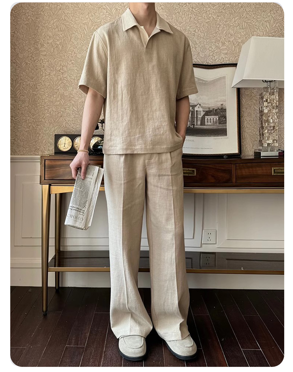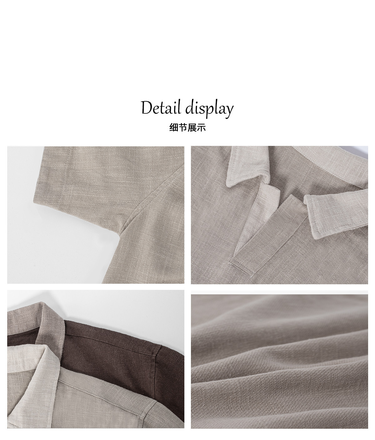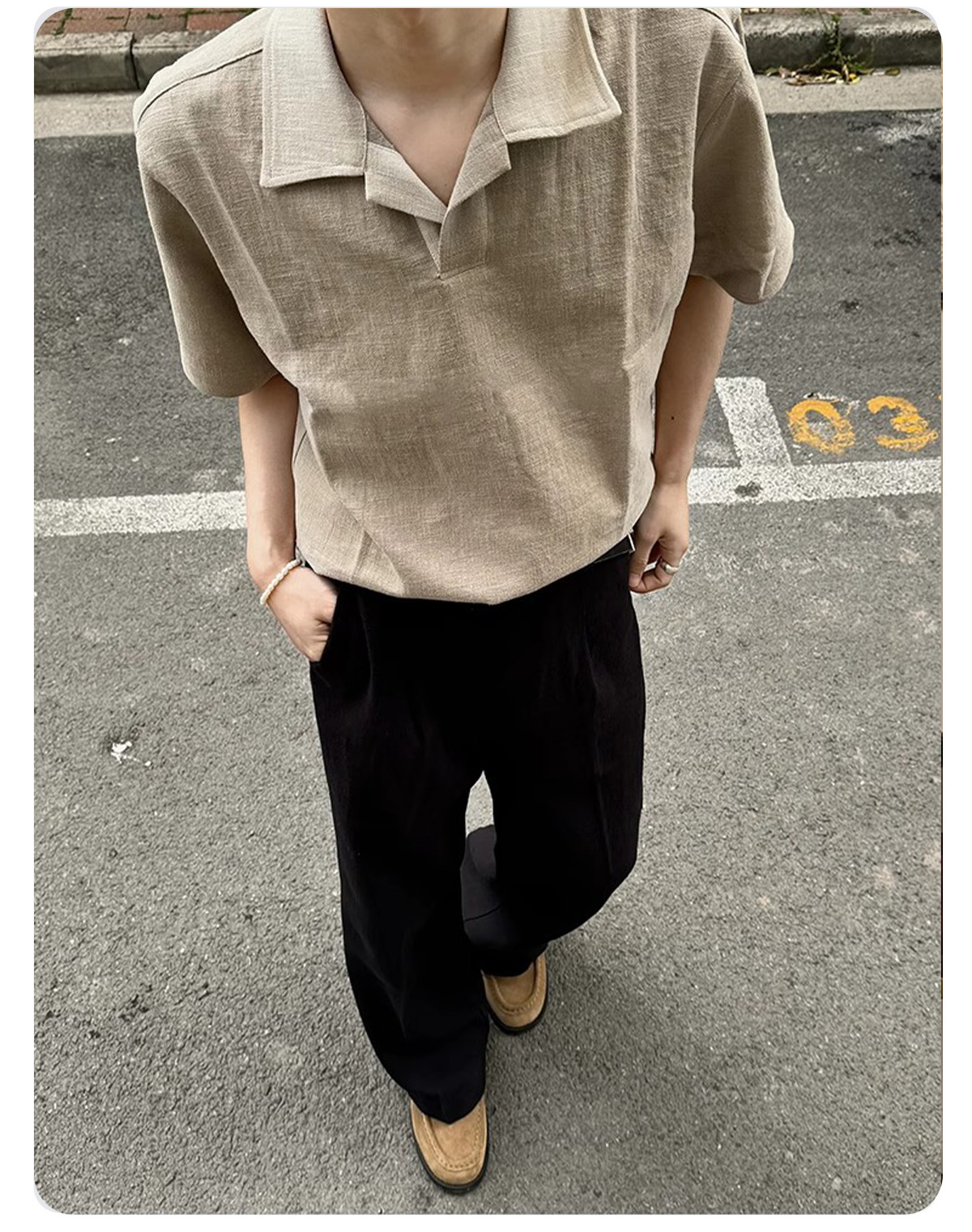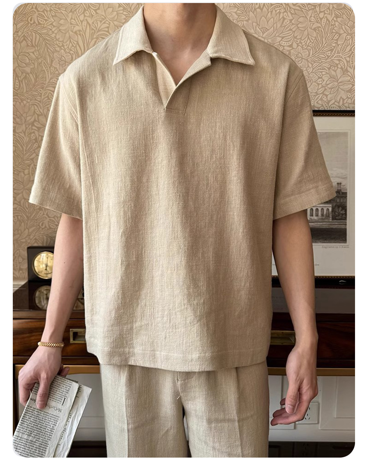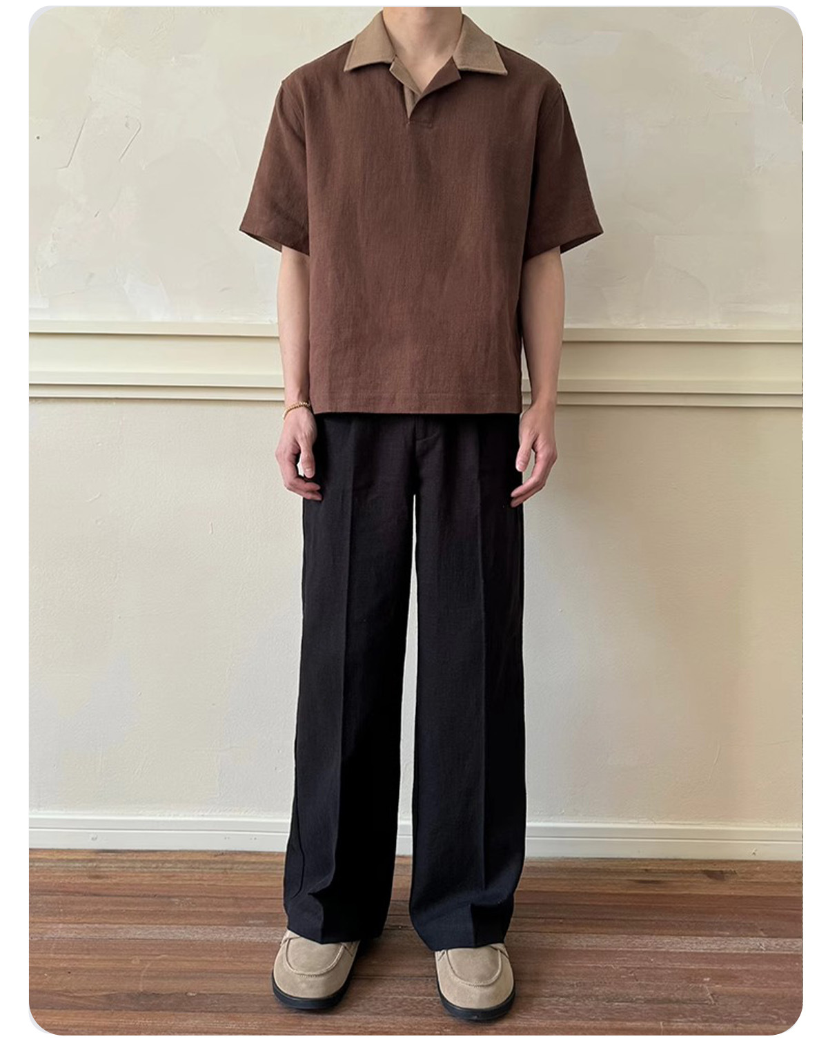 【CSMY】DESERTO 70 린넨 혼방 코튼 및 린넨 대비 컬러 폴로 칼라 캐주얼 올드 머니 스타일 남성용 반팔 셔츠