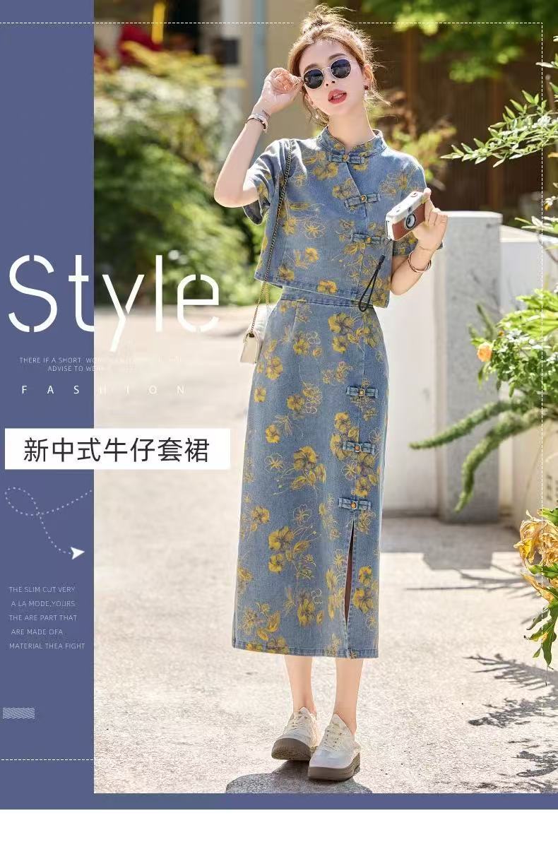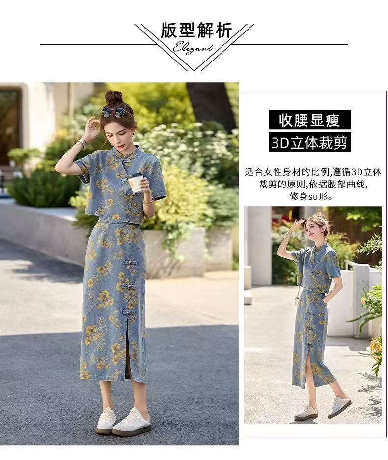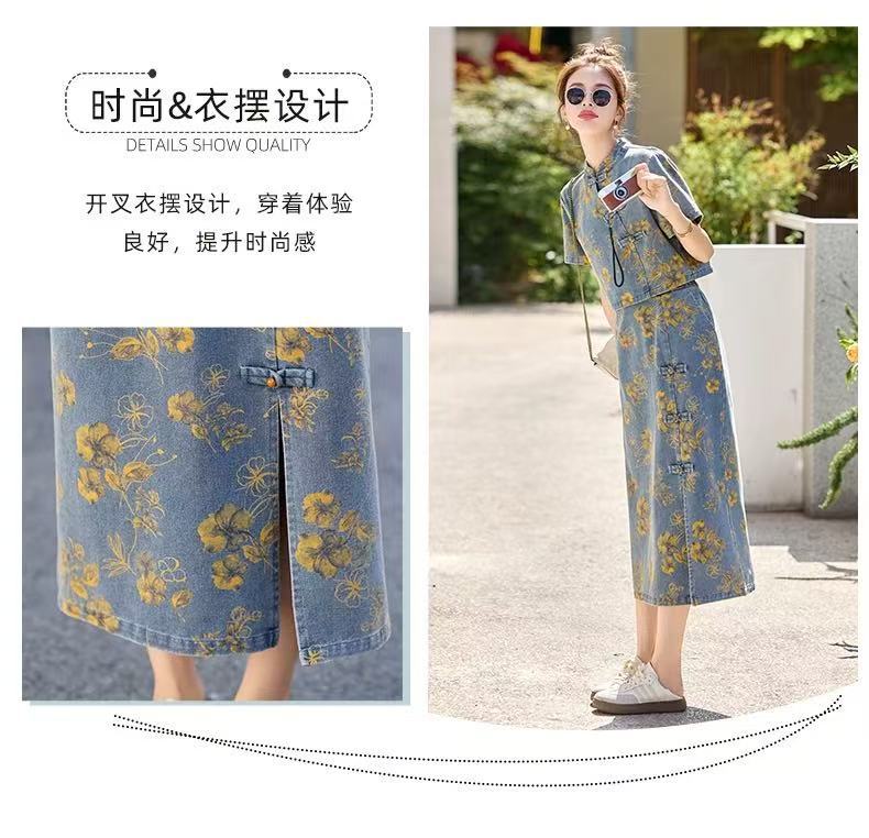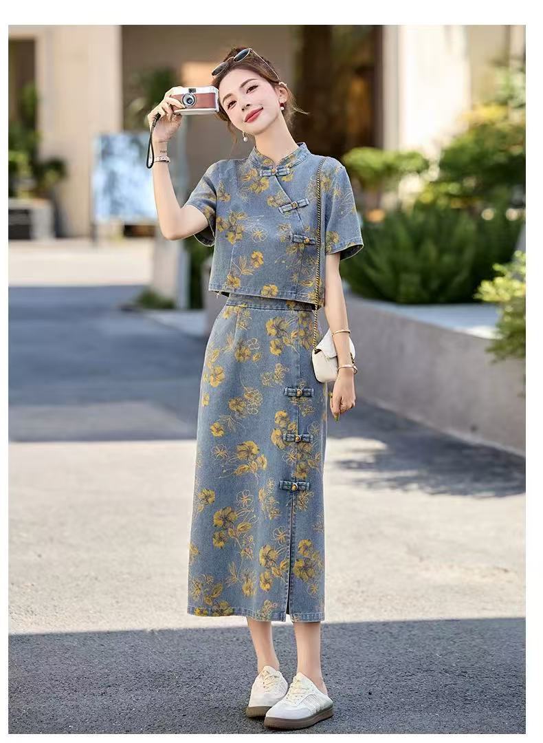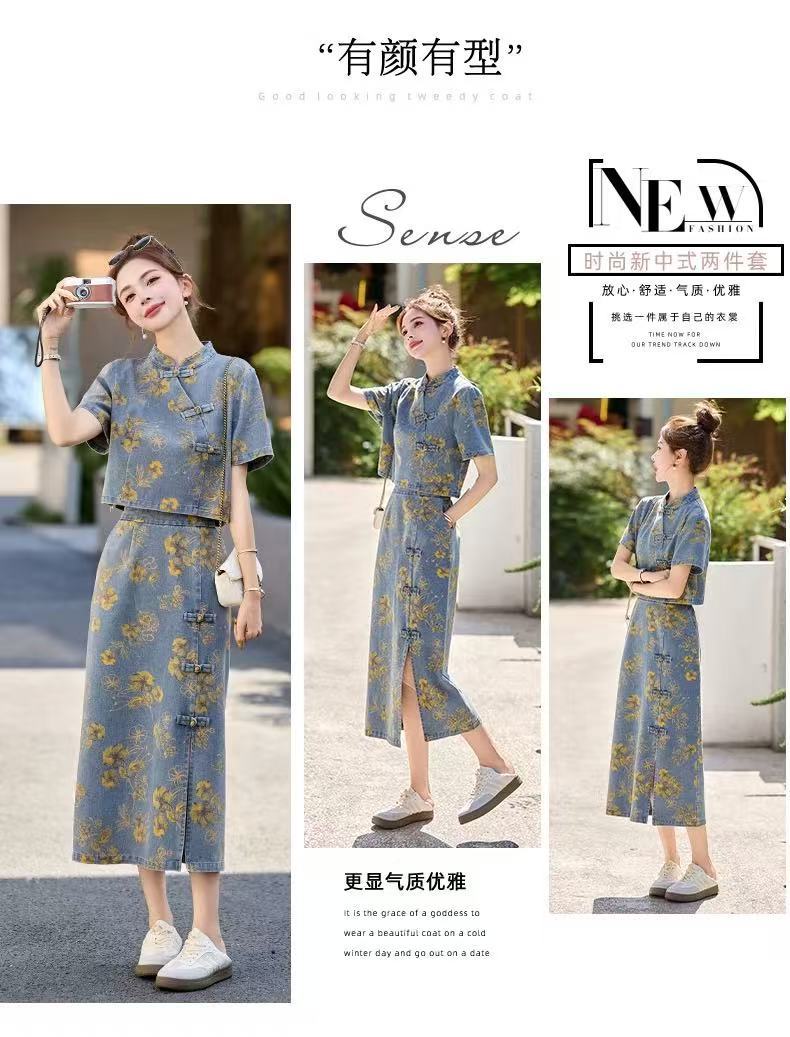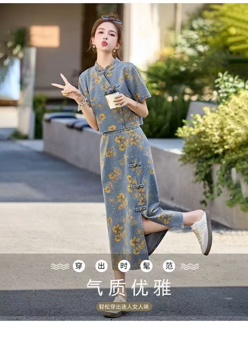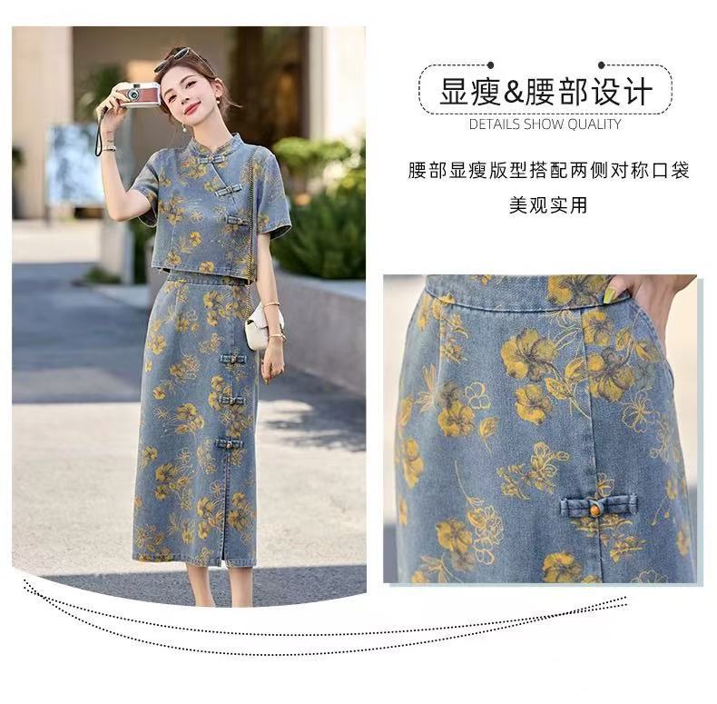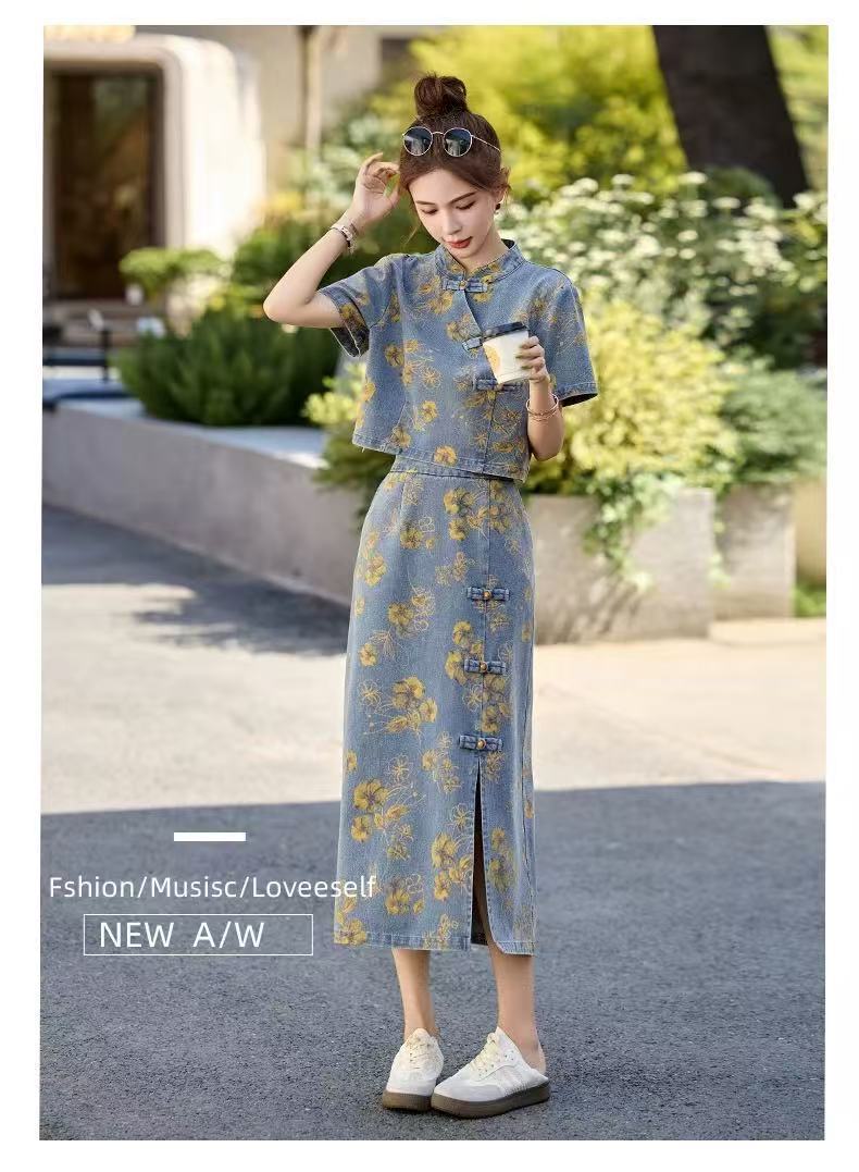여성을위한 새로운 중국 스타일 국립 스타일 버튼 데님 정장 스커트 2025 여름 인기 복고풍 프린트 스커트 투피스 트렌디 세트스토어 가기