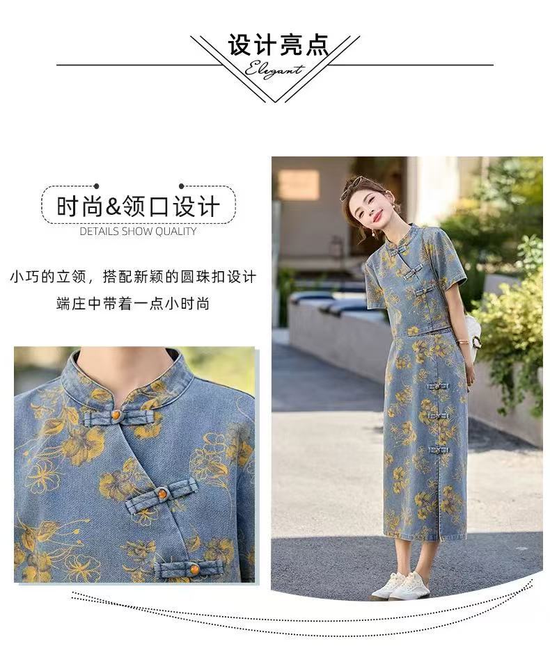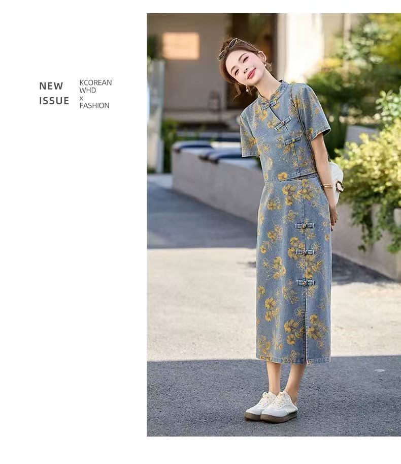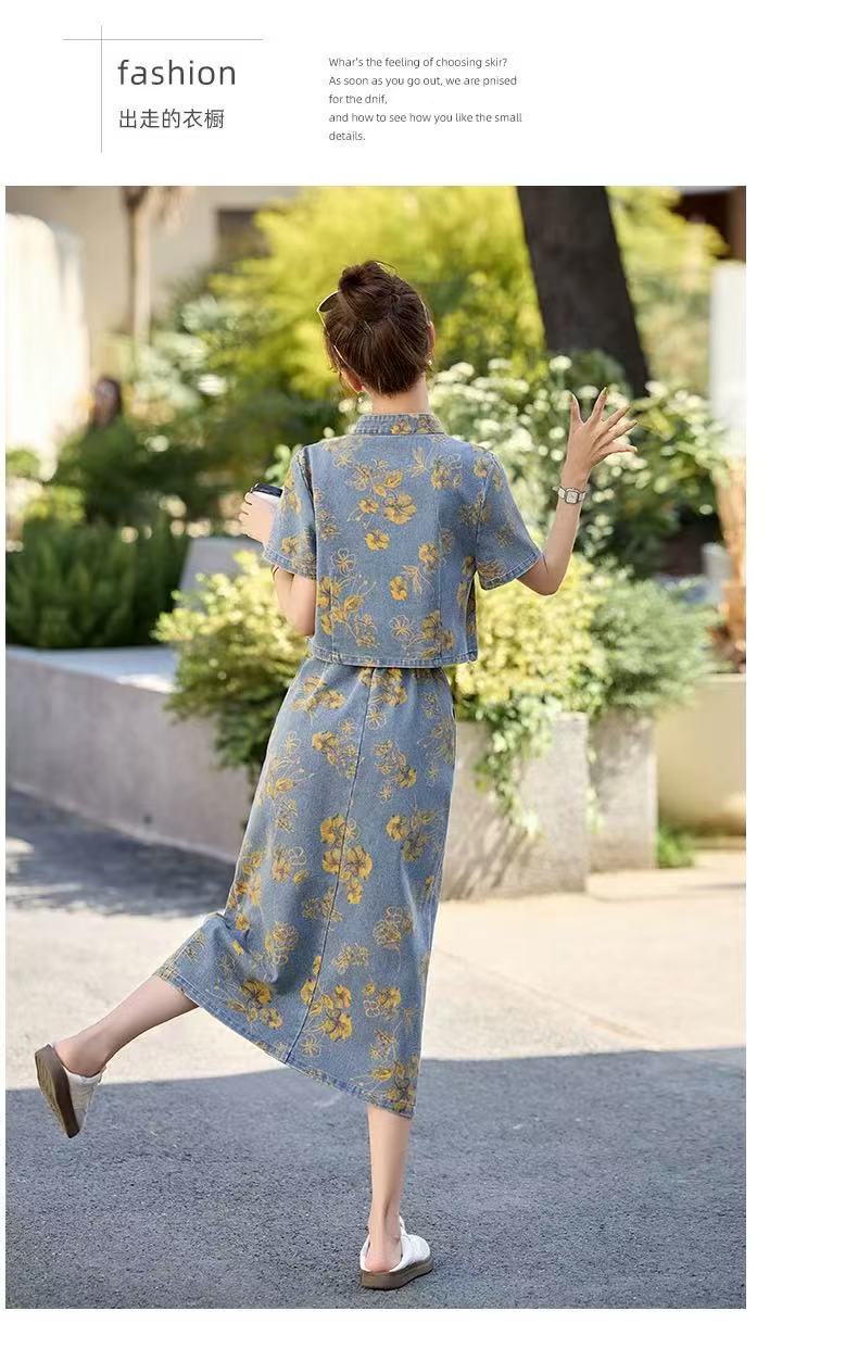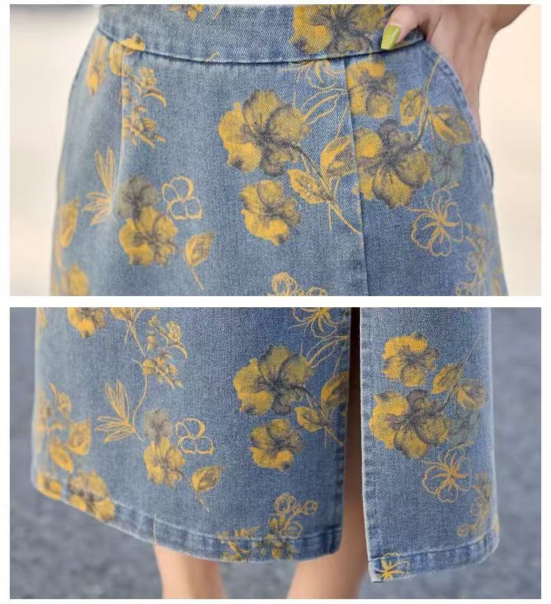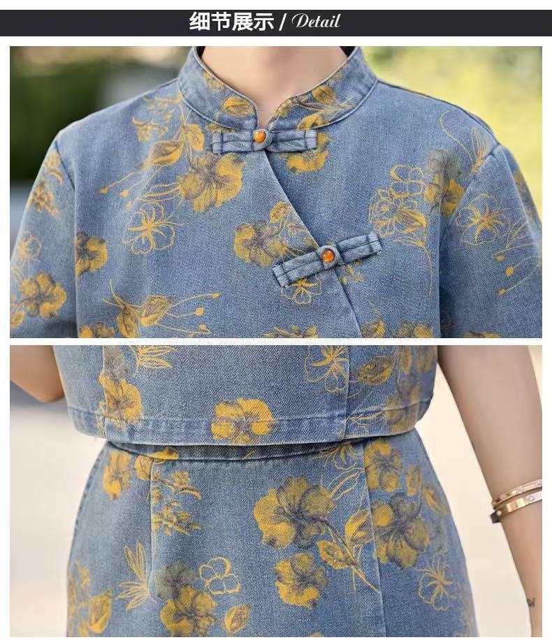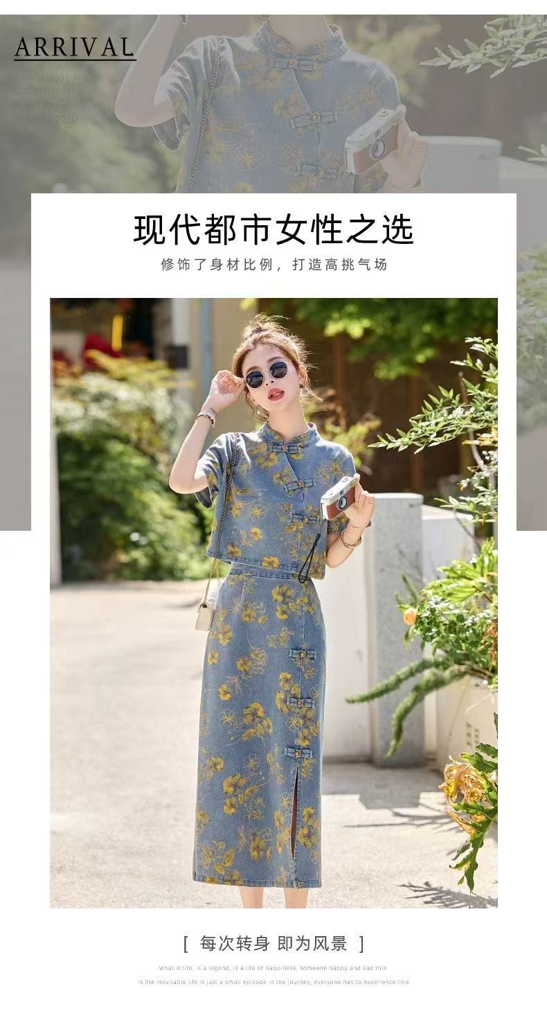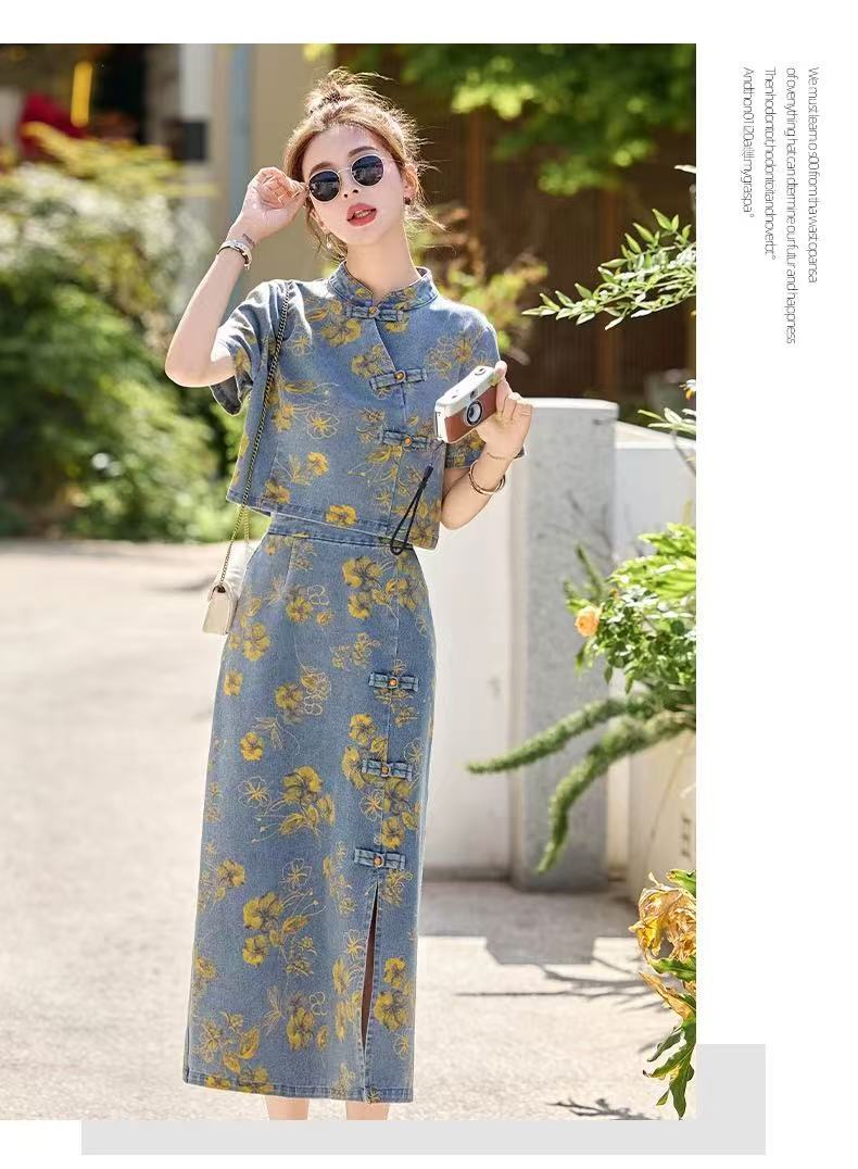 여성을위한 새로운 중국 스타일 국립 스타일 버튼 데님 정장 스커트 2025 여름 인기 복고풍 프린트 스커트 투피스 트렌디 세트스토어 가기
