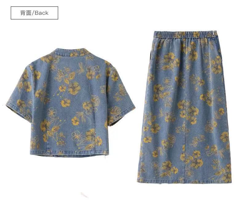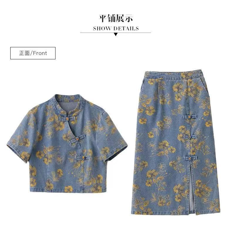 여성을위한 새로운 중국 스타일 국립 스타일 버튼 데님 정장 스커트 2025 여름 인기 복고풍 프린트 스커트 투피스 트렌디 세트