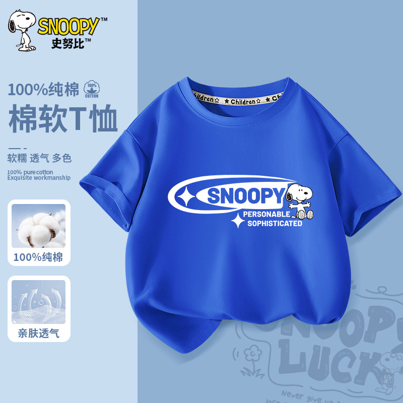 스누피 소년 여름 반팔 티셔츠 2025 새로운 중대형 어린이 면 반소매 어린이 패션 라운드 넥 탑스토어 가기