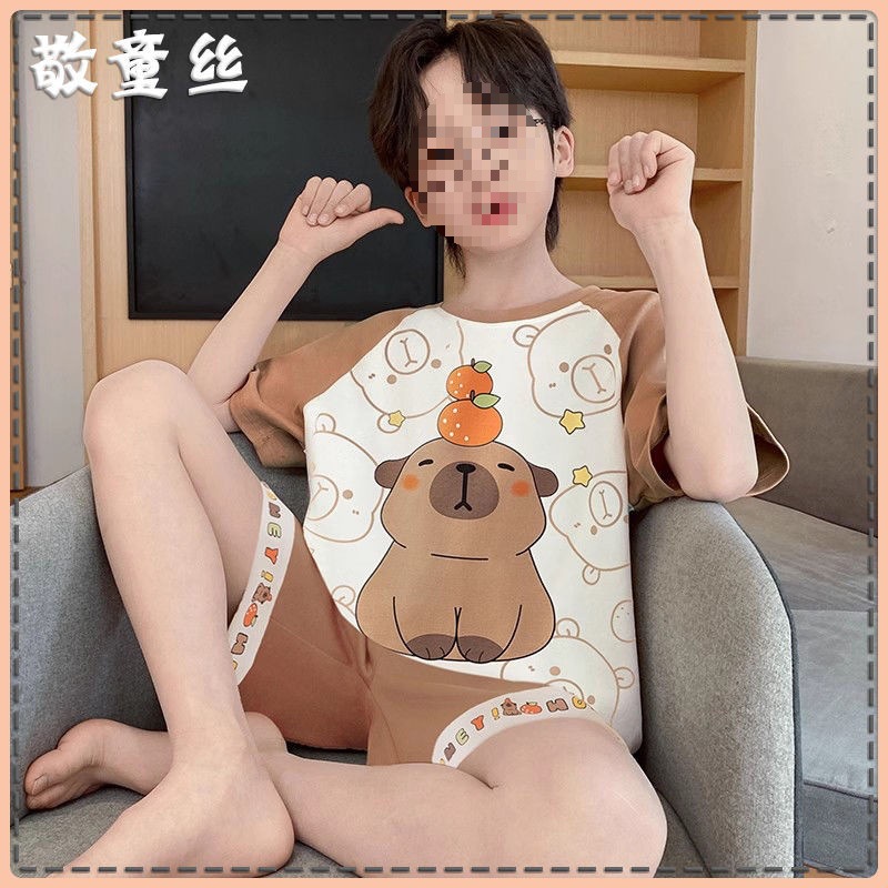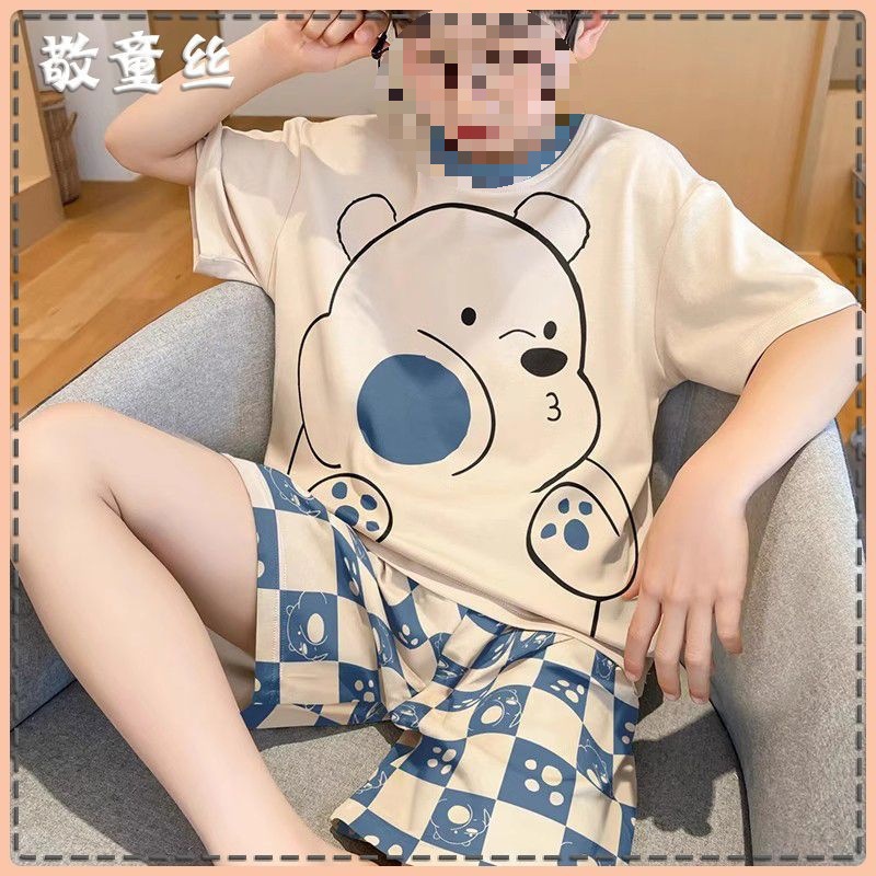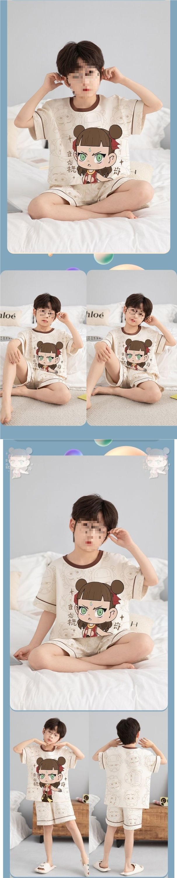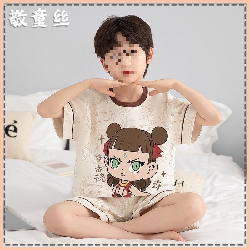 2025 새로운 만화 Nezha 소년 잠옷 여름 얇은 반팔 반바지 정장 소년 중대형 어린이 가정 의류