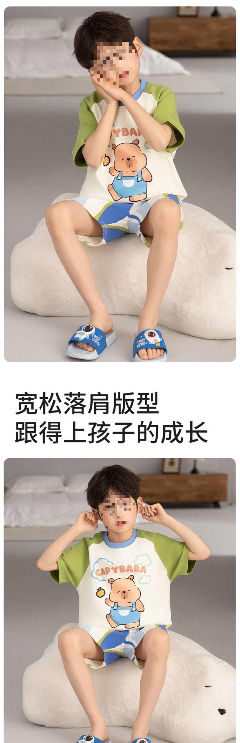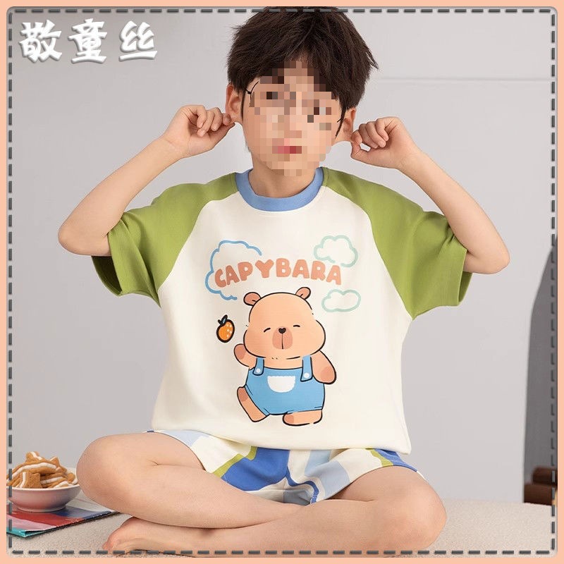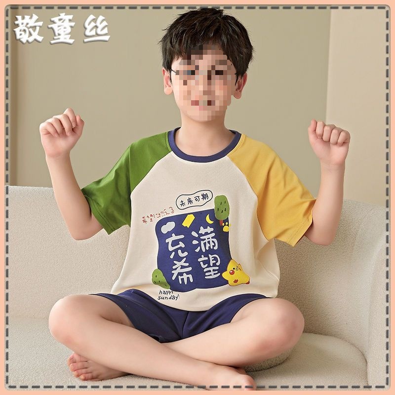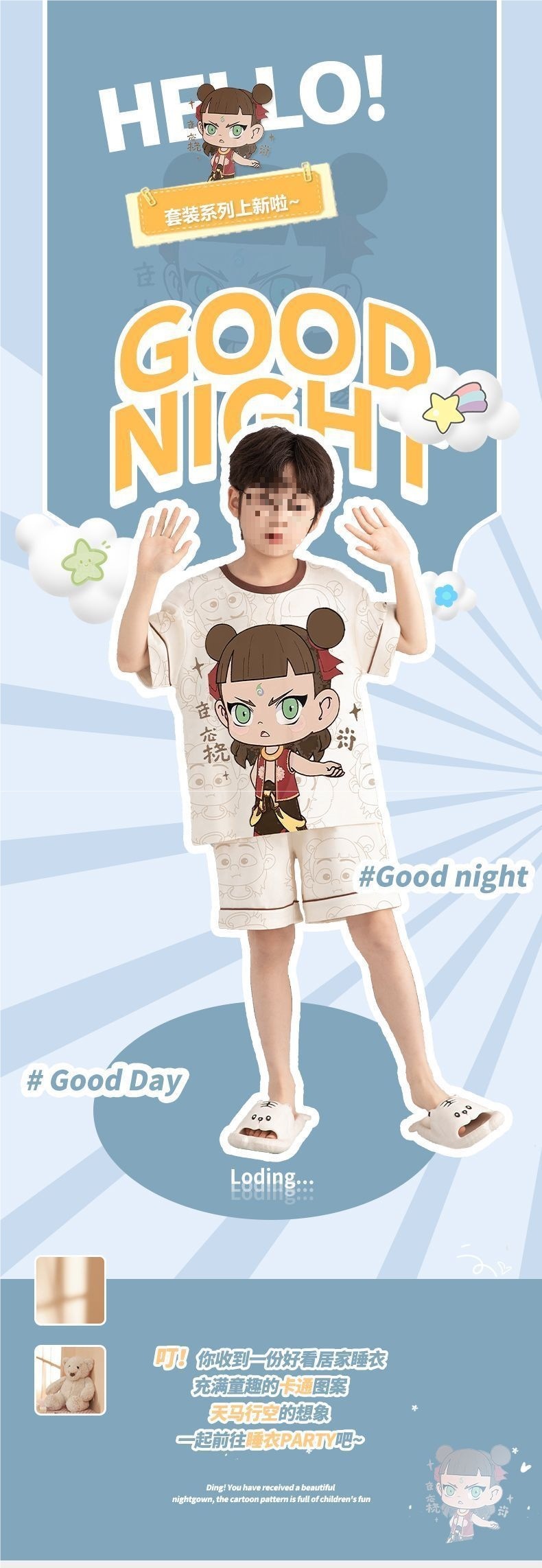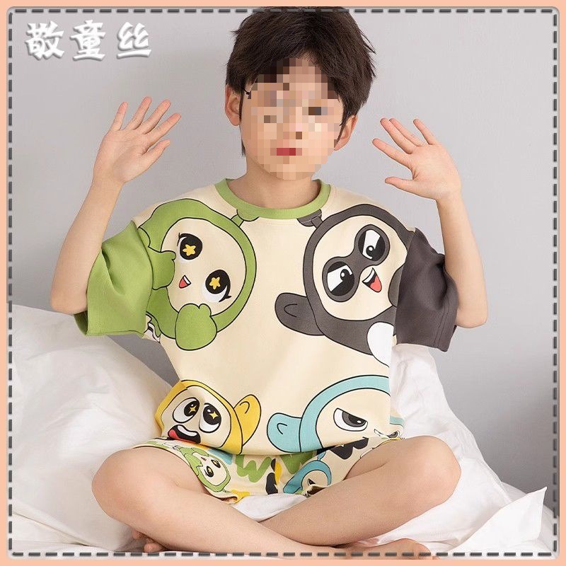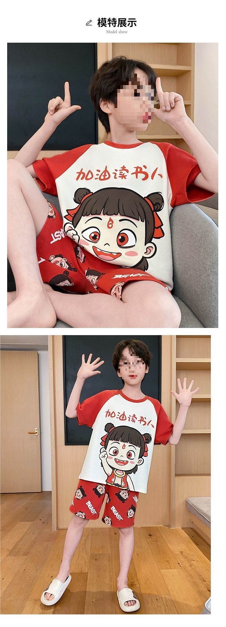 2025 새로운 만화 Nezha 소년 잠옷 여름 얇은 반팔 반바지 정장 소년 중대형 어린이 가정 의류스토어 가기