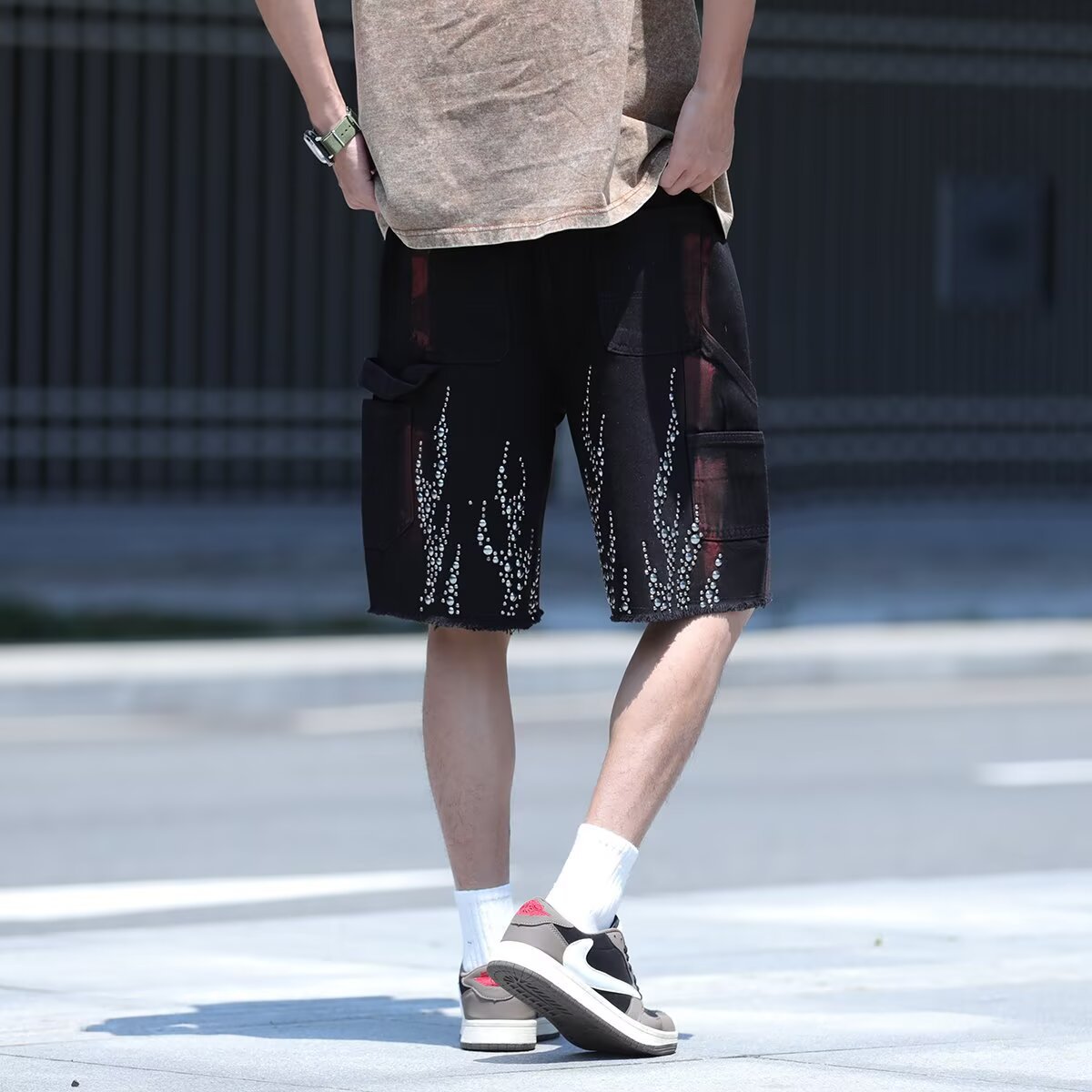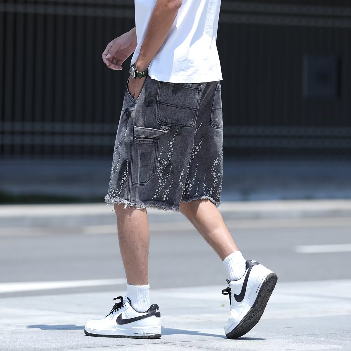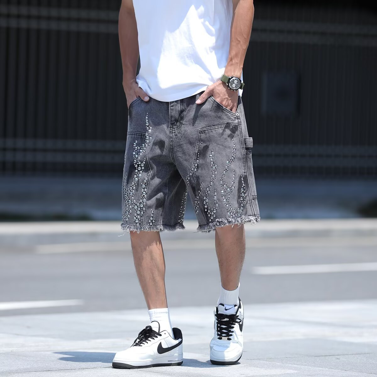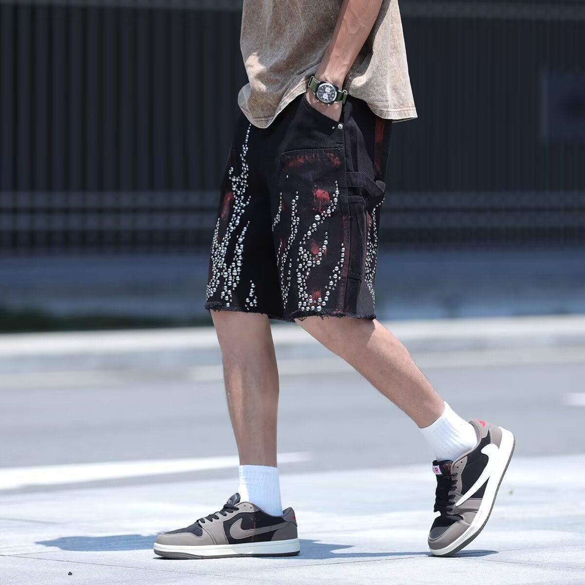 유럽과 미국 스타일의 중공업 다이아몬드가 박힌 데님 반바지 남성 패션 트렌디 브랜드 미국 스타일의 맞춤형 스트리트 여름 캐주얼 루즈 반바지