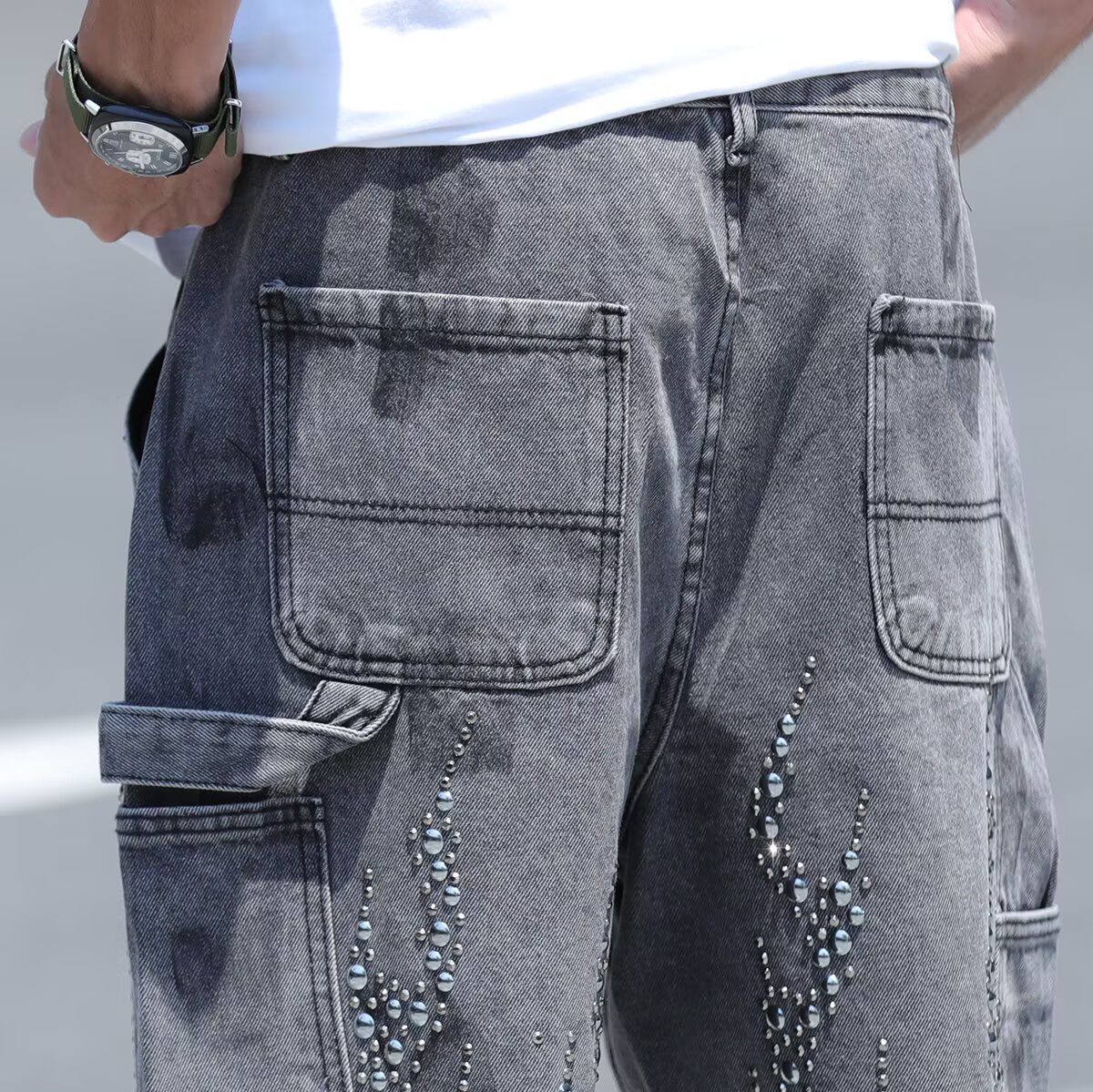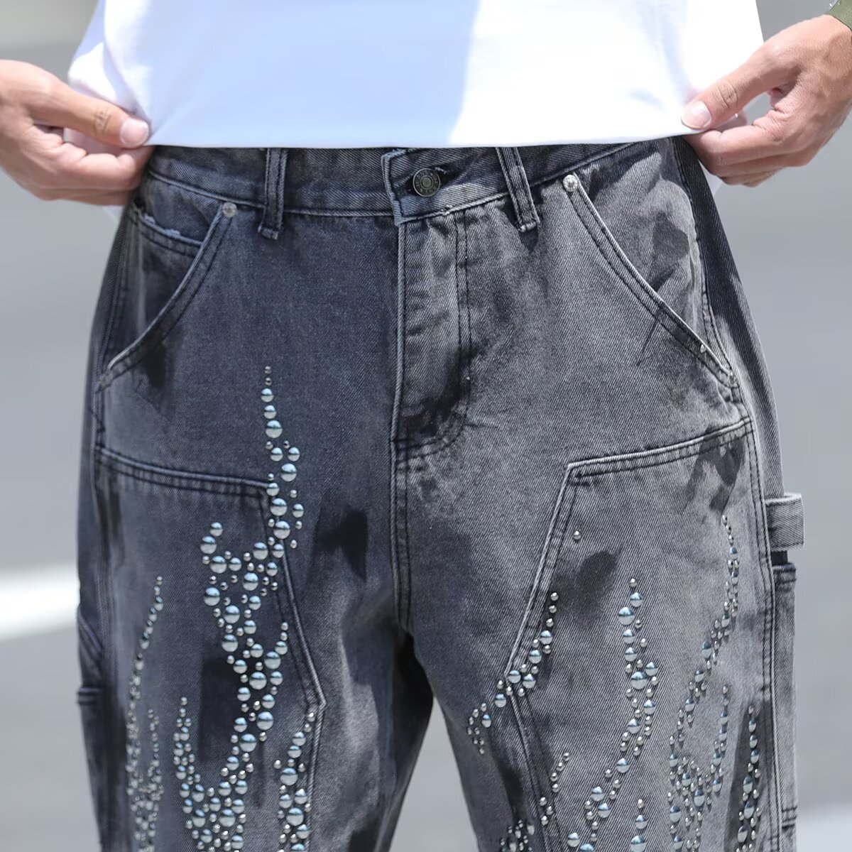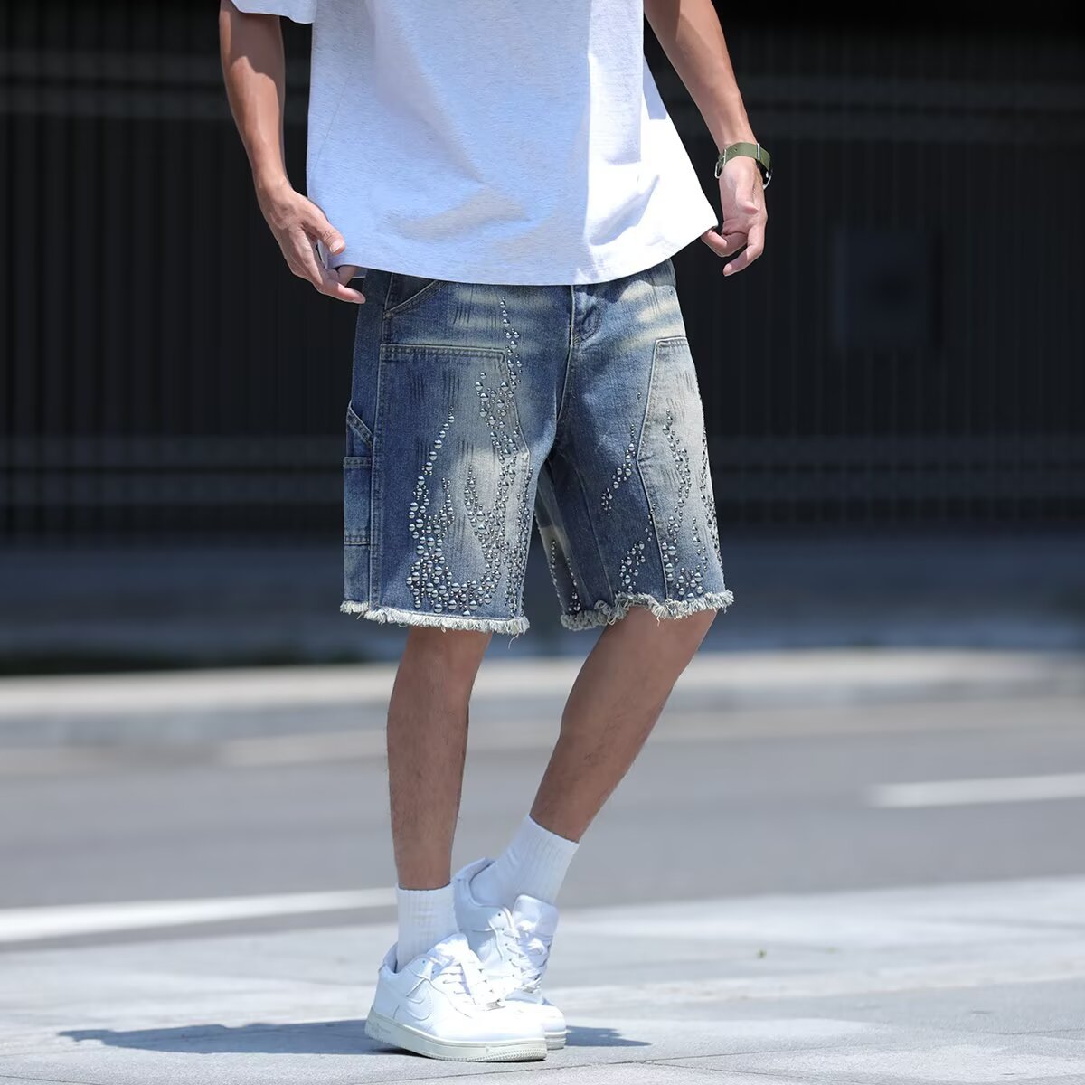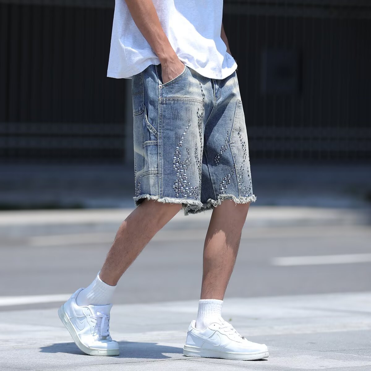 유럽과 미국 스타일의 중공업 다이아몬드가 박힌 데님 반바지 남성 패션 트렌디 브랜드 미국 스타일의 맞춤형 스트리트 여름 캐주얼 루즈 반바지