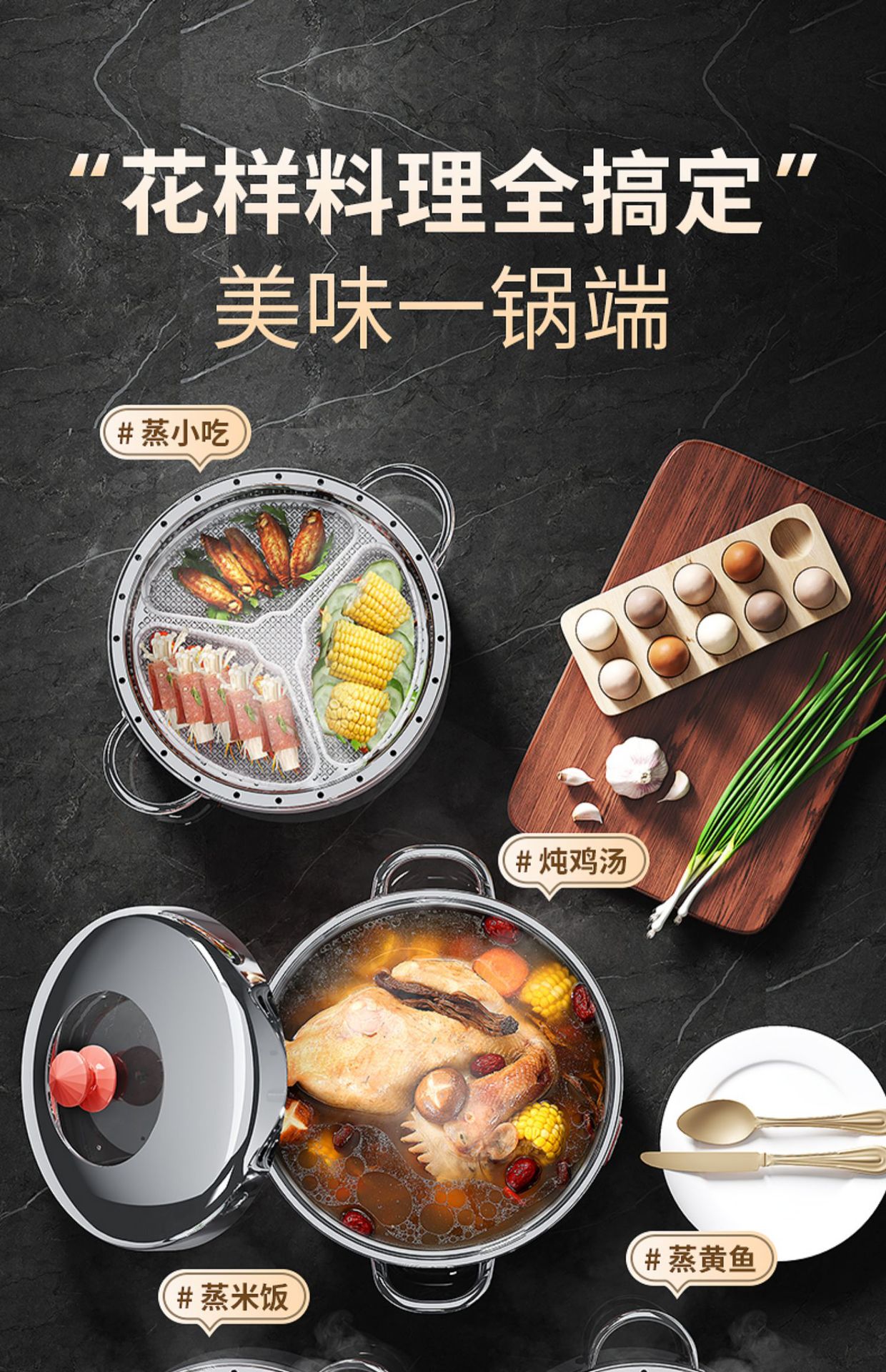 • 30cm 냄비 1개, 뚜껑 1개, 찜기 3개(4~5인용)