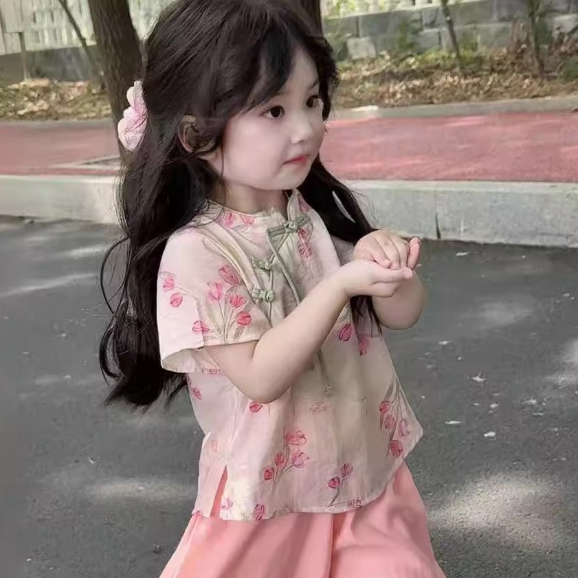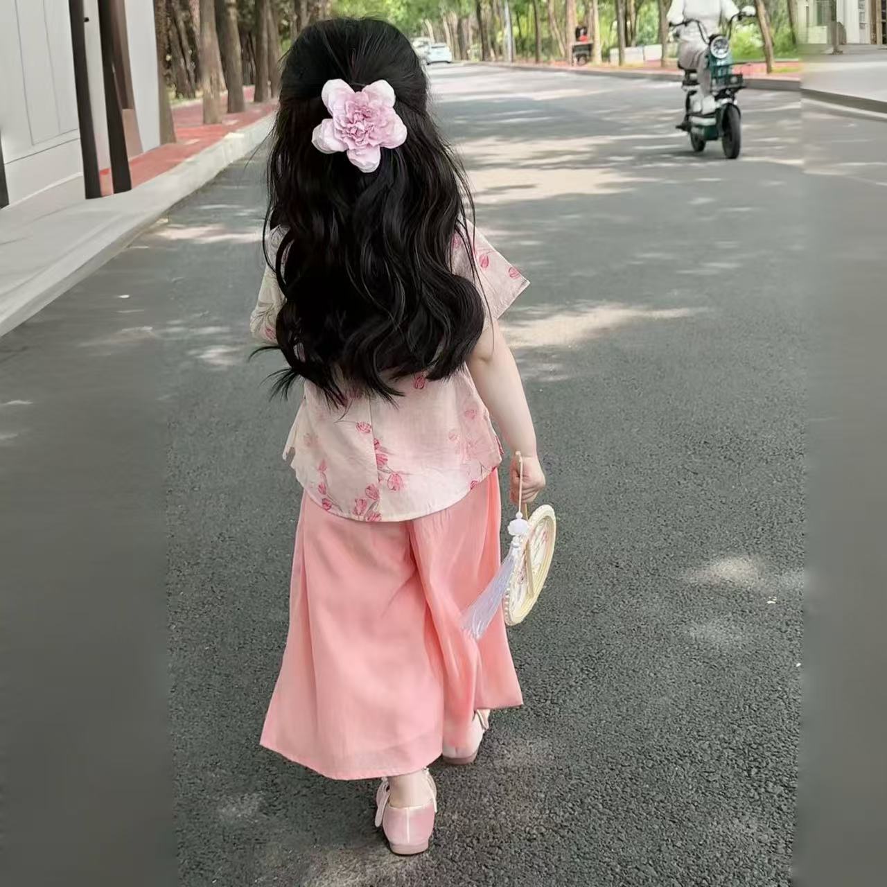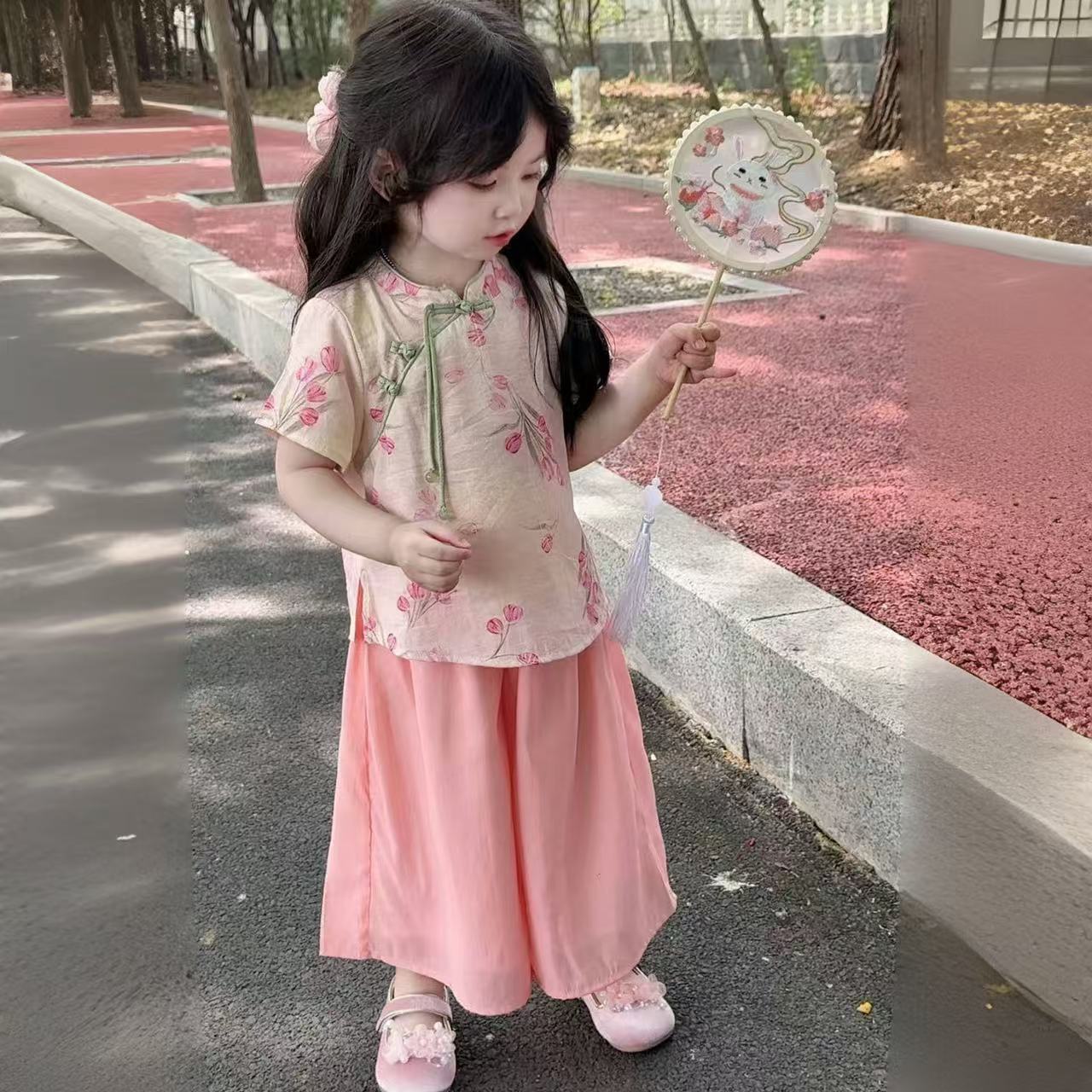 소녀의 골동품 외국 스타일 세트 여성의 보물 꽃 탑 넓은 다리 바지 중국 스타일 투피스 새로운 중국 스타일 여름 원피스