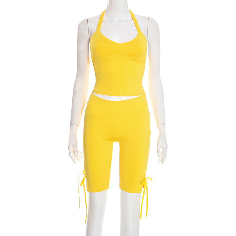 J25ST089 유럽과 미국 스타일의 국경 간 여성 의류 봄과 여름에 목 넥타이 로프 끈이없는 등이없는 활 바지 단색 세트스토어 가기