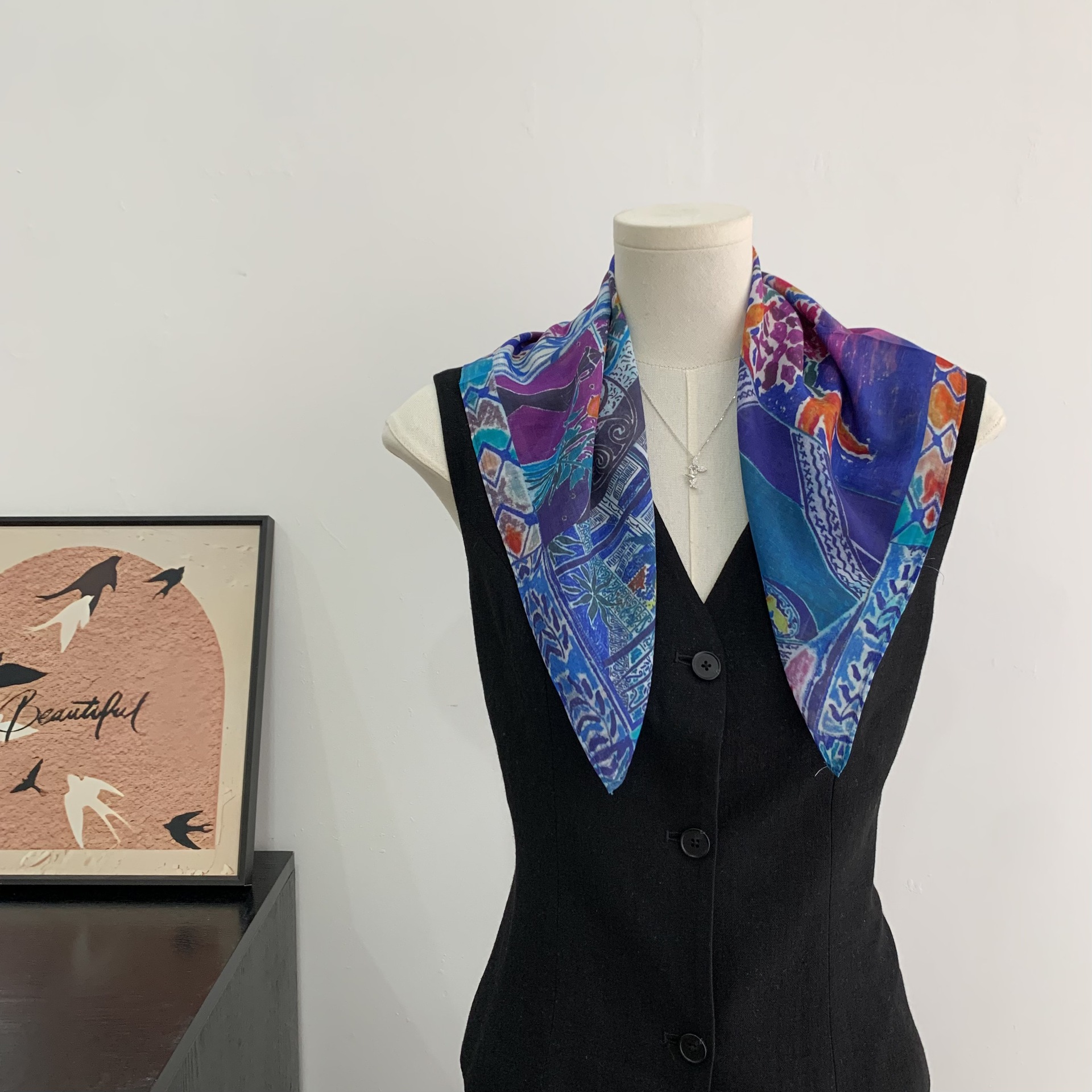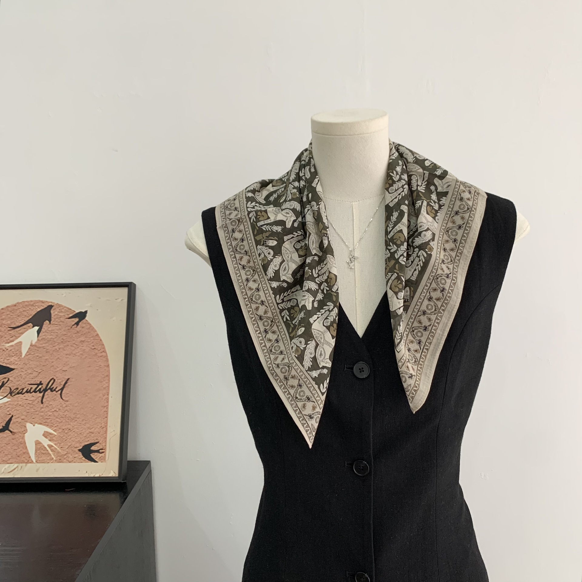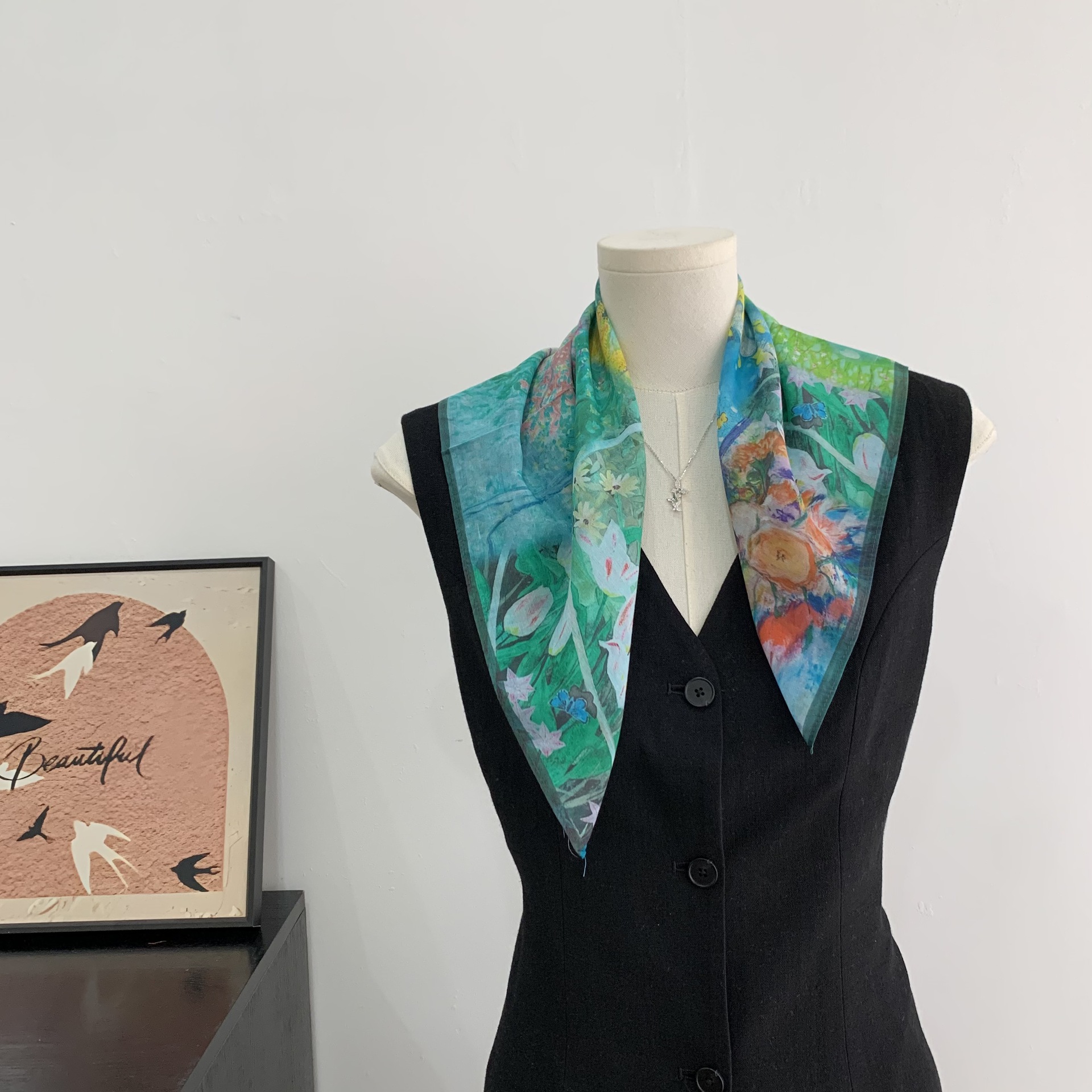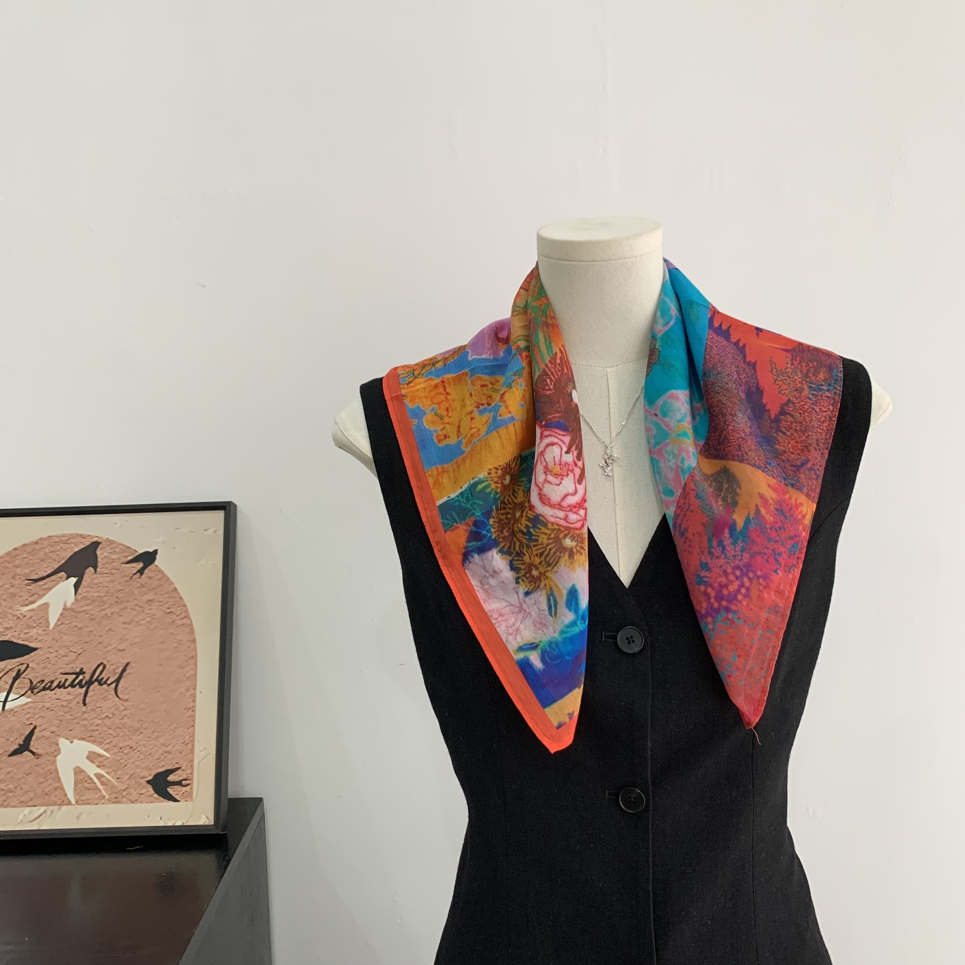 여성을위한 복고풍 유화 같은 멀버리 실크 작은 사각형 스카프 봄과 여름 새로운 패션 문학 다목적 가벼운 장식 스카프스토어 가기