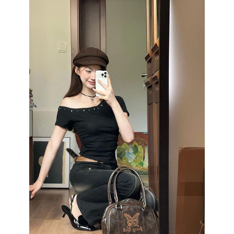 여름 디자인 순수한 욕망 슬리밍 반팔 탑 여성을위한 태국 스타일의 새로운 핫 소녀 리벳 오프 숄더 슬래시 넥 티셔츠스토어 가기