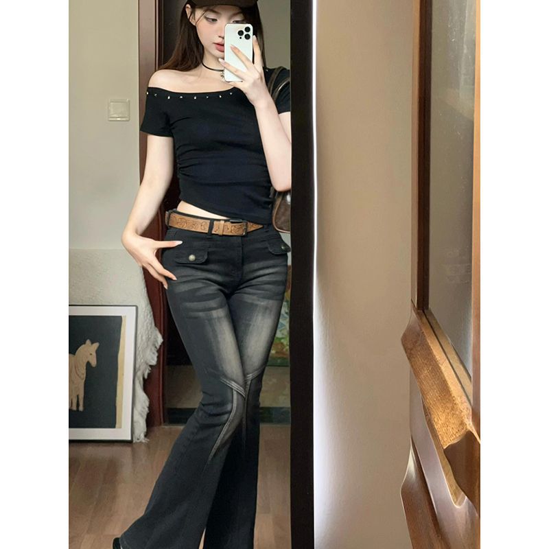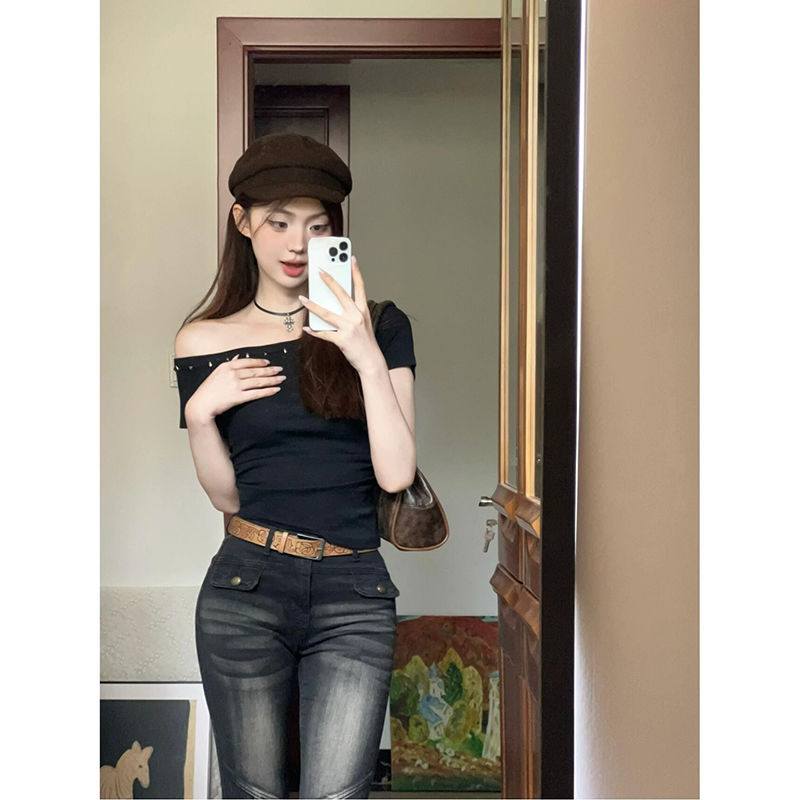 여름 디자인 순수한 욕망 슬리밍 반팔 탑 여성을위한 태국 스타일의 새로운 핫 소녀 리벳 오프 숄더 슬래시 넥 티셔츠