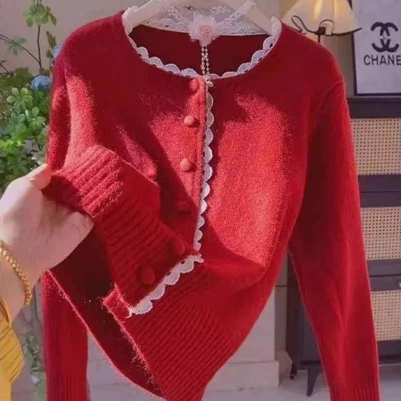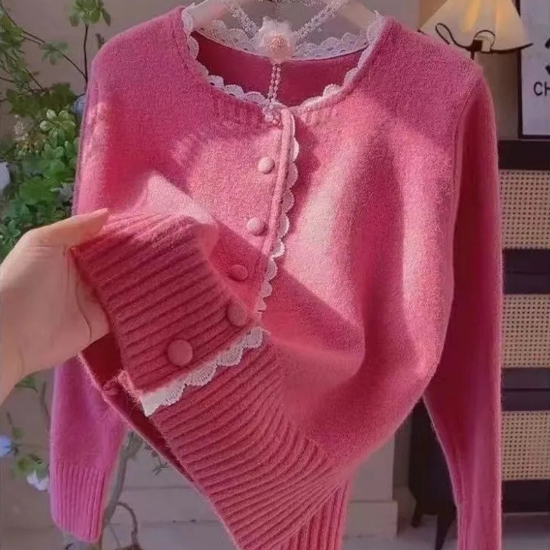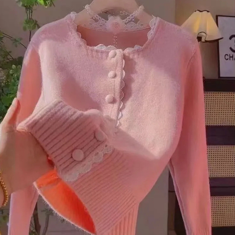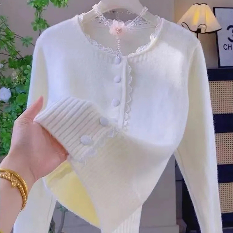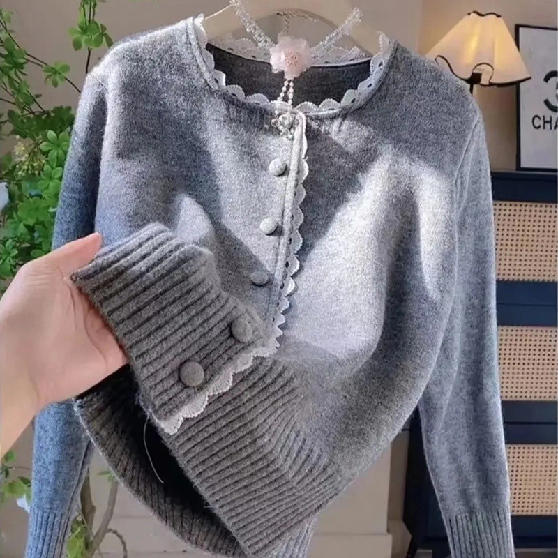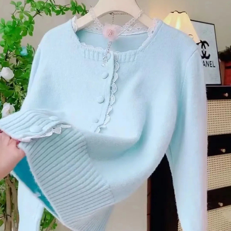 여성을위한 달콤하고 부드러운 레이스 밀크 블루 스웨터 코트 봄, 가을 새로운 틈새 스타일 니트 카디건 탑