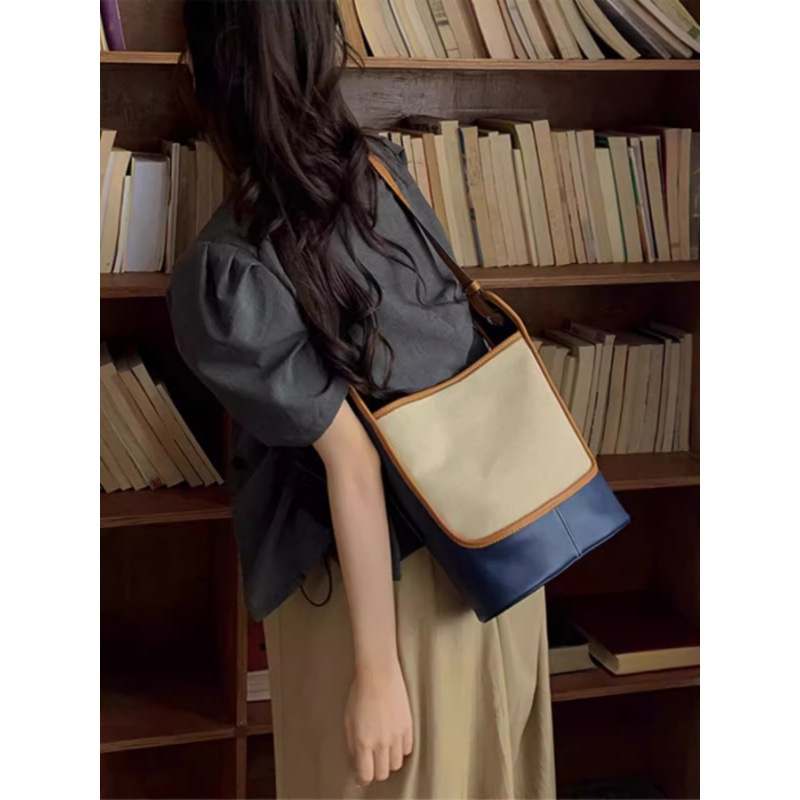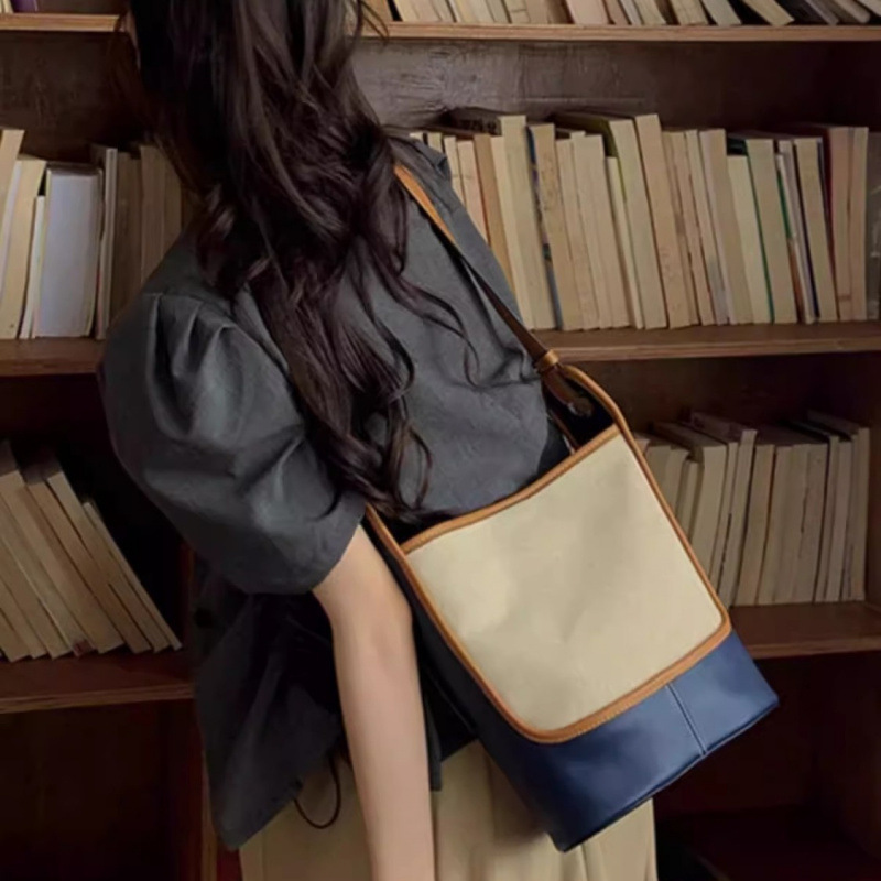 데님 블루 캔버스 버킷 백 여성 2025 년 새로운 여름 틈새 디자이너 통근 어깨 크로스 바디 백스토어 가기