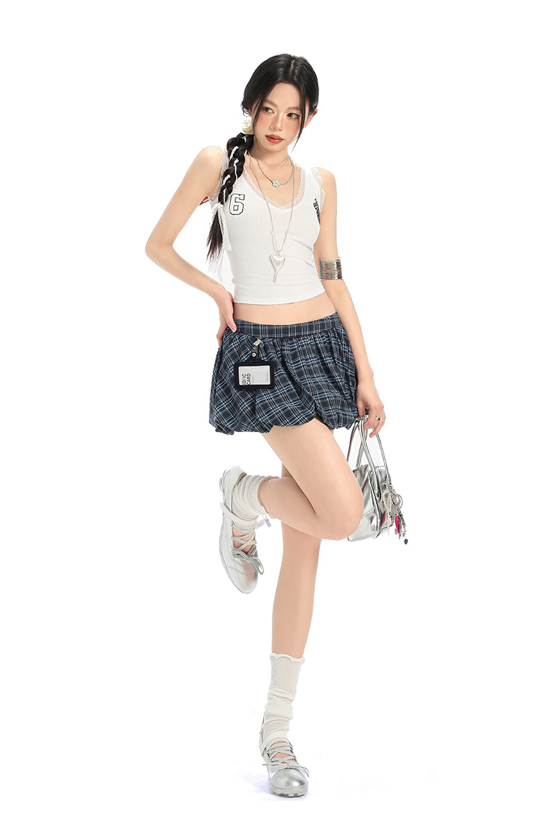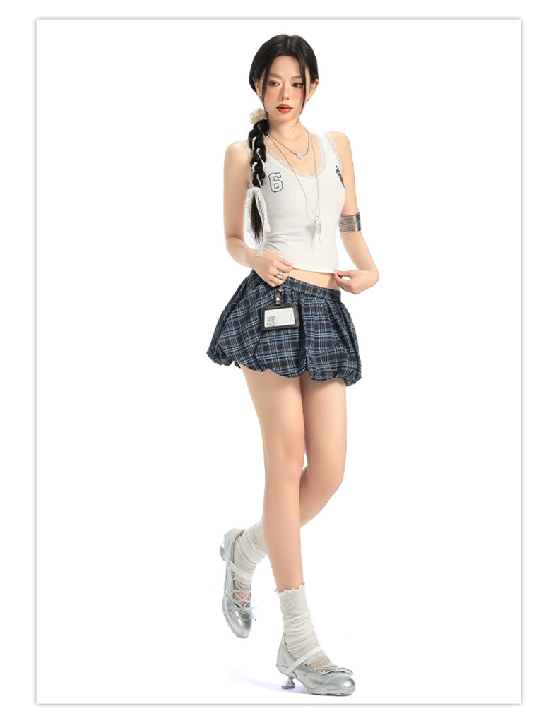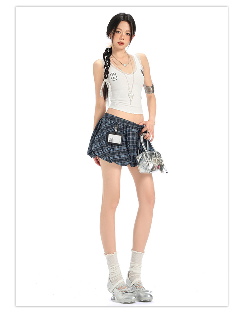 버드 스커트 포켓 체크 무늬 퍼프 스커트 슬리밍 걸리 스타일 신축성 있는 허리 발레 스커트 여성 스커트 여성 여름 작은 사람스토어 가기