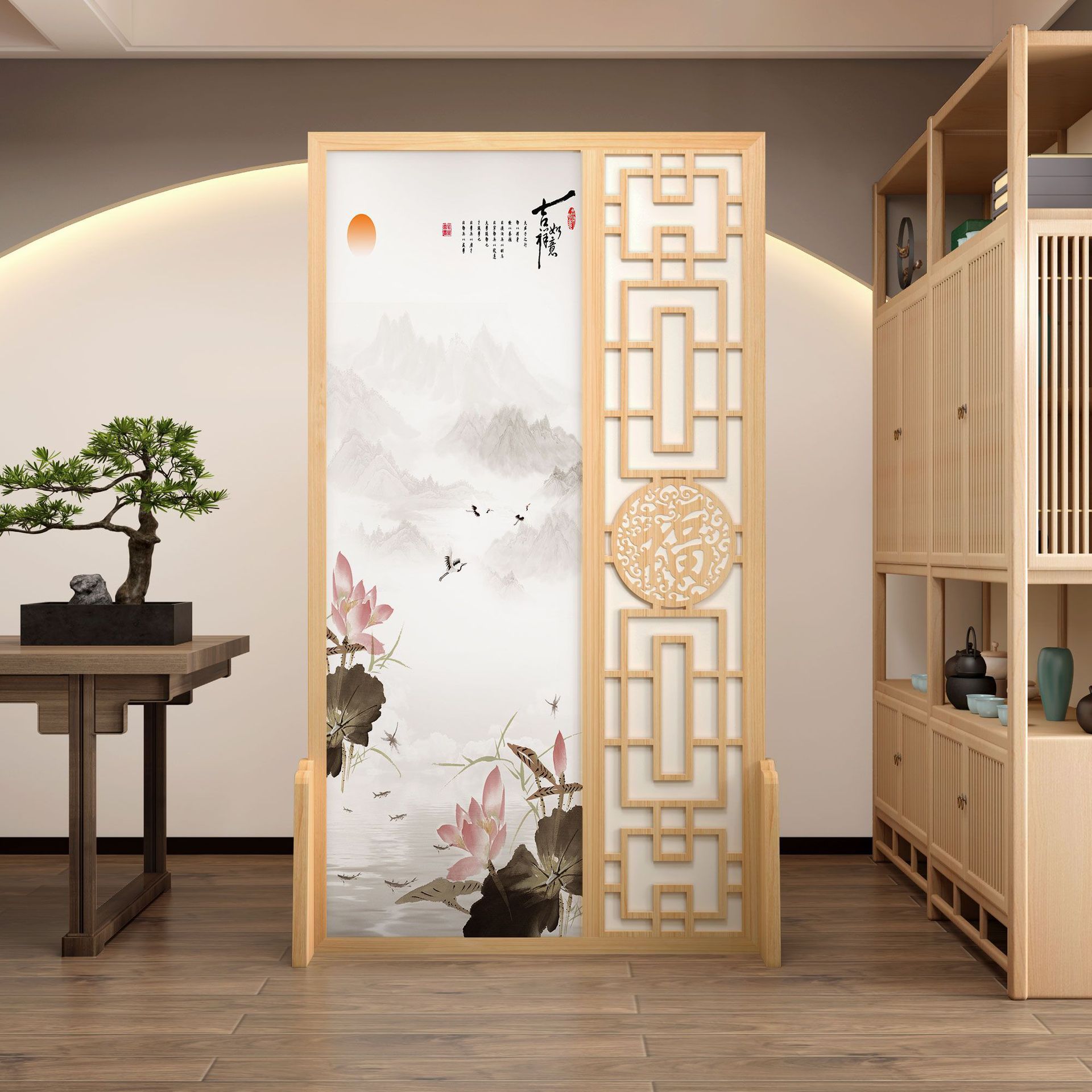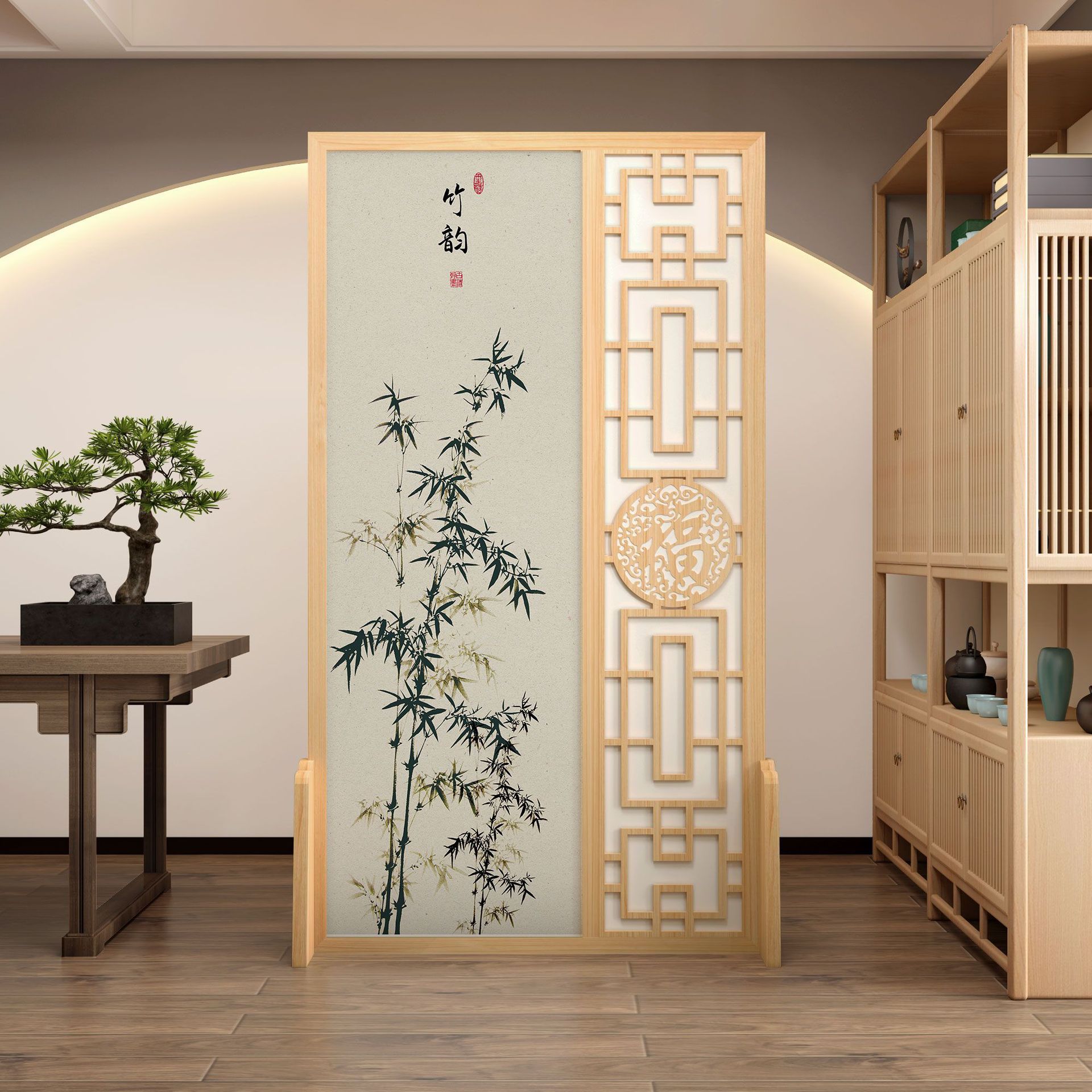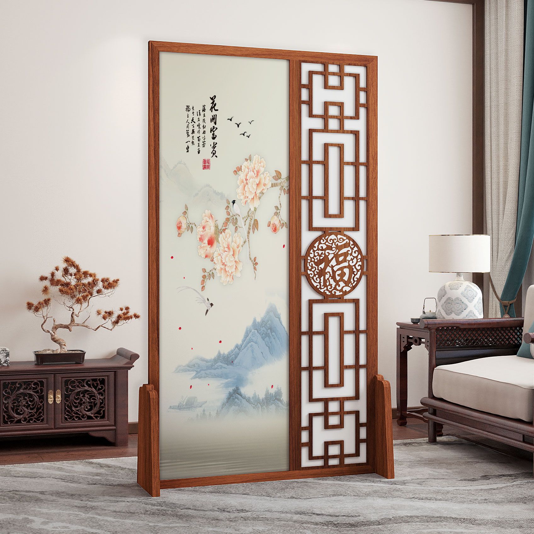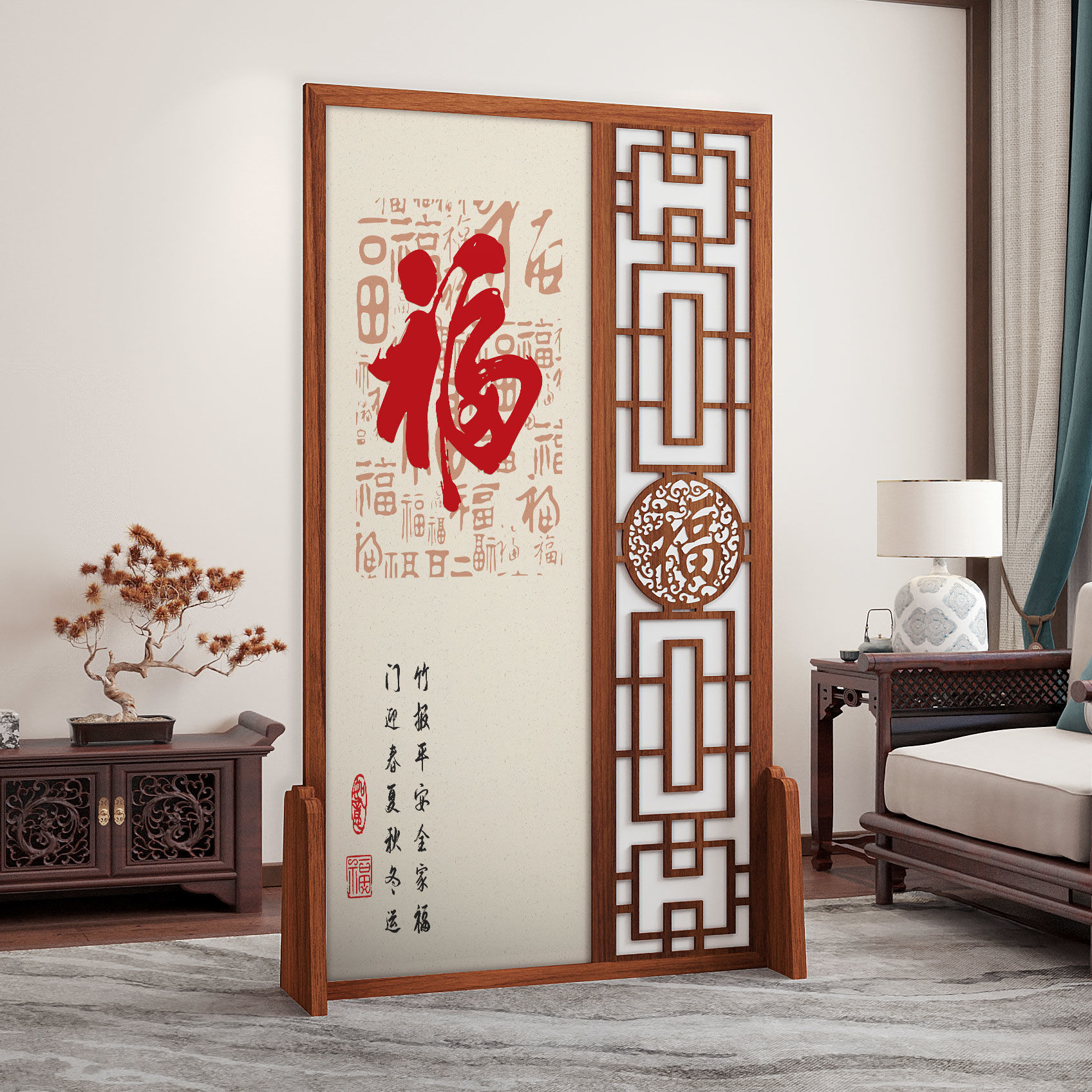 K曹 3 축복 현대 중국 스타일 패브릭 스크린 파티션 벽 모바일 입구 차단 현관 거실 침실 모조 단단한 나무스토어 가기