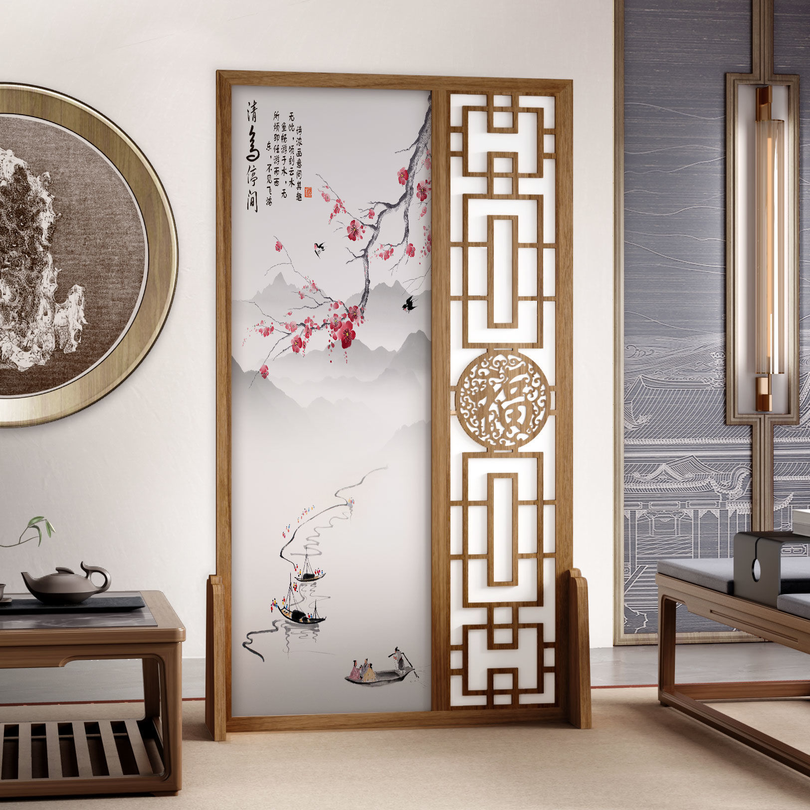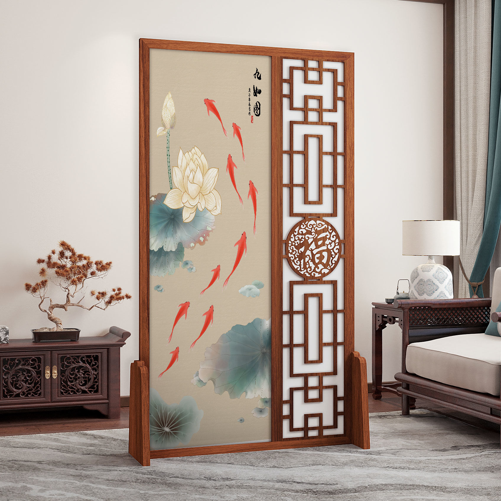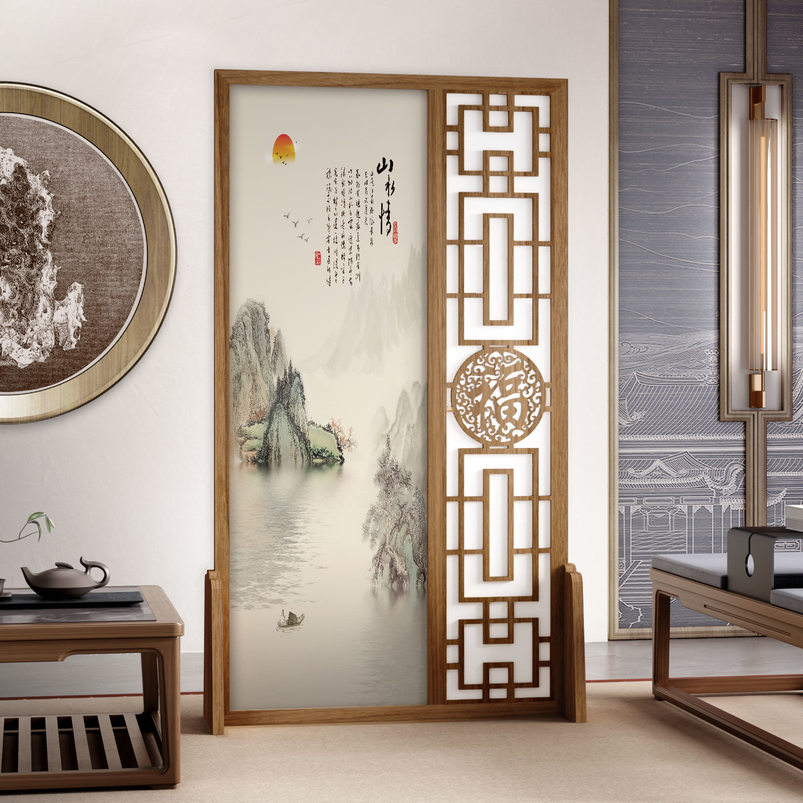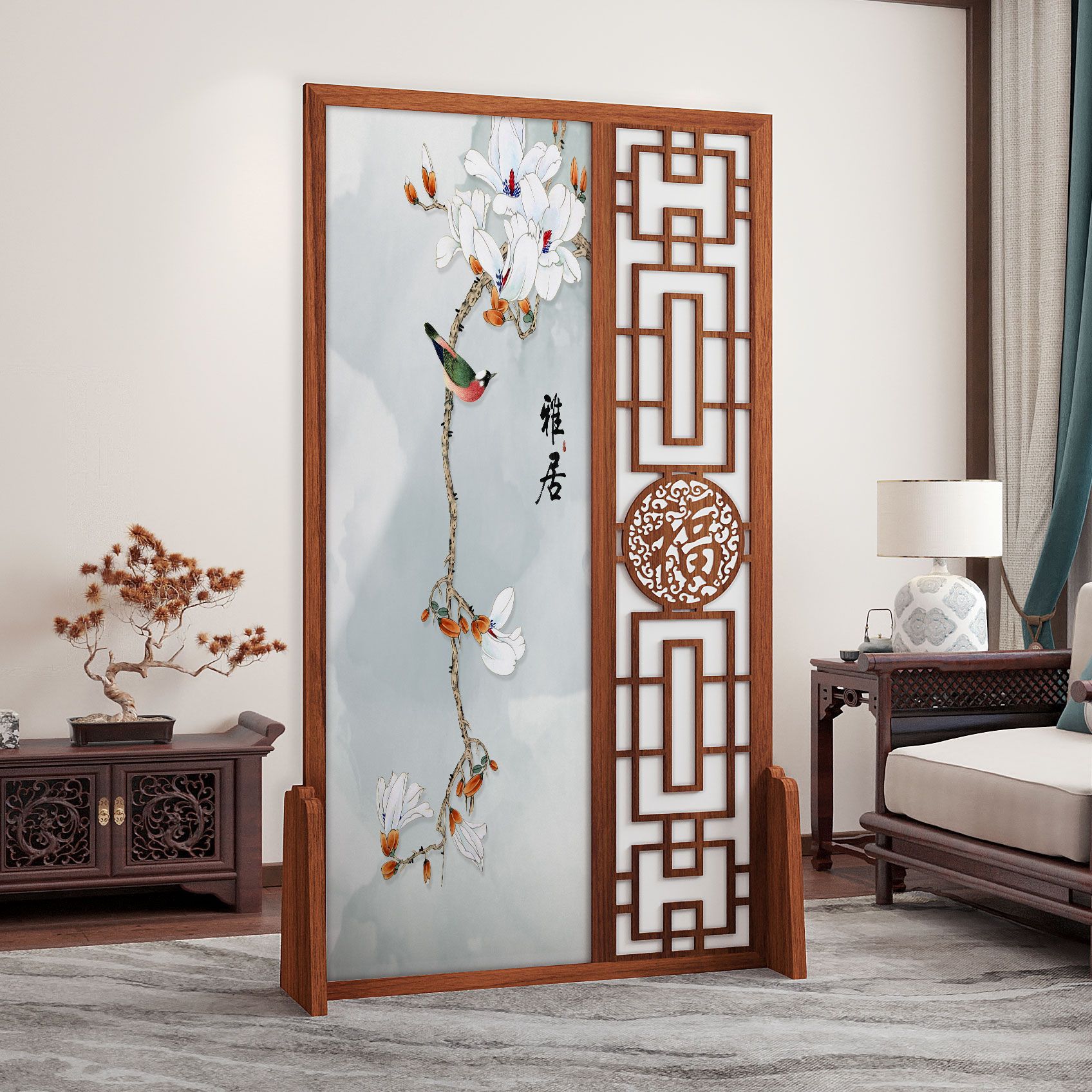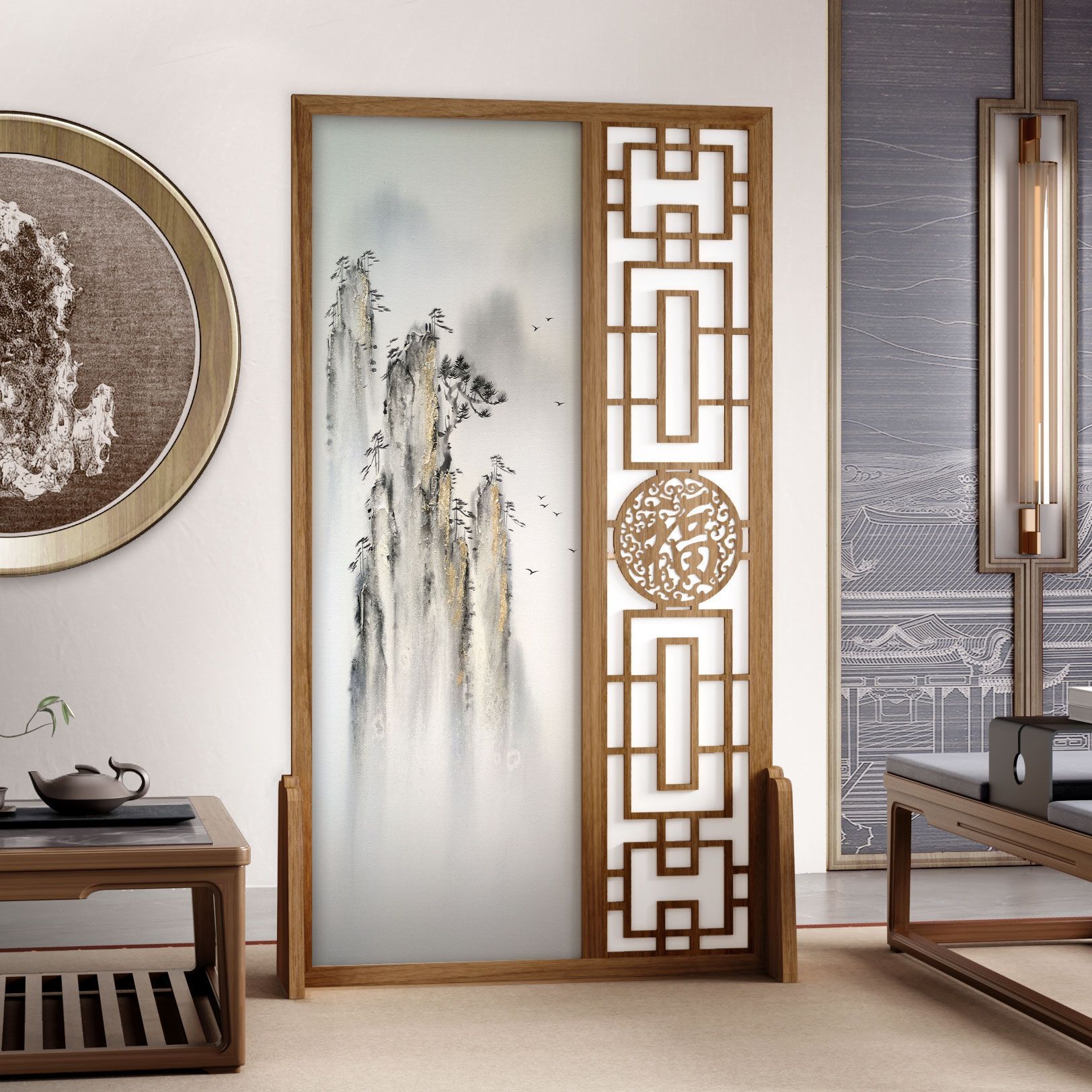 K曹 3 축복 현대 중국 스타일 패브릭 스크린 파티션 벽 모바일 입구 차단 현관 거실 침실 모조 단단한 나무스토어 가기