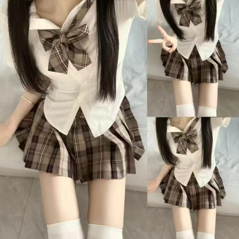 • 허리가 잘록한 흰색 셔츠, 반소매 + 작은 갈색 리본 + 작은 갈색 스커트 3종 세트