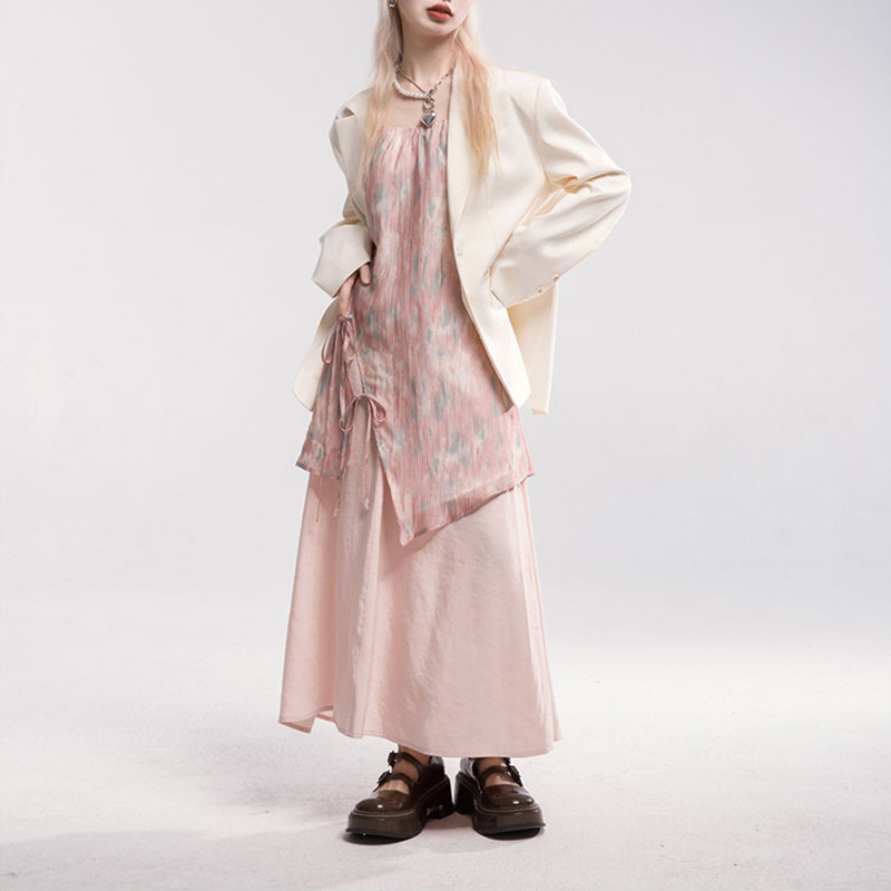여성용 디자인 슈트 여름 스트랩 솔리드 컬러 얇은 블레이저 캐미솔 탑 캐주얼 하프 길이 스커트 3 피스 세트스토어 가기