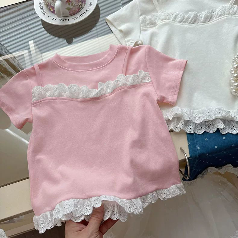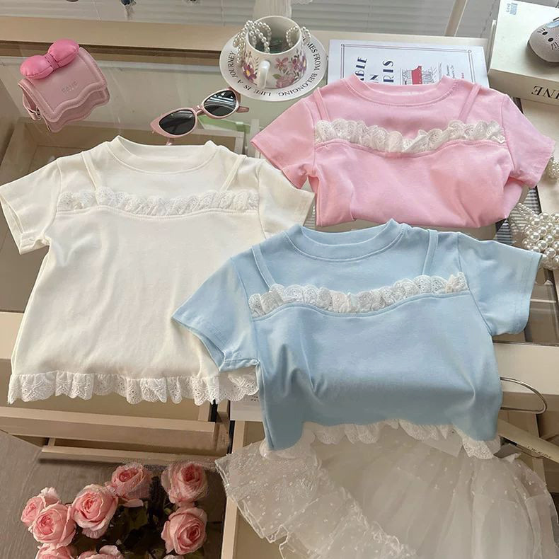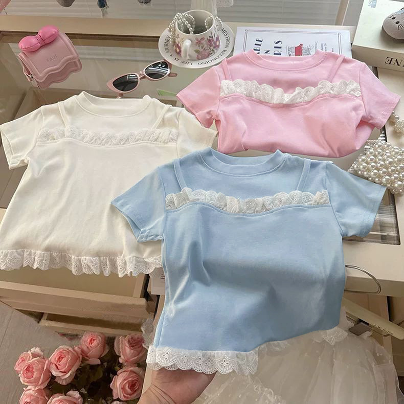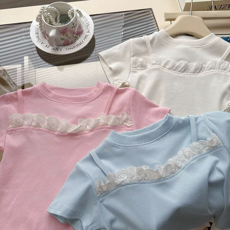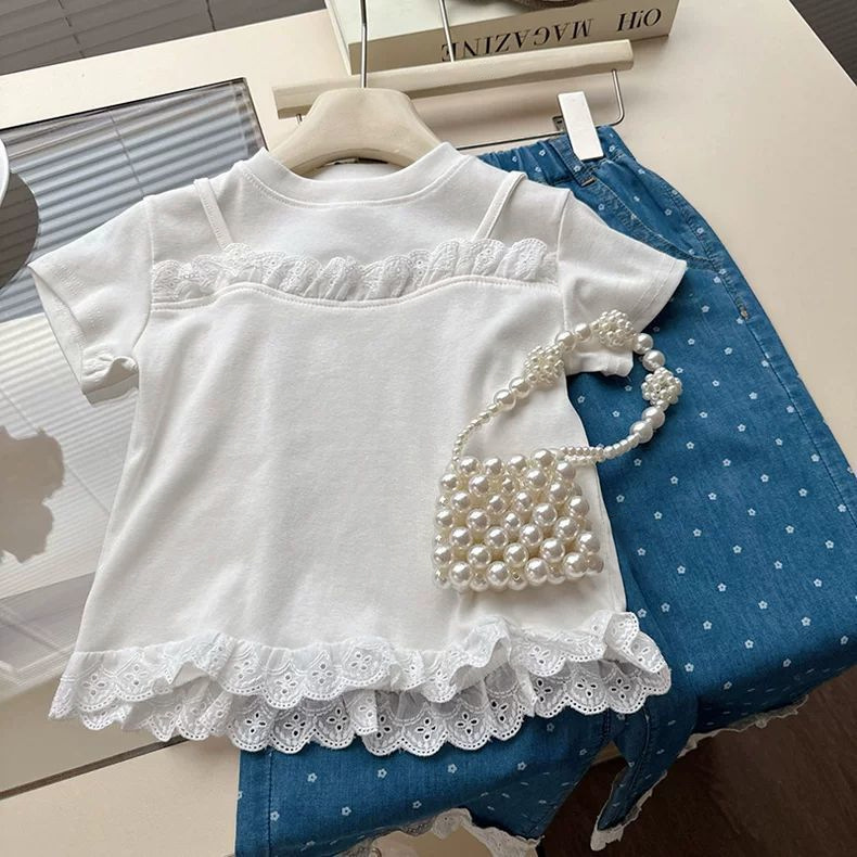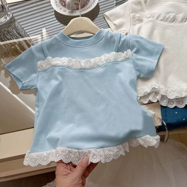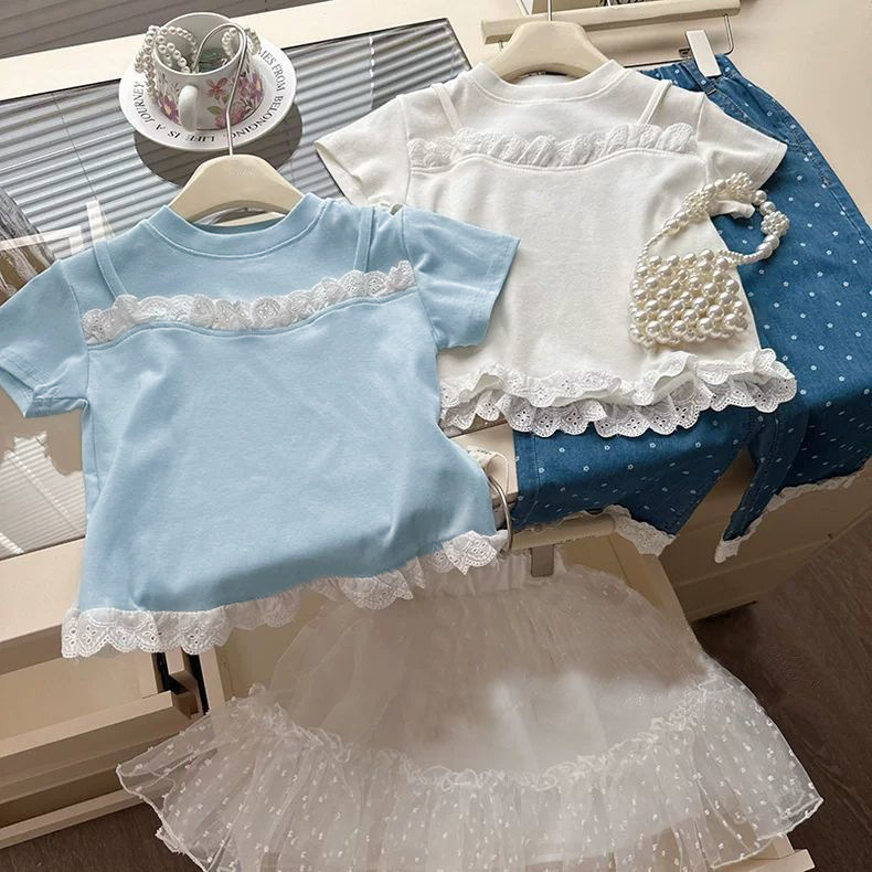 2025 년 여름 새로운 도착 한국 스타일 소녀 가짜 투피스 퓨어 코튼 반팔 티셔츠 올매치 레이스 탑 트렌디 아동복스토어 가기