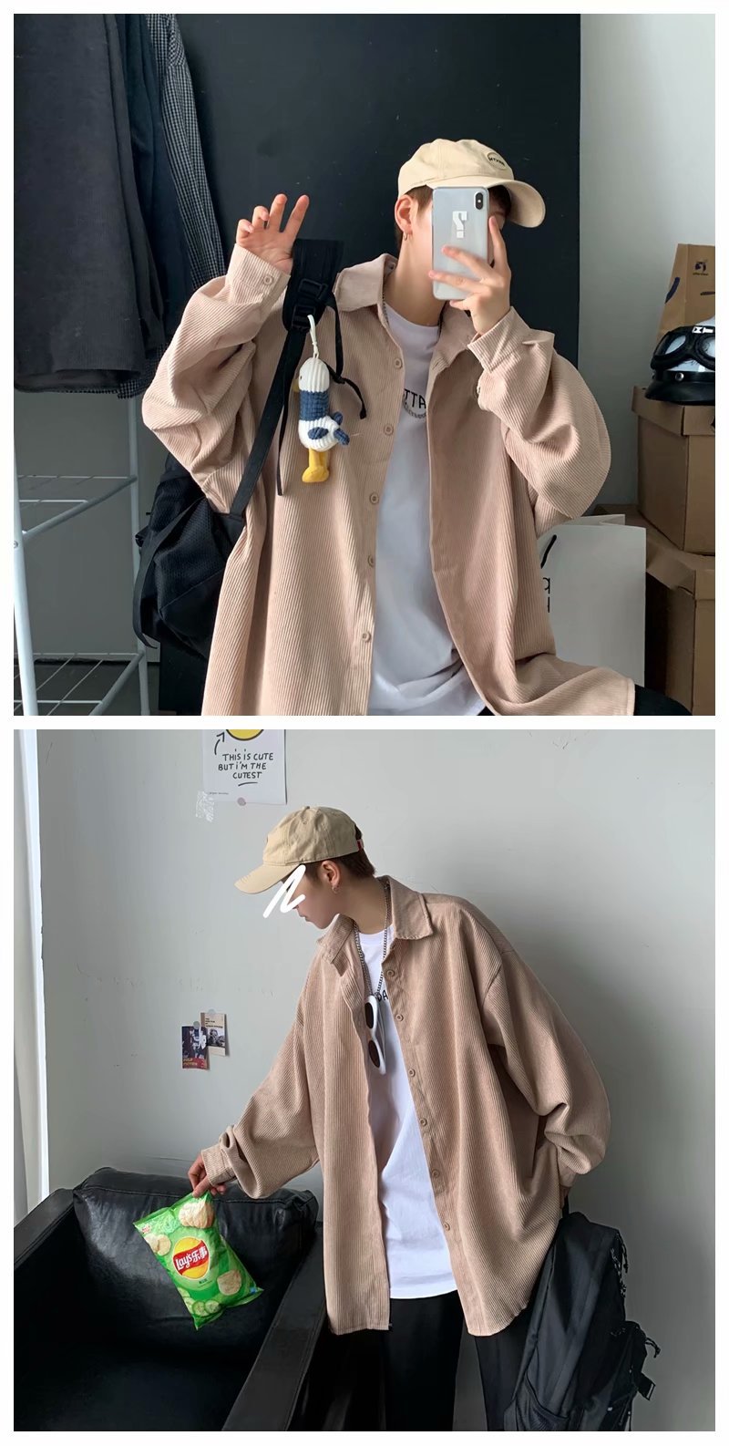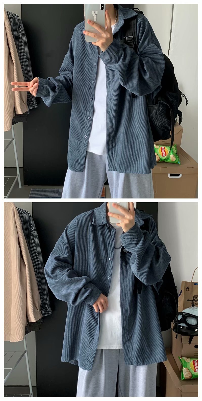 코듀로이 재킷 남성 긴팔 트렌디 그레이 봄, 가을 홍콩 스타일 셔츠 한국 스타일 인터넷 연예인 잘 생긴 셔츠 복고풍 루즈스토어 가기