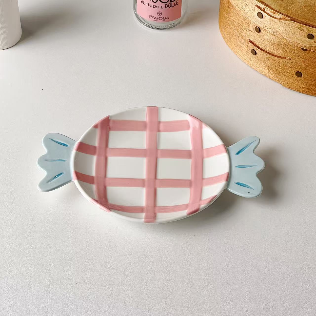 Ins 컬러 격자 무늬 캔디 세라믹 접시 소녀 하트 과일 접시 디저트 스낵 접시 크리 에이 티브 아침 식사 접시 쥬얼리 접시