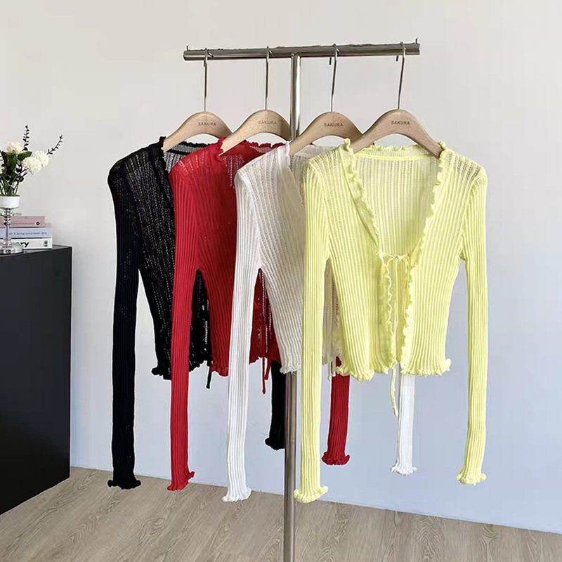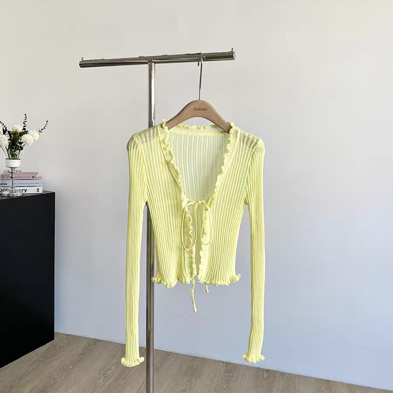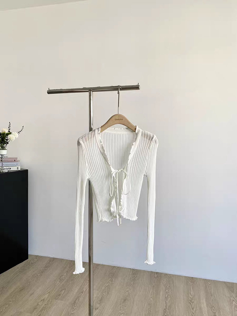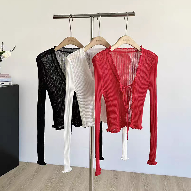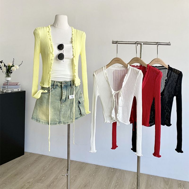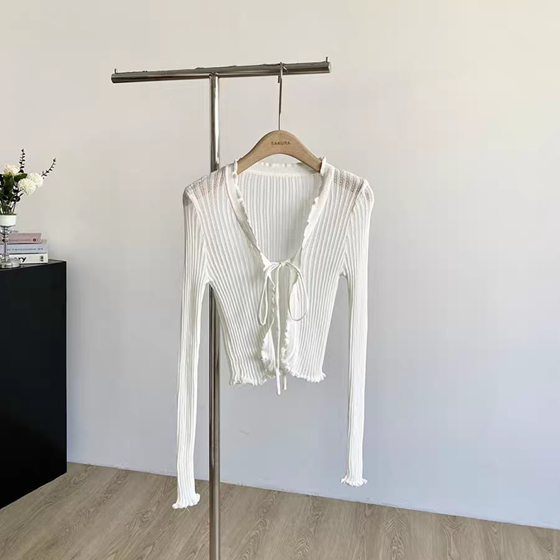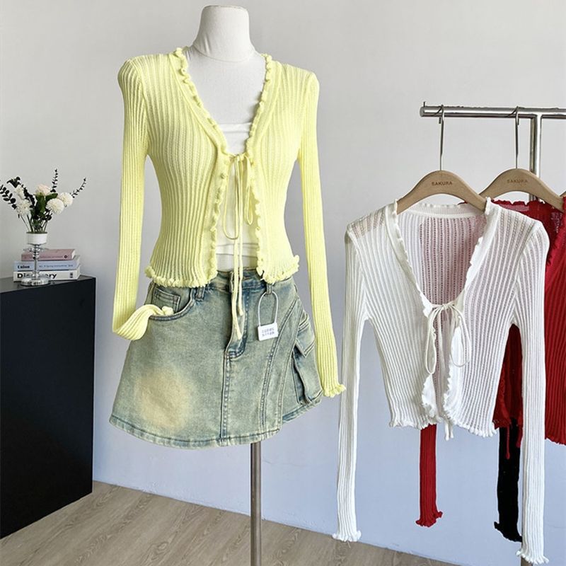 얇은 에어컨 서스펜더 스커트 자외선 차단 숄 짧은 블라우스 브이넥 디자인 틈새 나무 귓불 니트 가디건 여성용