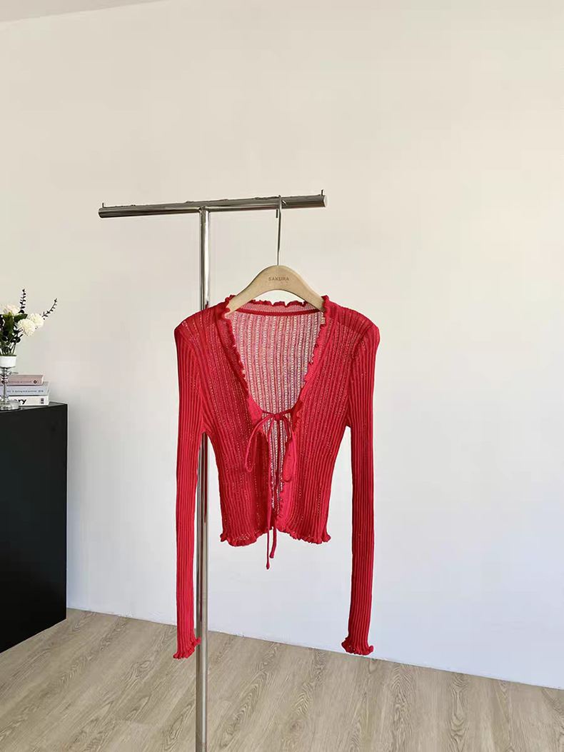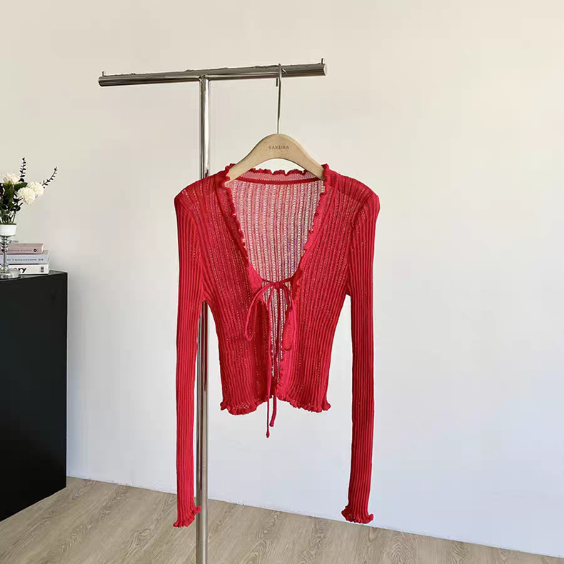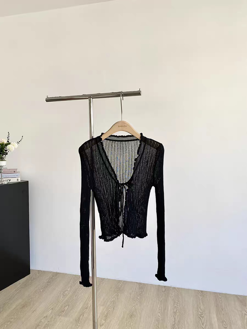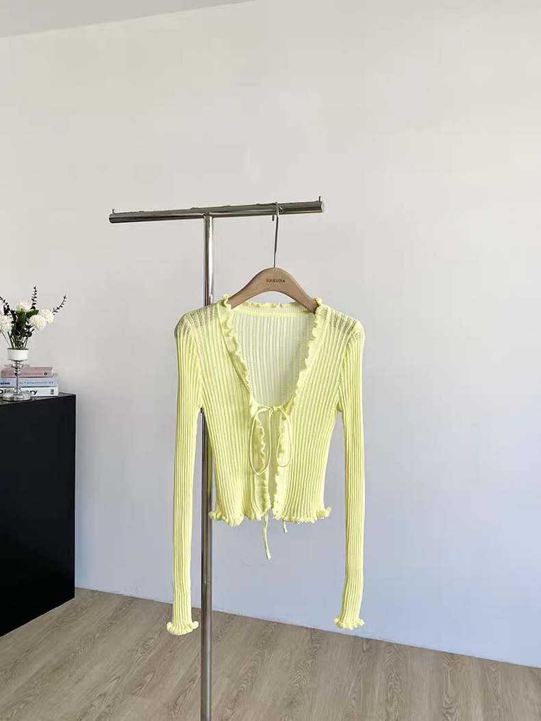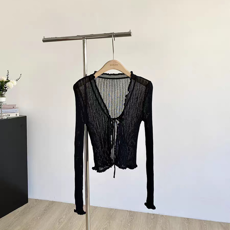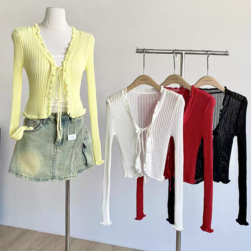 얇은 에어컨 서스펜더 스커트 자외선 차단 숄 짧은 블라우스 브이넥 디자인 틈새 나무 귓불 니트 가디건 여성용