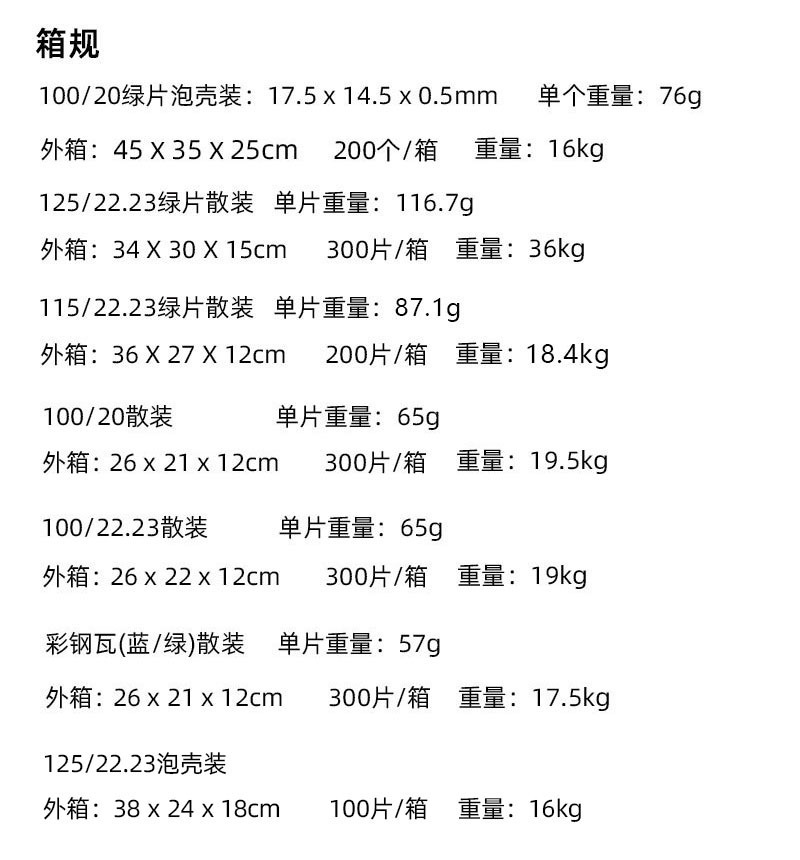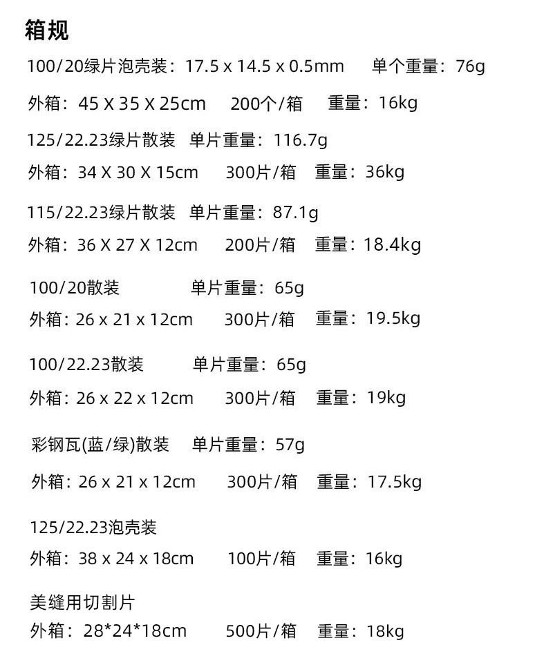 • 녹색 외경 125mm, 구멍 직경 22.23mm, 모래 폭 15mm (116g)