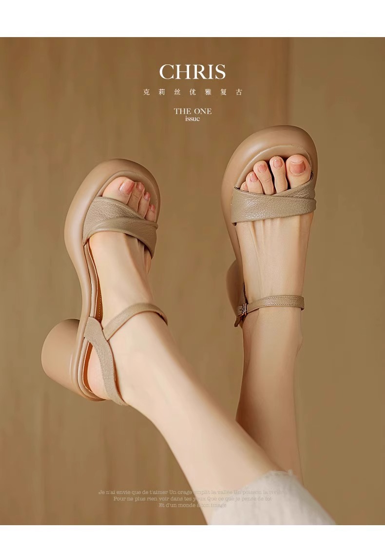 정품 가죽 두꺼운 하이힐 샌들 여성의 2025 년 새로운 여름 원피스 피곤하지 않은 발 두꺼운 여름 로마 샌들스토어 가기