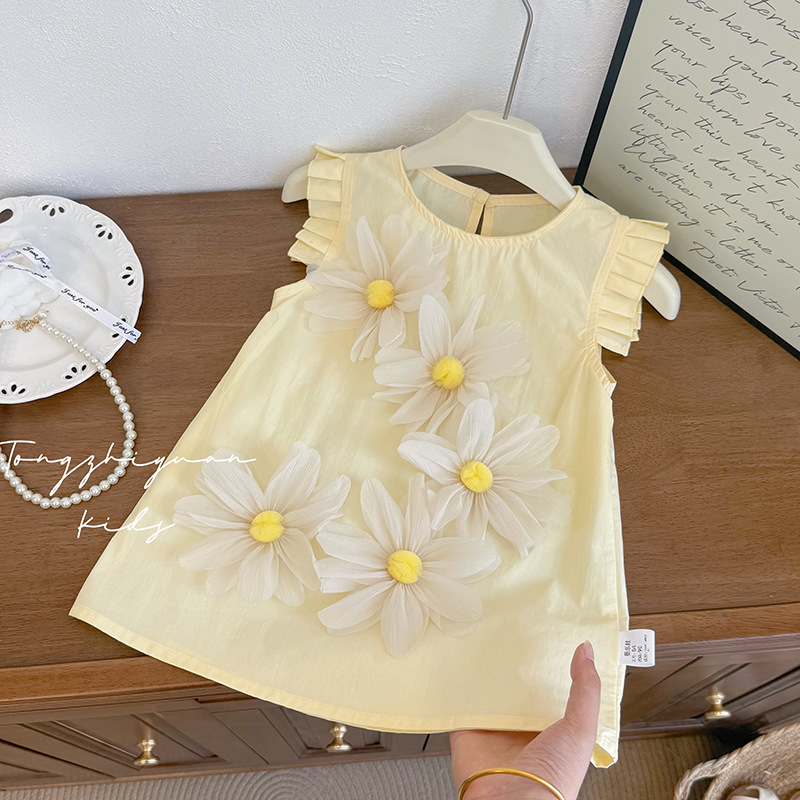 여자 여름 새로운 노란색 입체 꽃 조끼 드레스 아기 소녀 캐주얼 패션 외국 스타일 품질 아동 의류 유행 브랜드스토어 가기