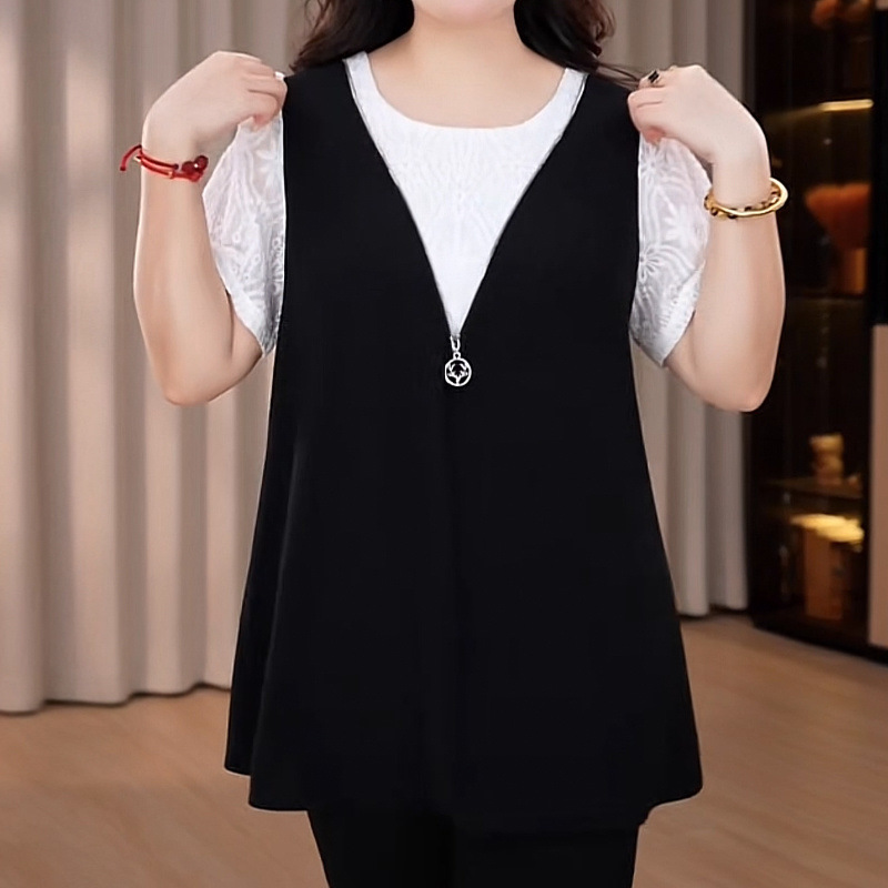 플러스 사이즈 여성 패션 대비 색상 스플 라이스 라운드 넥 셔츠 2025 여름 새로운 스타일 중년 어머니 느슨한 살을 덮는 셔츠