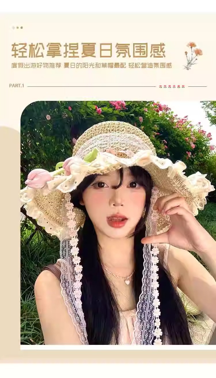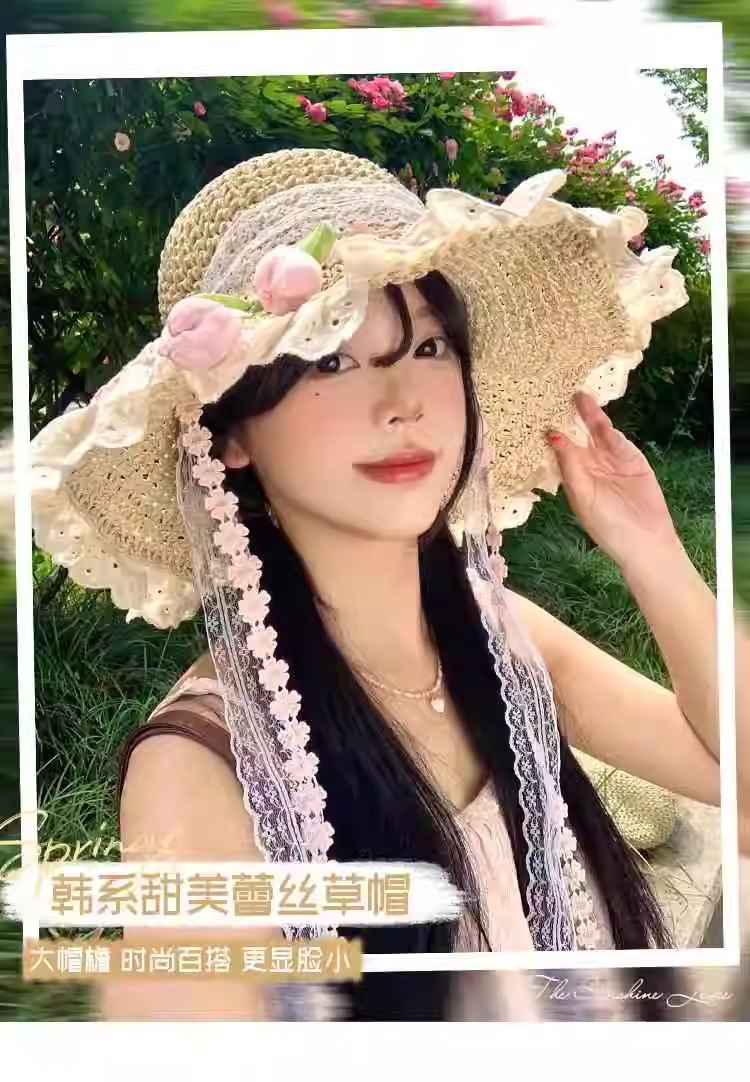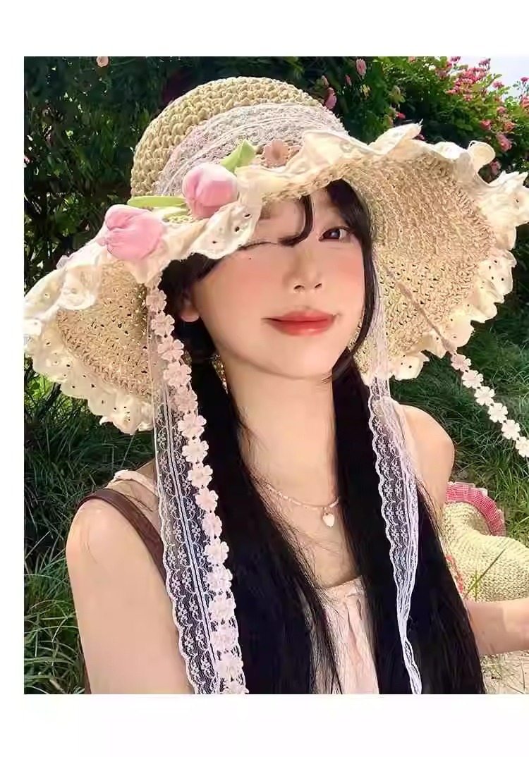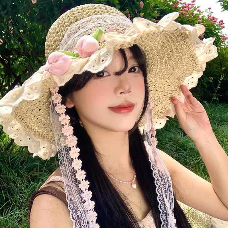 튤립 레이스 리본 밀짚 모자 여성의 여름 빅 브림 선스크린 모자 해변 휴일 태양 모자스토어 가기