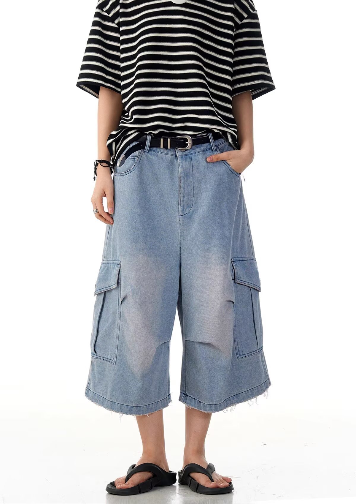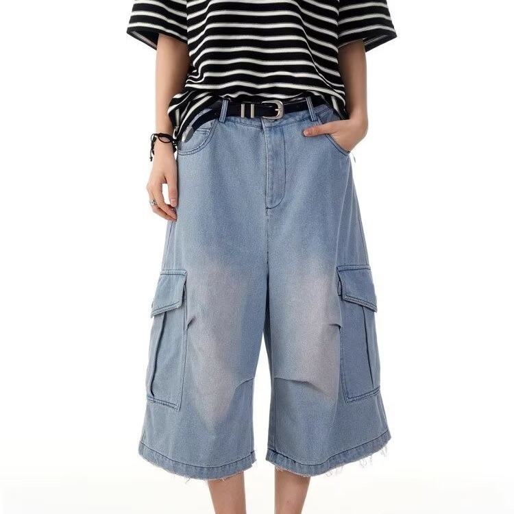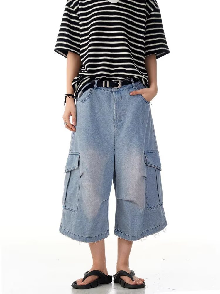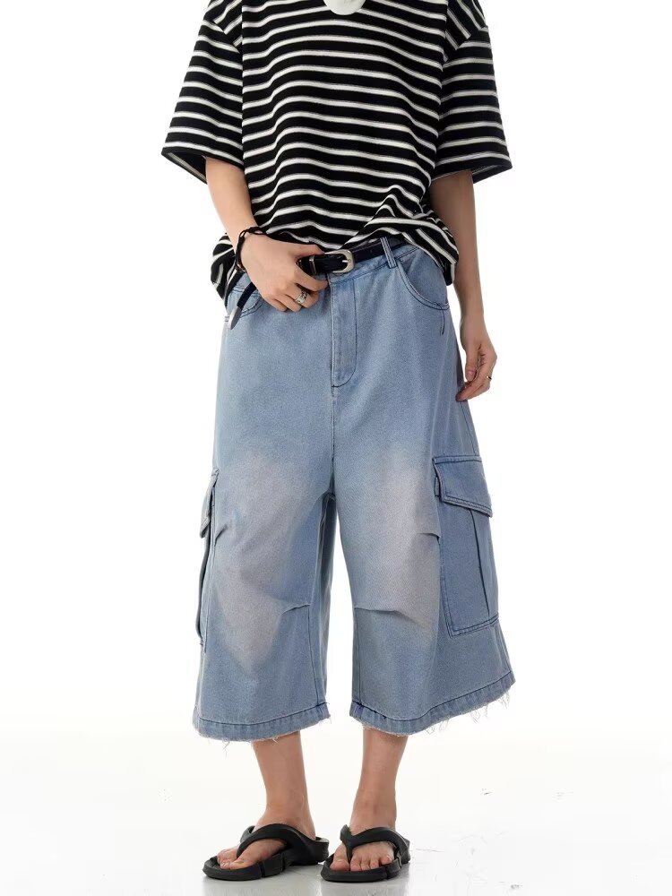 크로스보더 신상 레트로 워싱 디스트레스드 플리츠 데님 크롭 팬츠 남성 여름 트렌디 멀티 포켓 루즈 와이드 팬츠스토어 가기