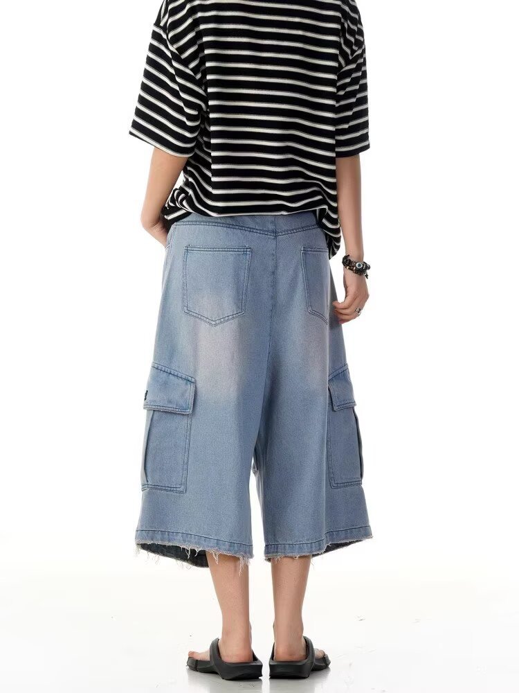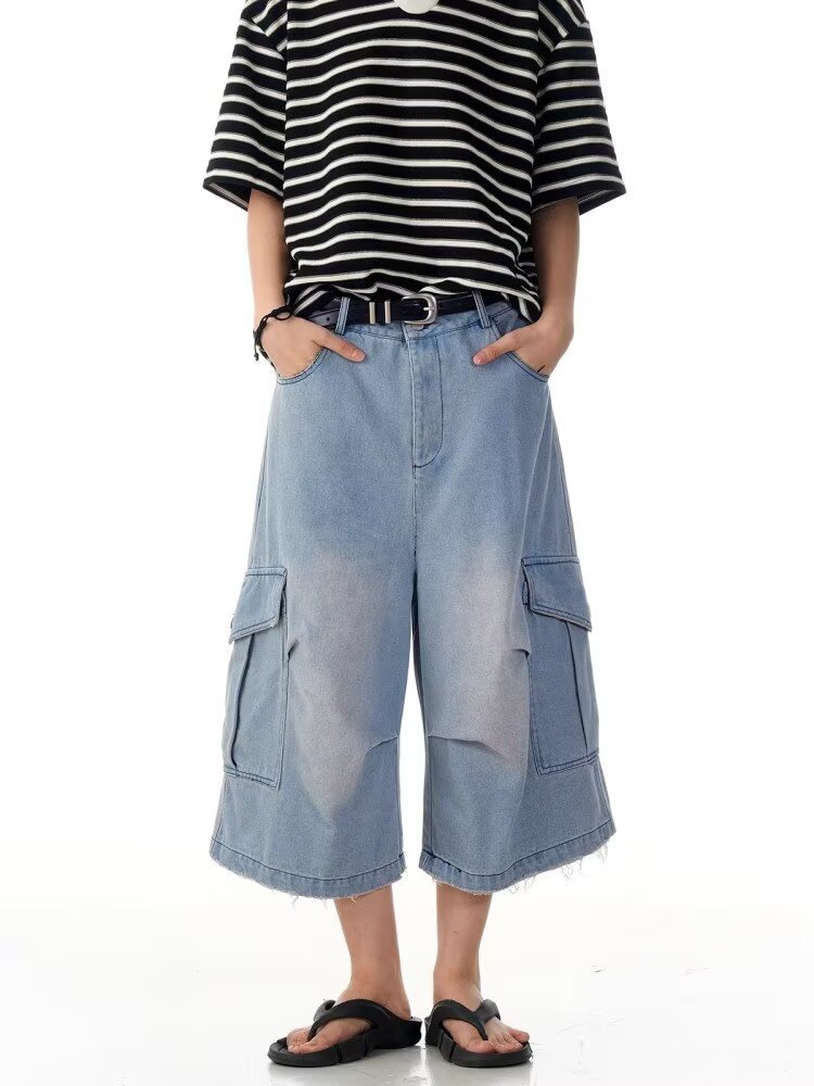 크로스보더 신상 레트로 워싱 디스트레스드 플리츠 데님 크롭 팬츠 남성 여름 트렌디 멀티 포켓 루즈 와이드 팬츠