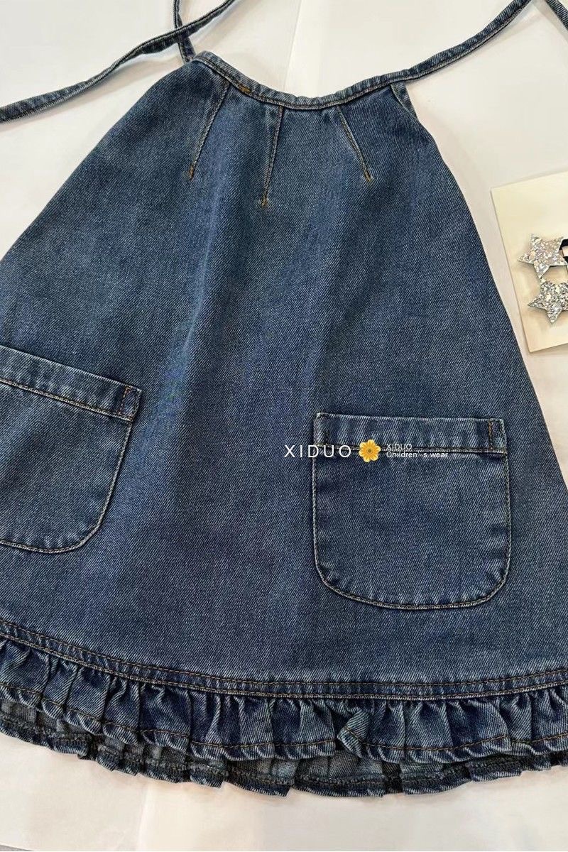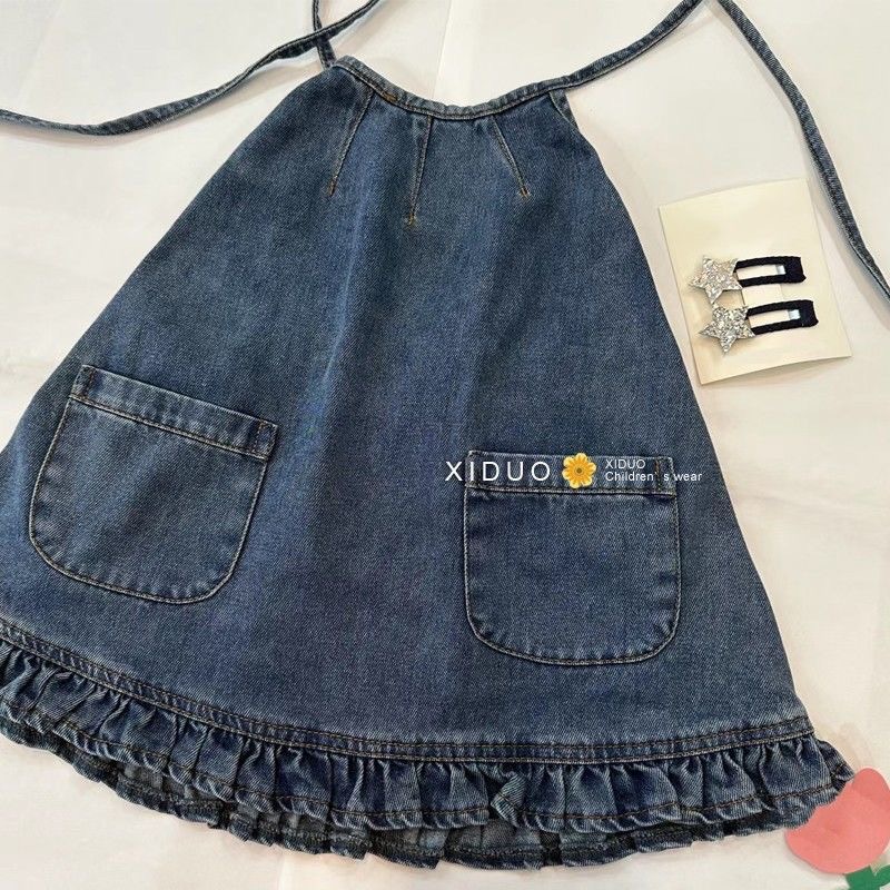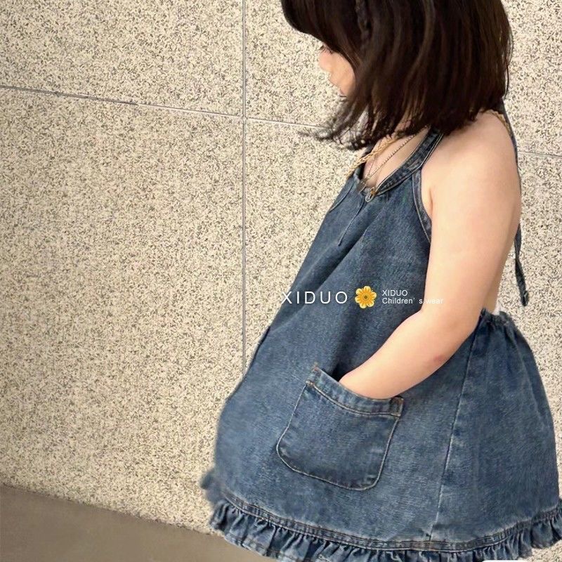 한국 스타일 아동복 소녀 데님 드레스 2025 여름 새로운 스타일 유행 레이스 끈 홀터넥 서스펜더 스커트스토어 가기
