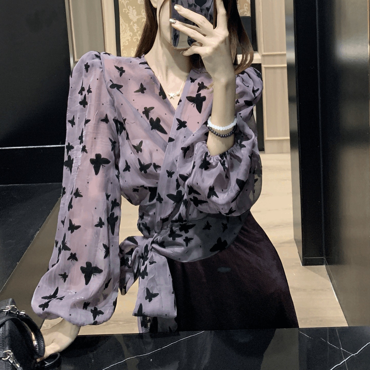 여성을위한 디자인 보라색 프린트 스트랩 긴팔 탑 2025 여름 패션 정장 하이 웨이스트 스커트 투피스 세트스토어 가기