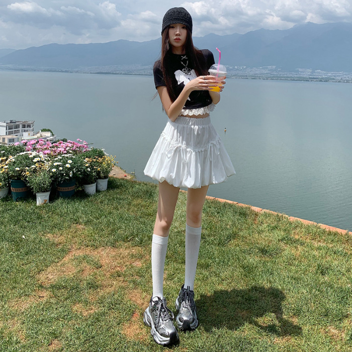 인터넷 연예인 같은 스타일 레이스 랜턴 스커트 여성 캐주얼 짧은 스커트 모조 노출 울트라 짧은 스커트 화이트 블랙스토어 가기