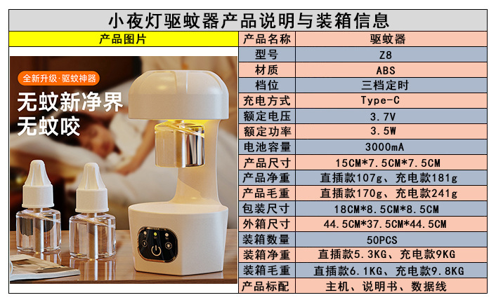 모기장 가정용 실내 밤 빛 모기 구충제 전기 향 모기 킬러 야외 캠핑 USB 충전식 모기 킬러